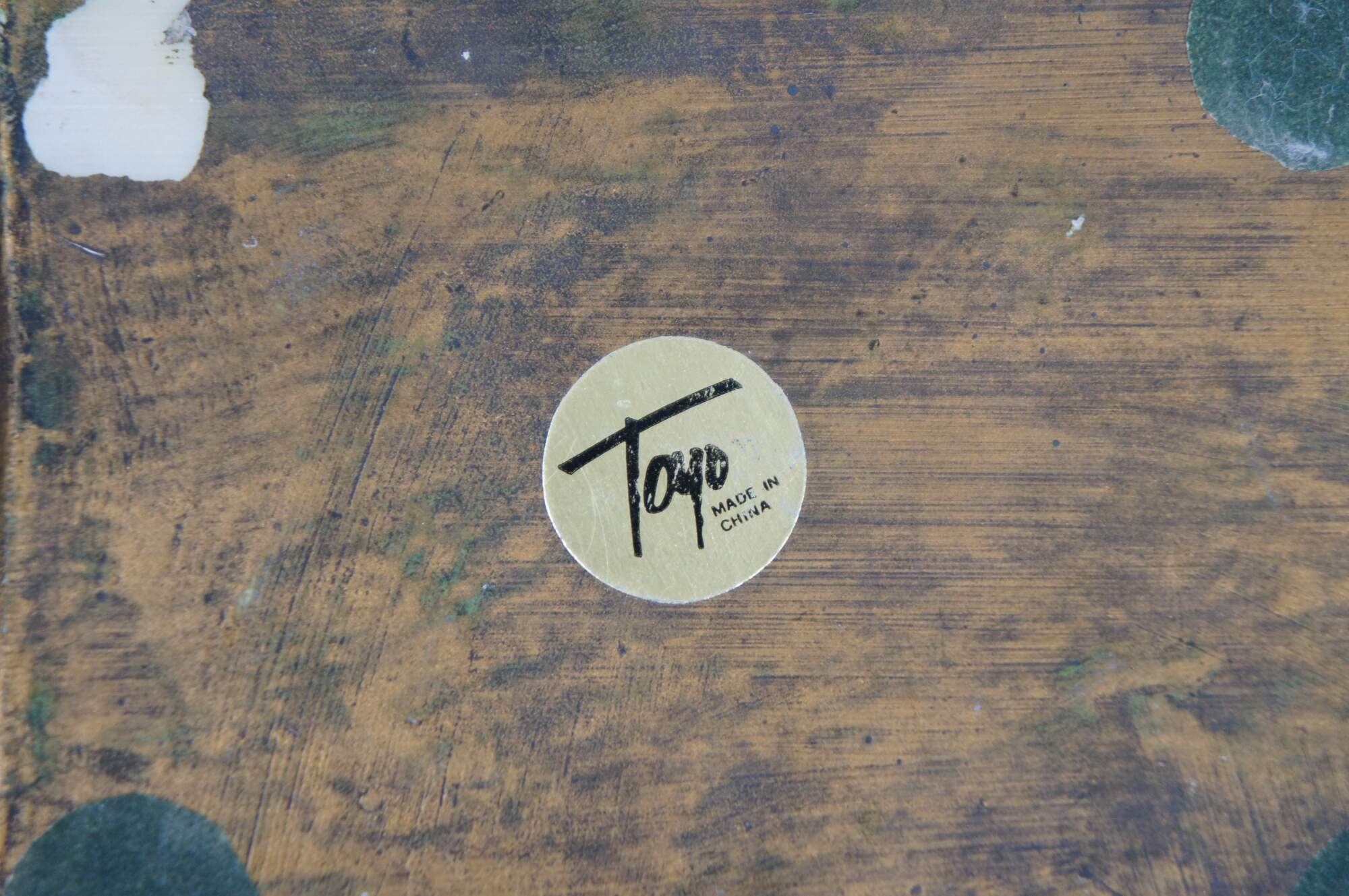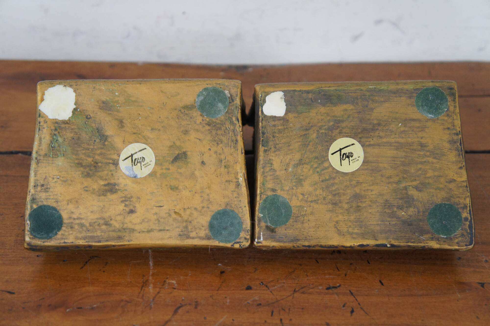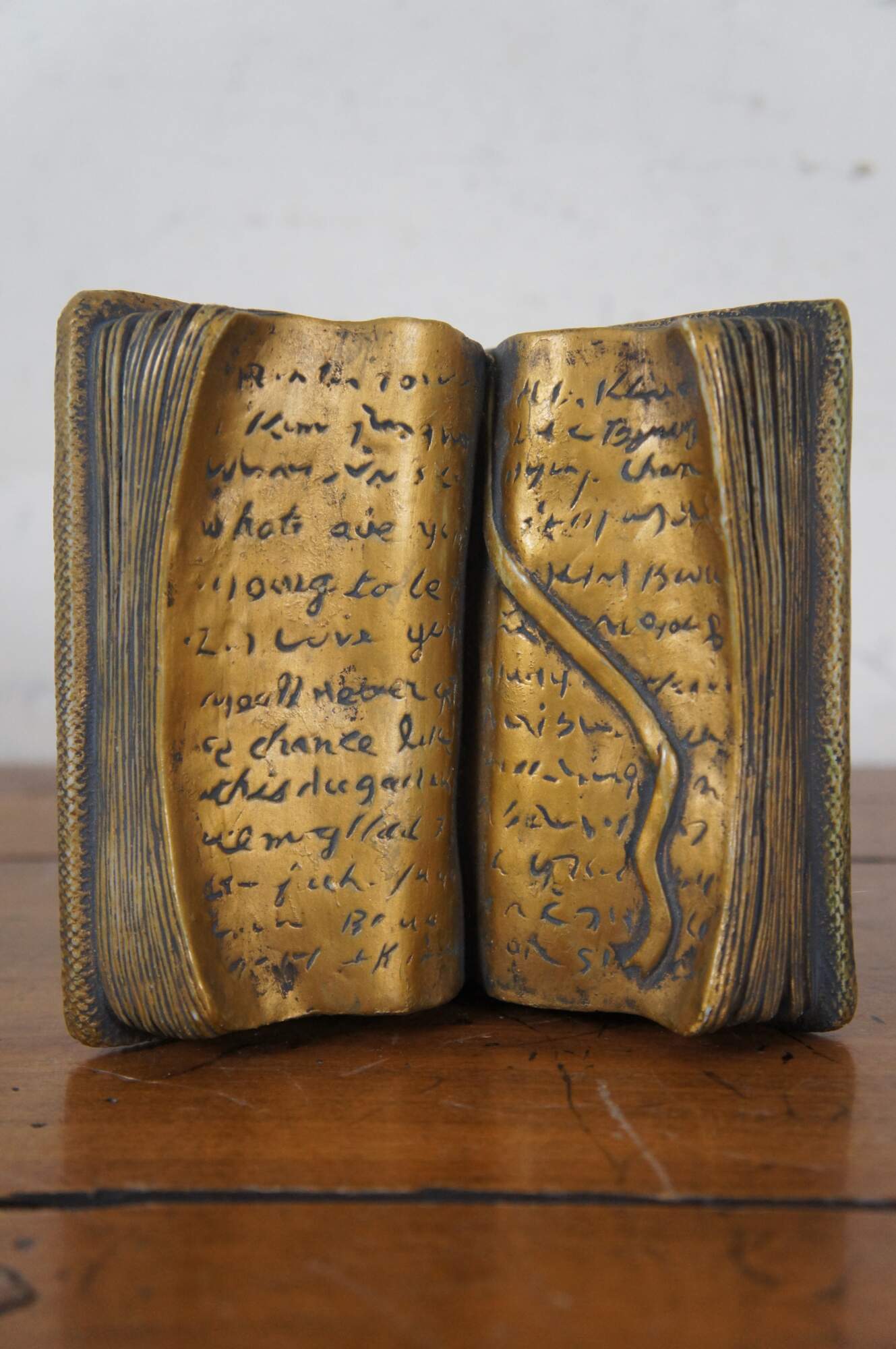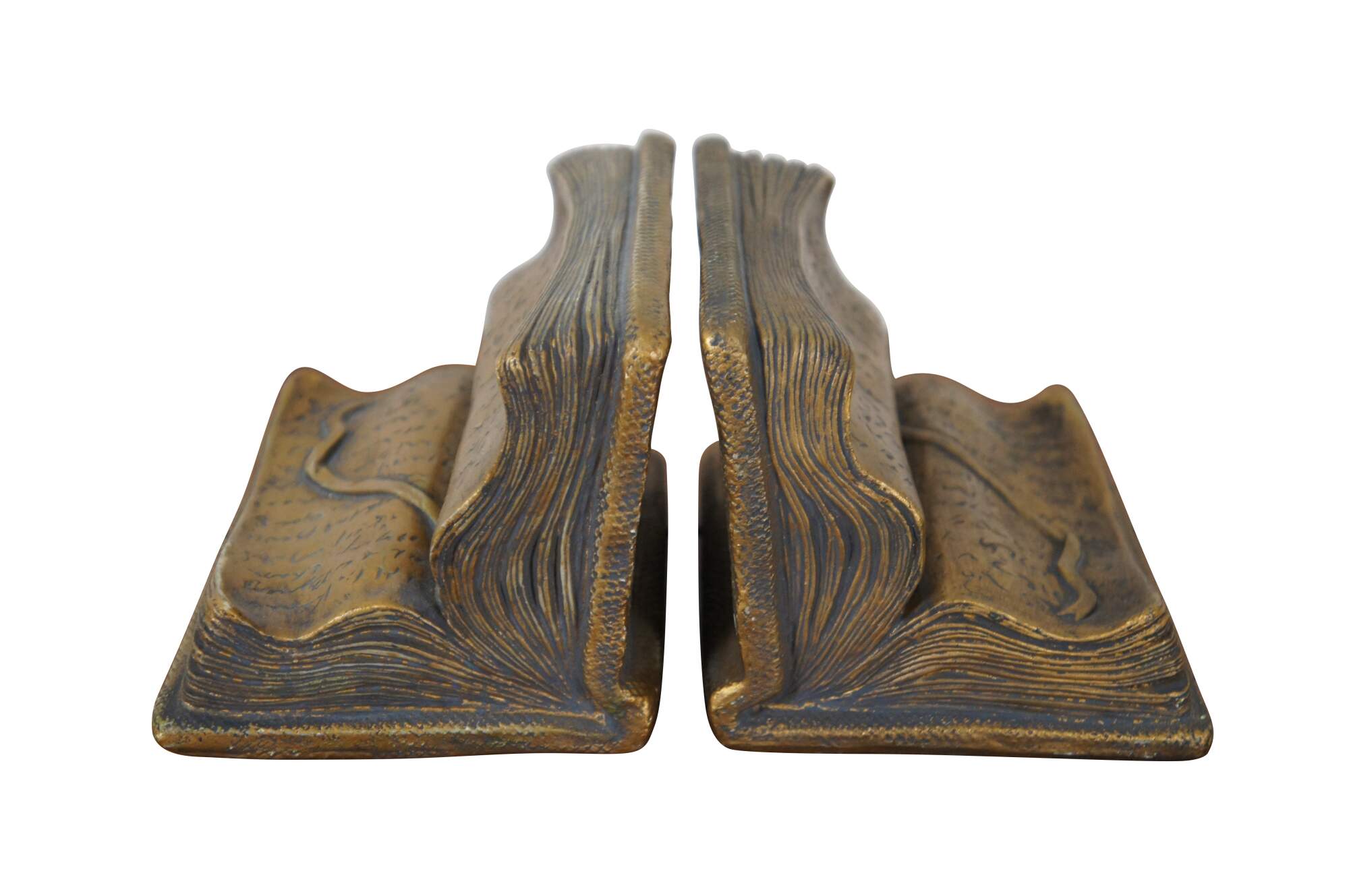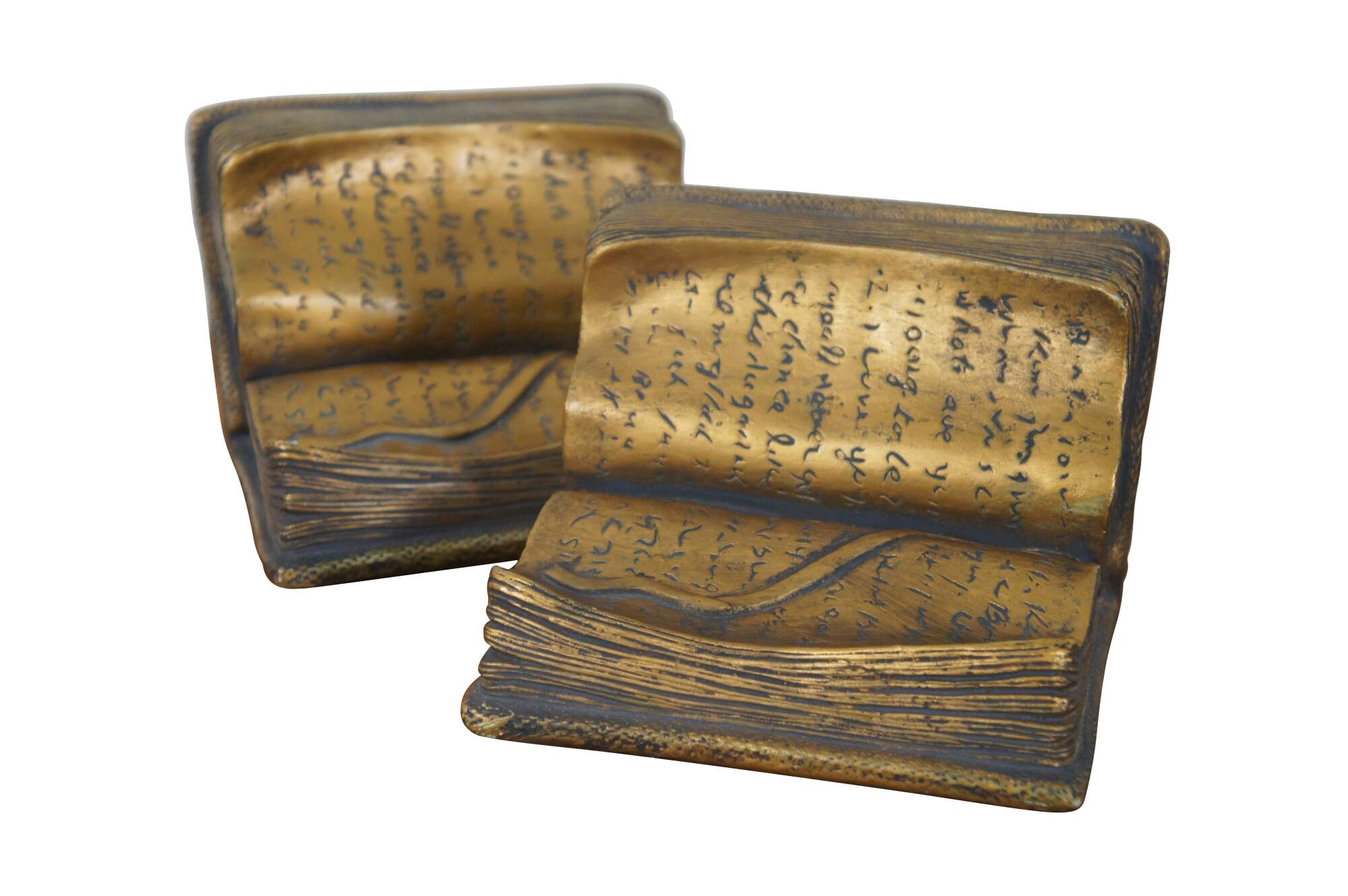 Vintage mid to late 20th century pair of bookends by Toyo; crafted of resin with a gold painted finish in the shape of half open books with page marker ribbon. Made in China.