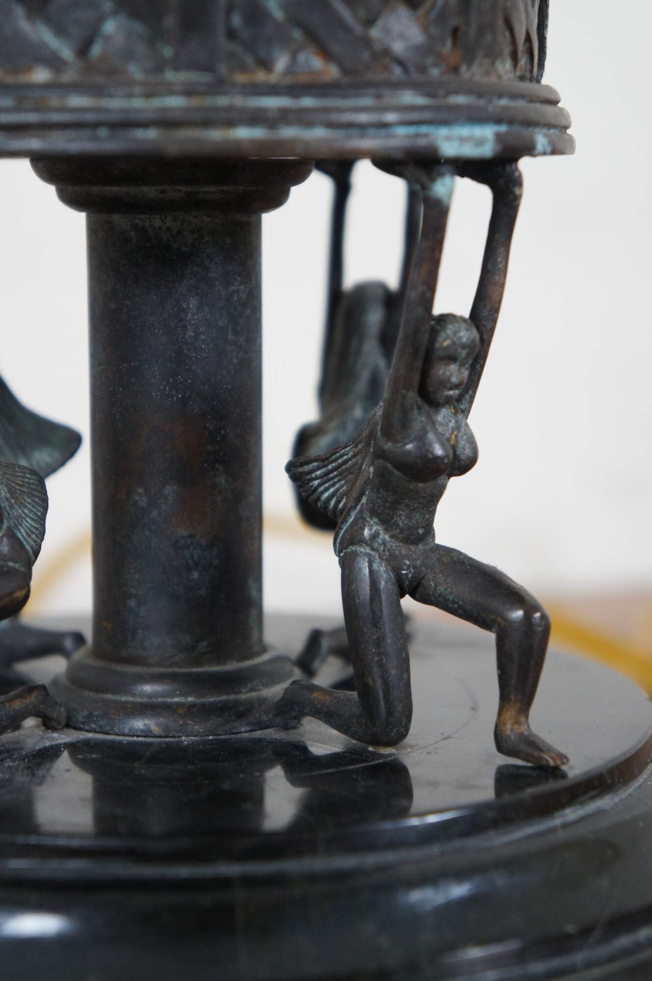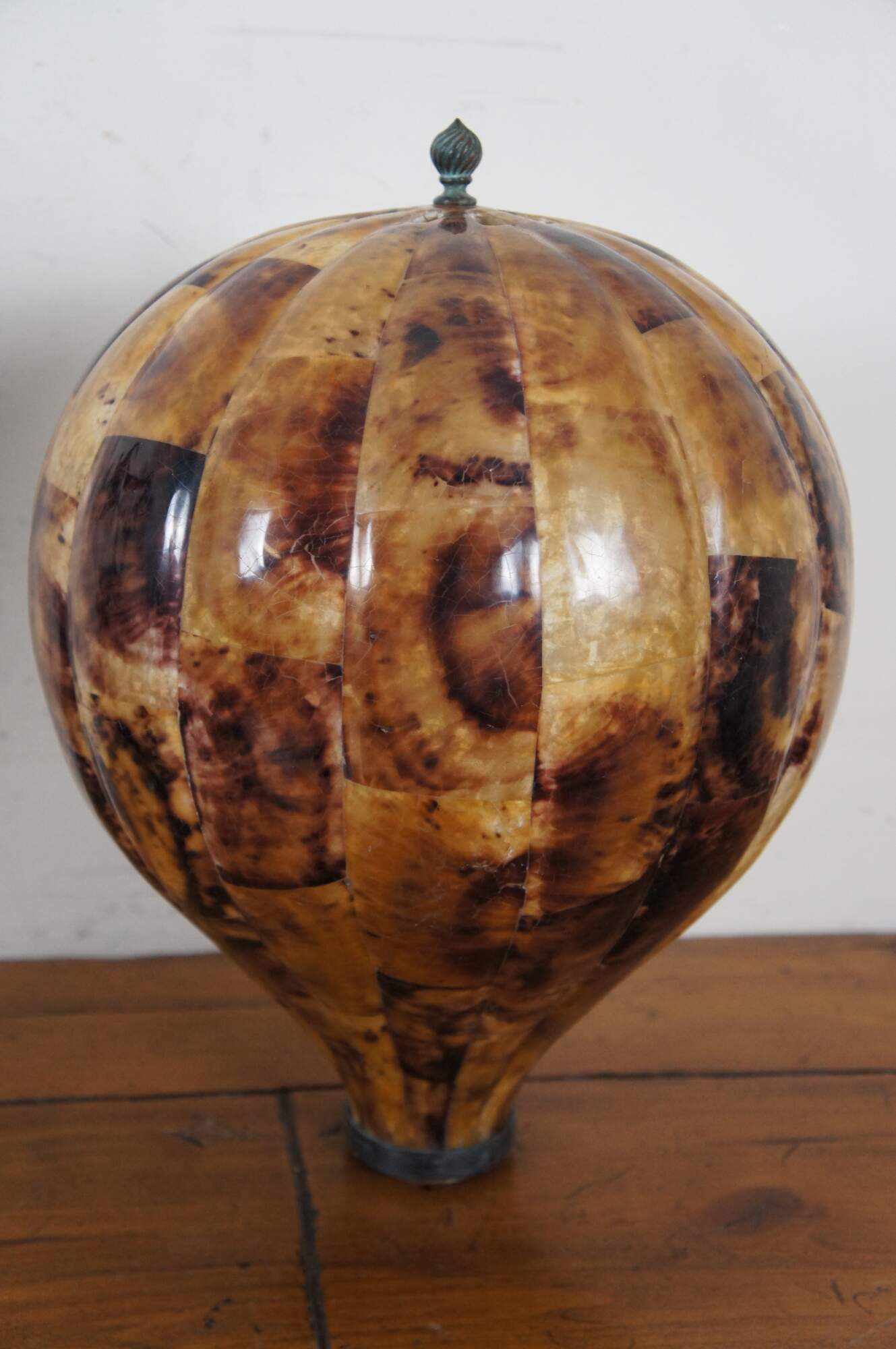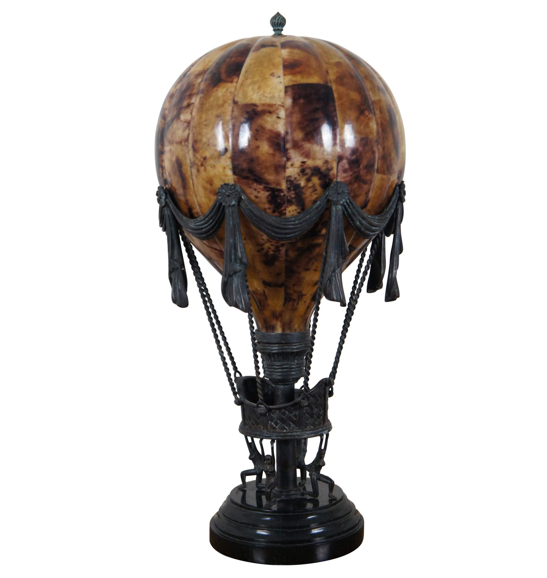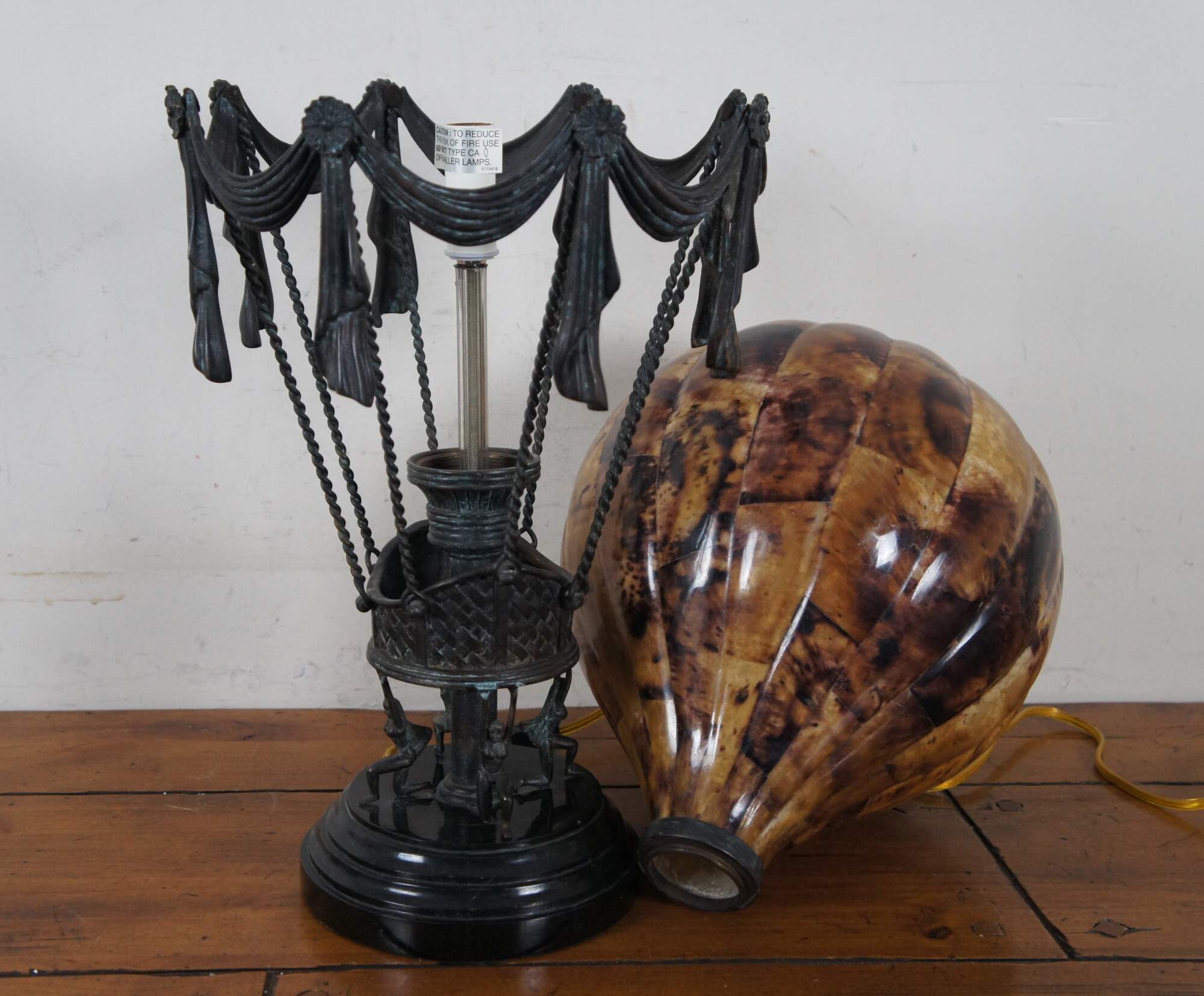 Vintage Maitland Smith table lamp with round black base supporting a bronze hot air balloon basket with taut ropes and trimmed with swags of cloth, raised by four kneeling female figures and a resin / tessellated pen shell balloon shaped shade.