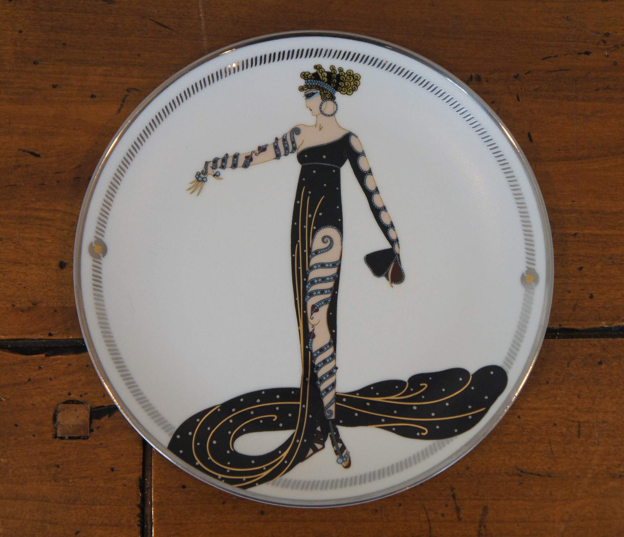 Set of three vintage Limited Edition House of Erte fine porcelain decorative plates. Trio includes: Glamour, Plate No. HD 3203; Symphony in Black, Plate No. G1230, dated 1993; and La Merveilleuse, Plate No. HG 8726. Copyright Sevenarts Ltd. Produced by The Franklin Mint. A decorative accessory. Not to be used for food consumption. Pigments used for color may be toxic.