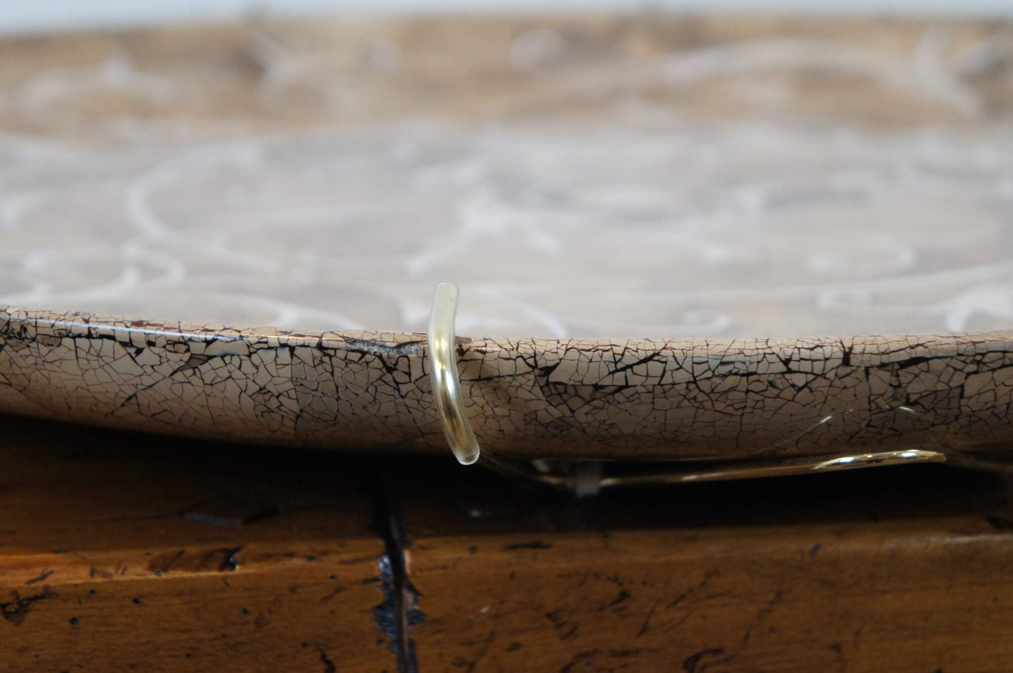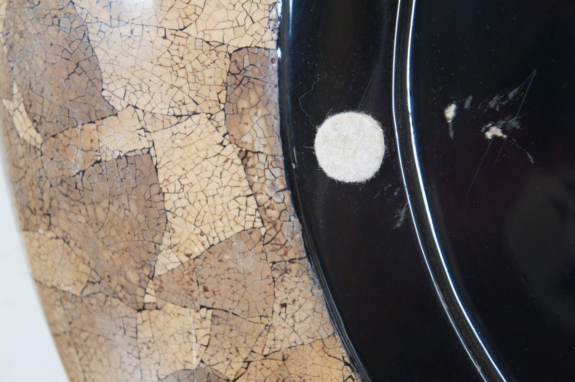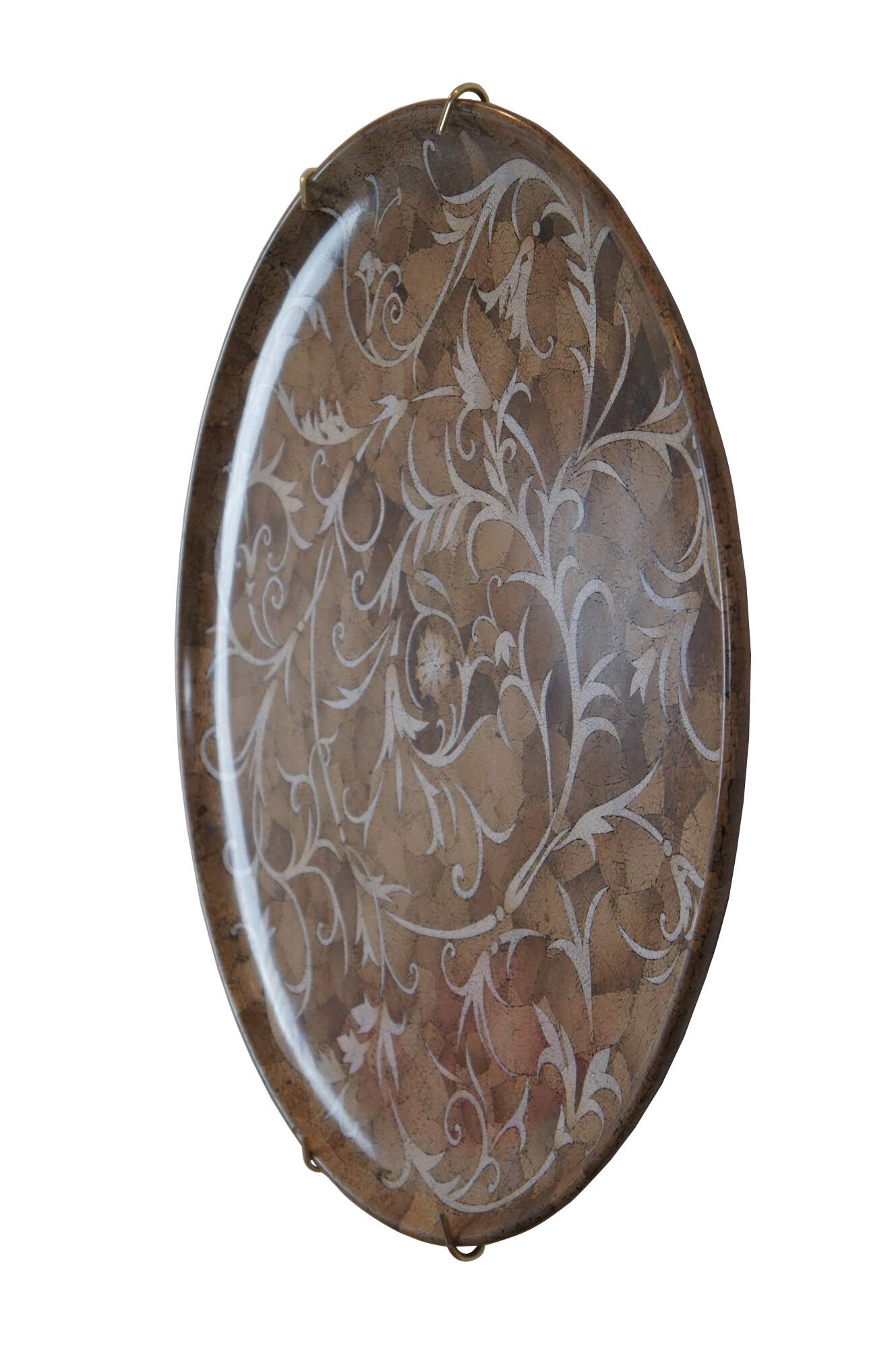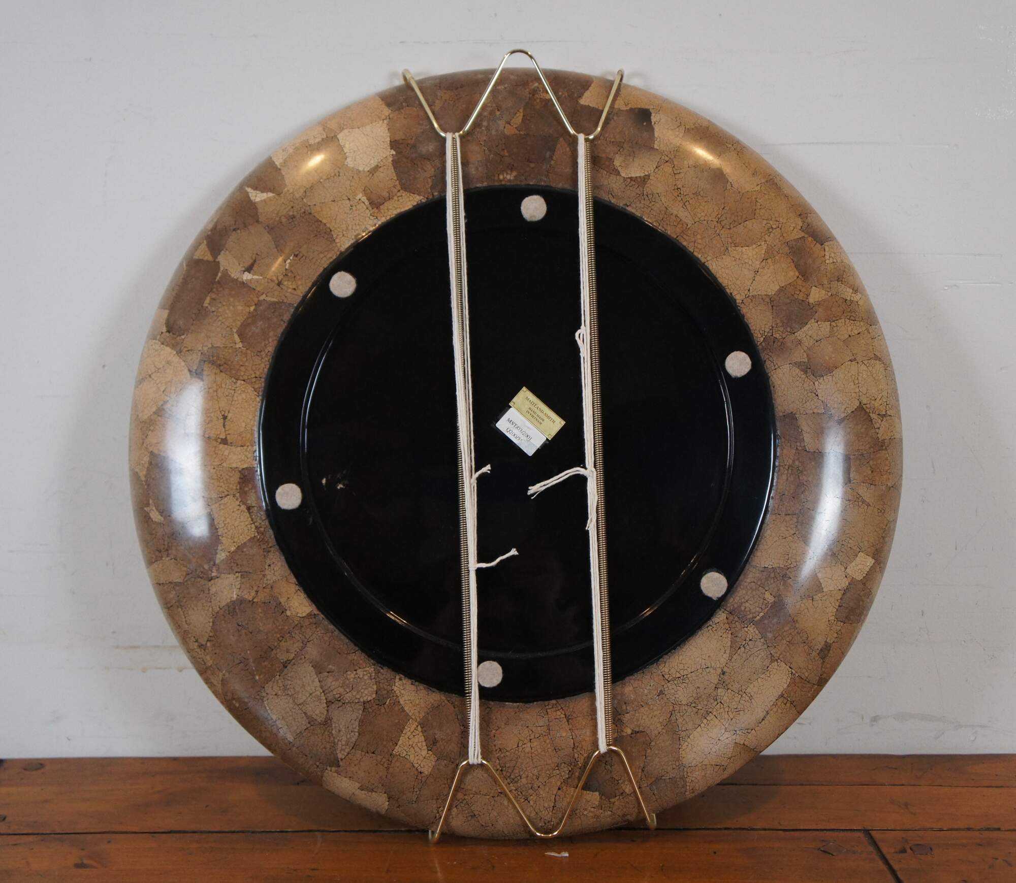 A rare Maitland Smith over sized round Charger / platter / tray featuring a lacquered floral mosaic pattern in shades of brown and white. Includes support for wall hanging.