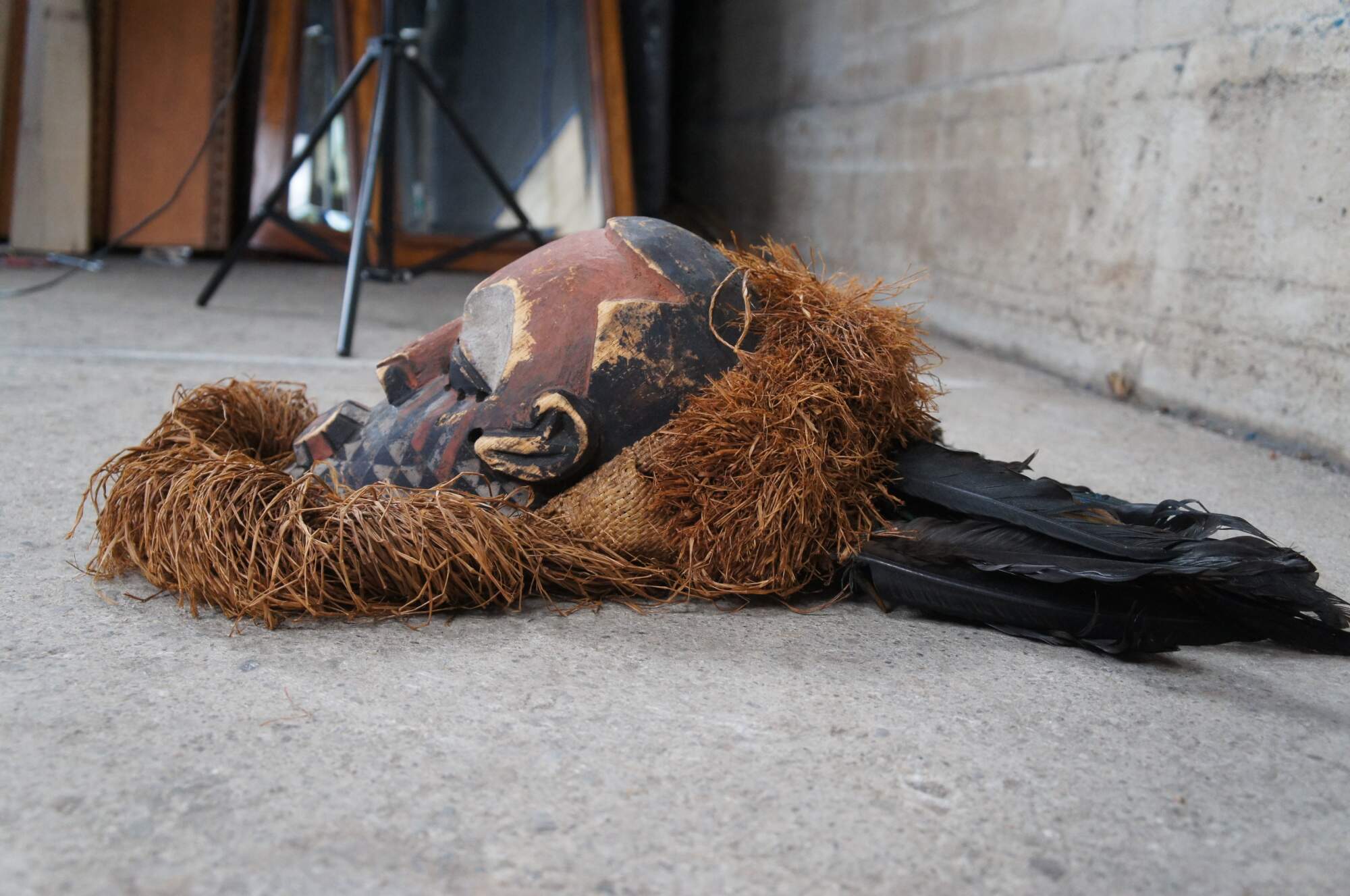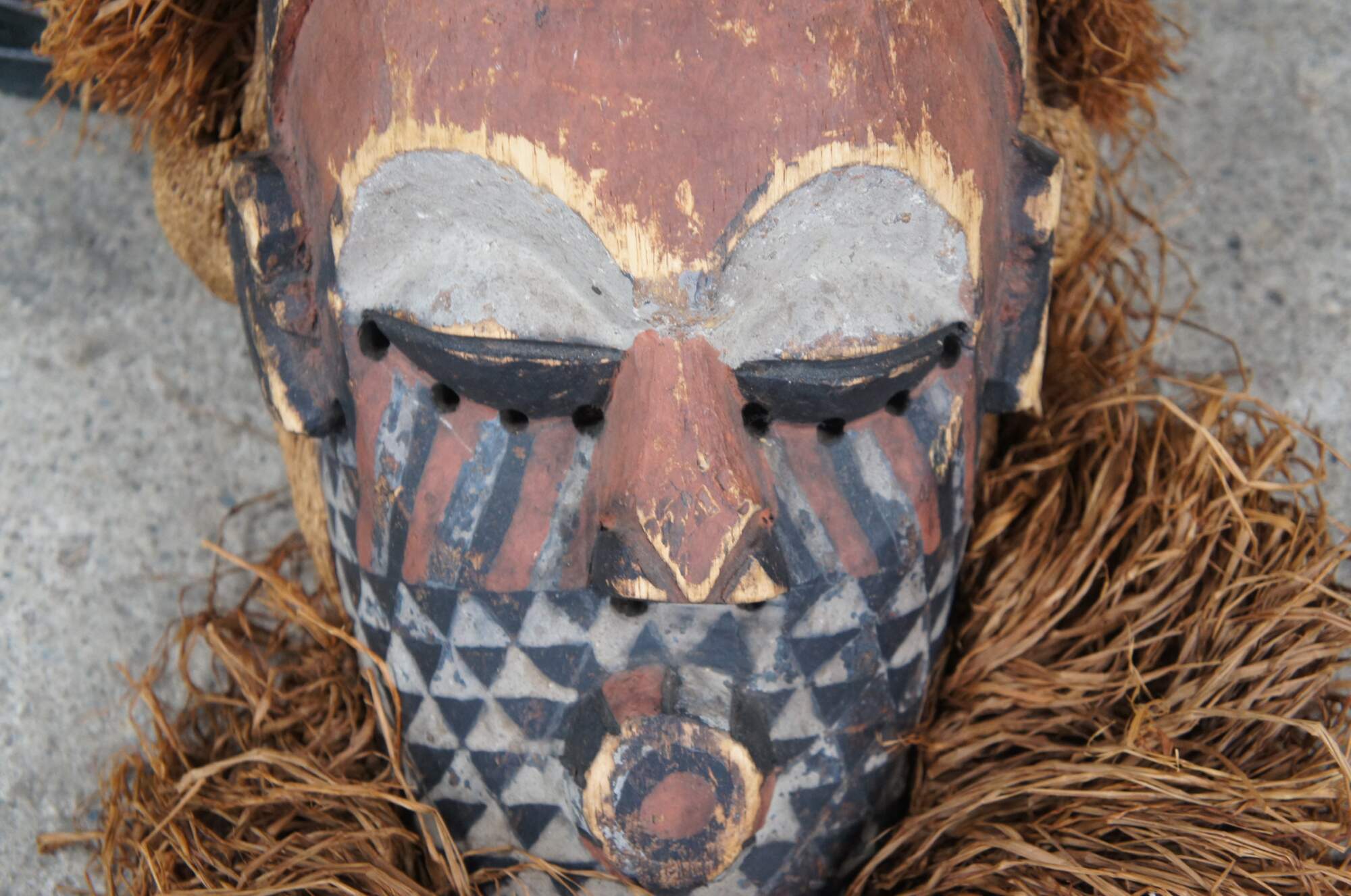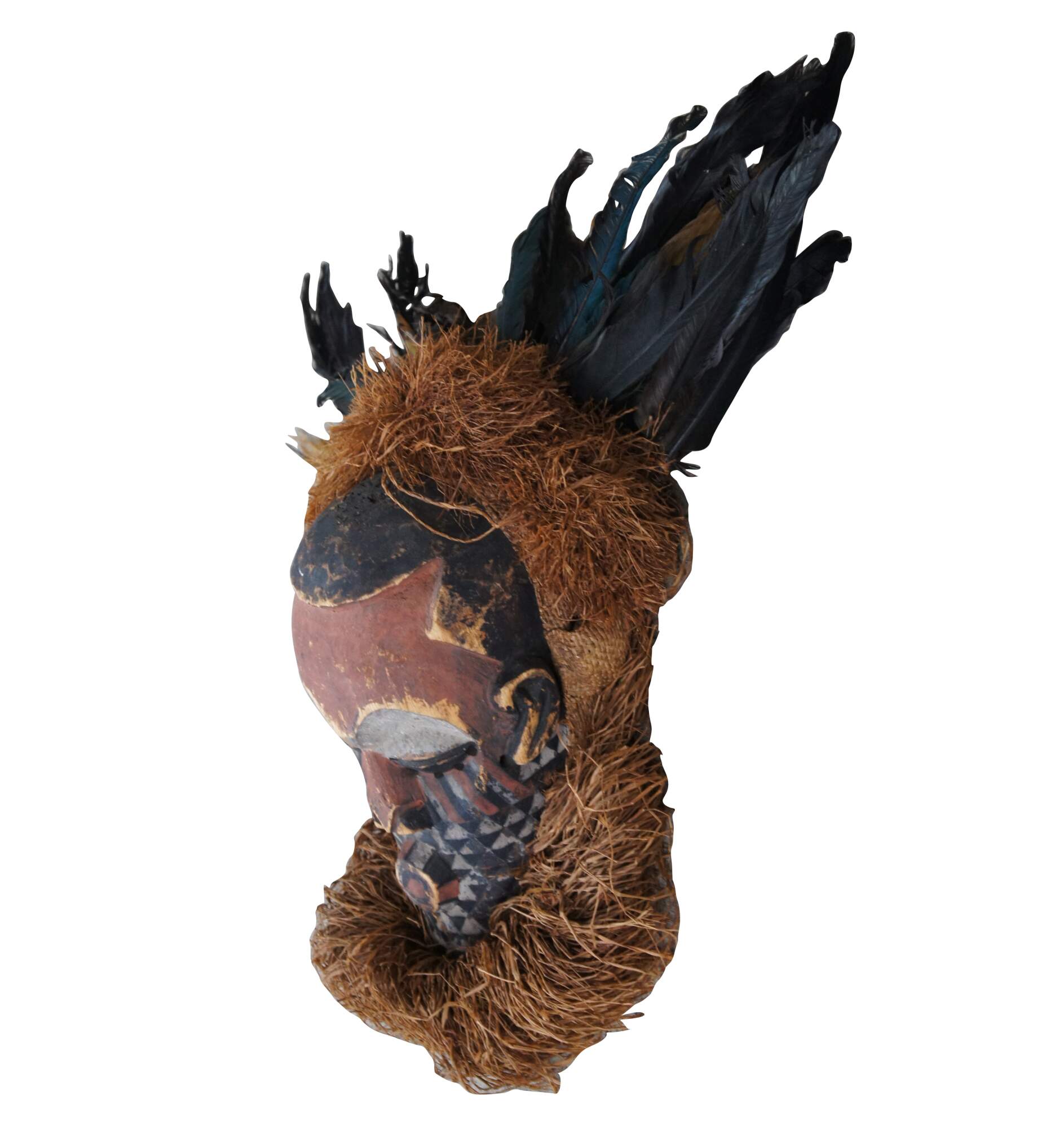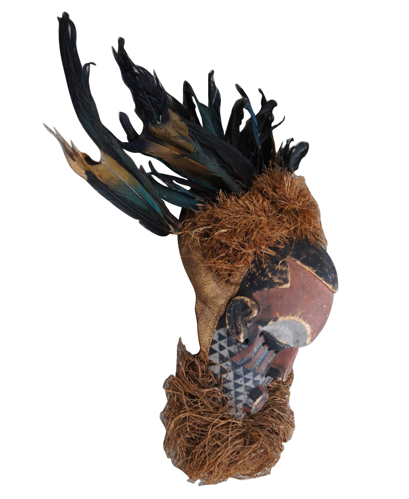 The Kuba Kingdom, also known as the Kingdom of the Bakuba or Bushongo, is a traditional kingdom in Central Africa. The Kuba Kingdom flourished between the 17th and 19th centuries in the region bordered by the Sankuru, Lulua, and Kasai rivers in the heart of the modern-day Democratic Republic of the Congo. This mask was used to declare the status and wealth of a masked personage at funerals of deceased initiated men (mubendi). Masked performances acknowledged the achievements of the deceased and their membership in the initiation society. Made from wood with decorative painting, feathers and straw