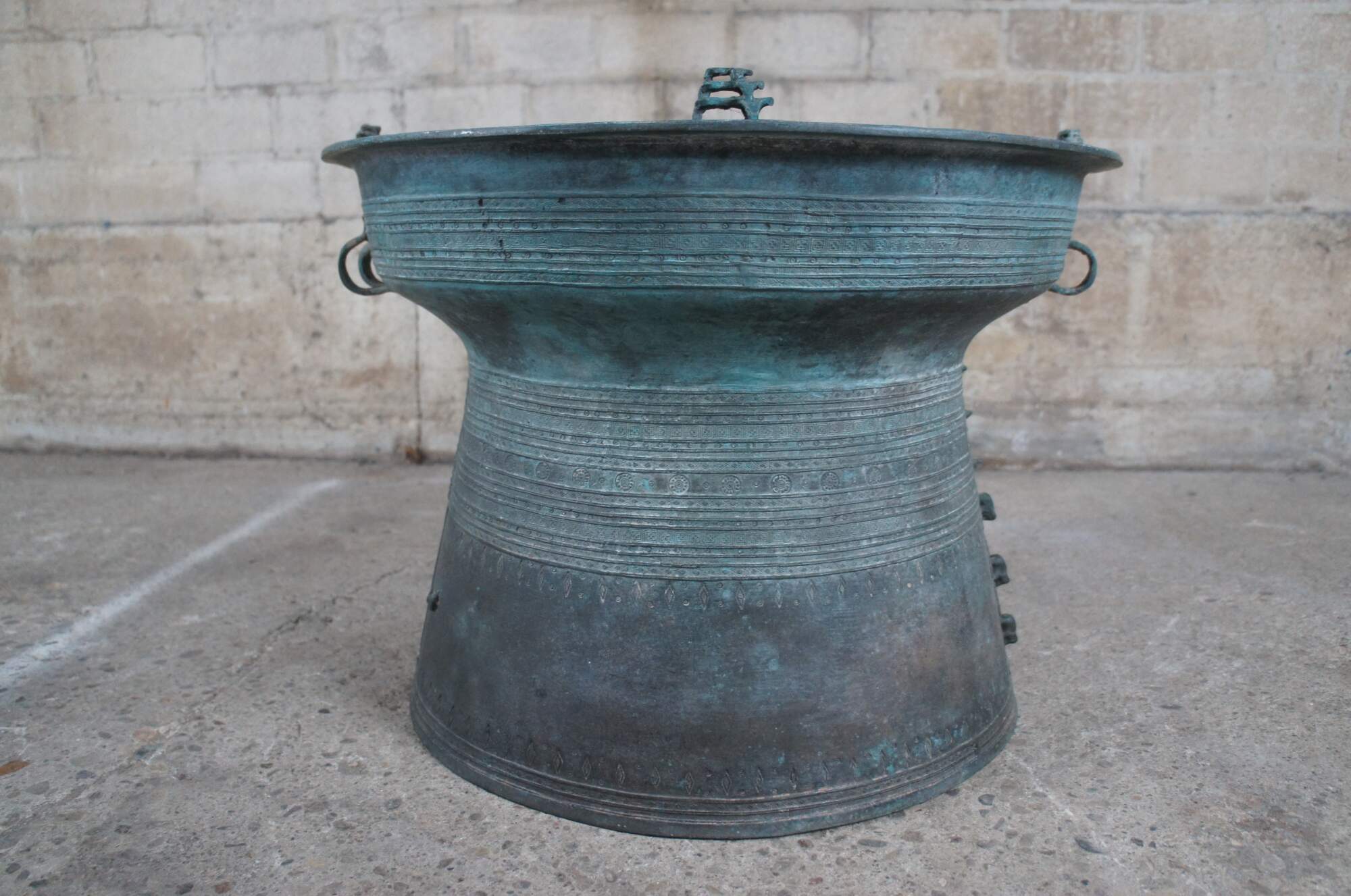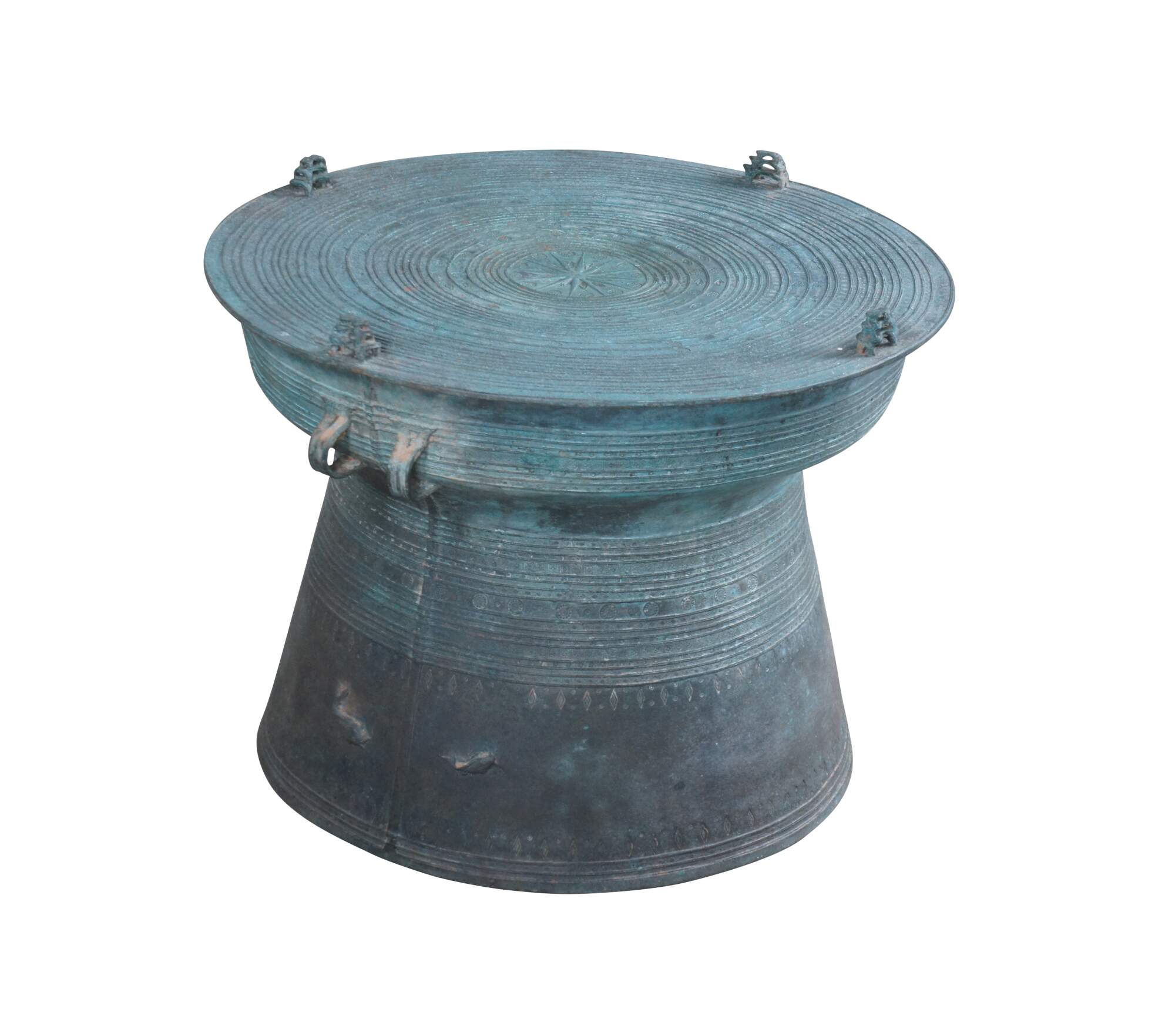 Long associated with water and rain, the drums were at one time used in boats to keep time for oarsmen and signal to other ships. In Southeast Asian ritual, rain drums were played to make music for spirits and communicate with ancestors. The intricate patterns on the tops of rain drums reference creatures associated with the rainy season. Toads and frogs, for example, are water creatures that symbolize the moon. Geometric motifs, such as eight-pointed stars or wheels with 12 spokes, are often inscribed on the drums to bring luck.