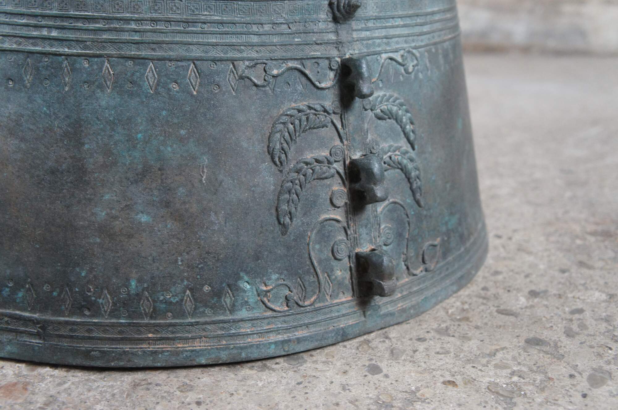 Rain Drums originated with the Dong Son culture in Southeast Asia, dating as far back as the mid-to-late Bronze Age (1,000–700 BC). Metal workers poured and set molten bronze in a cast, freed the hardened drums from their molds, then carved them with intricate motifs as the metal cooled. The art of sculpting bronze drums remains a refined skill, acquired over many years and passed on through apprenticeships.