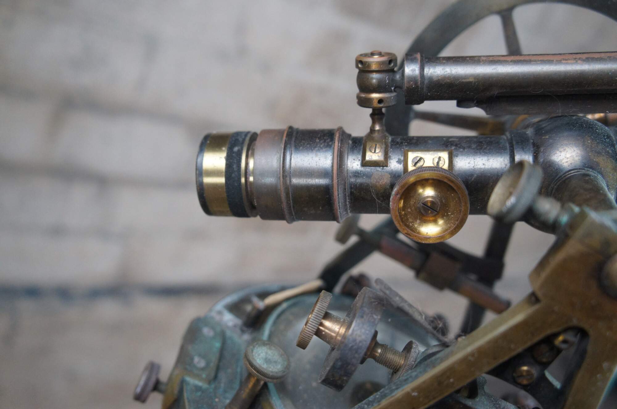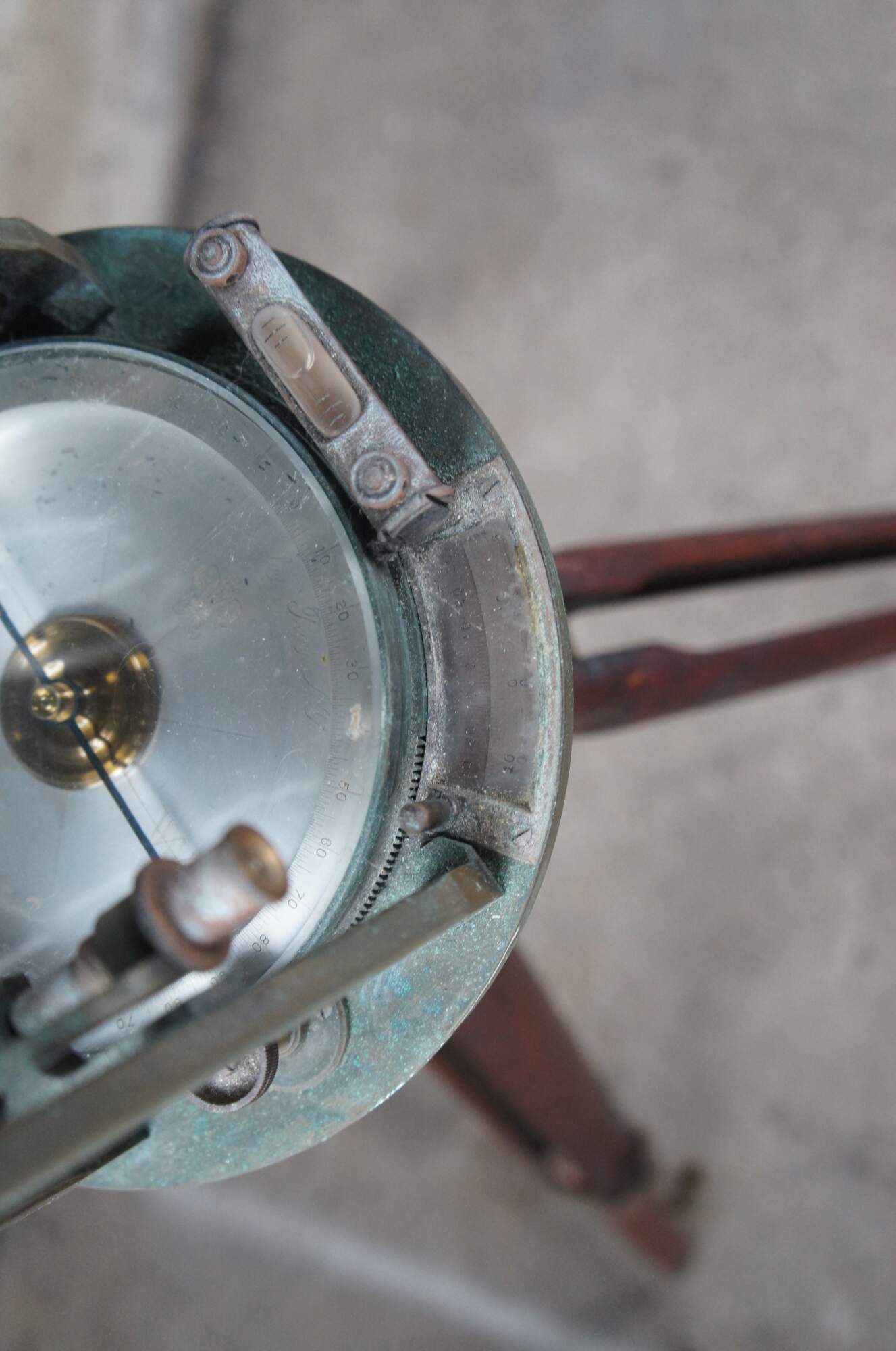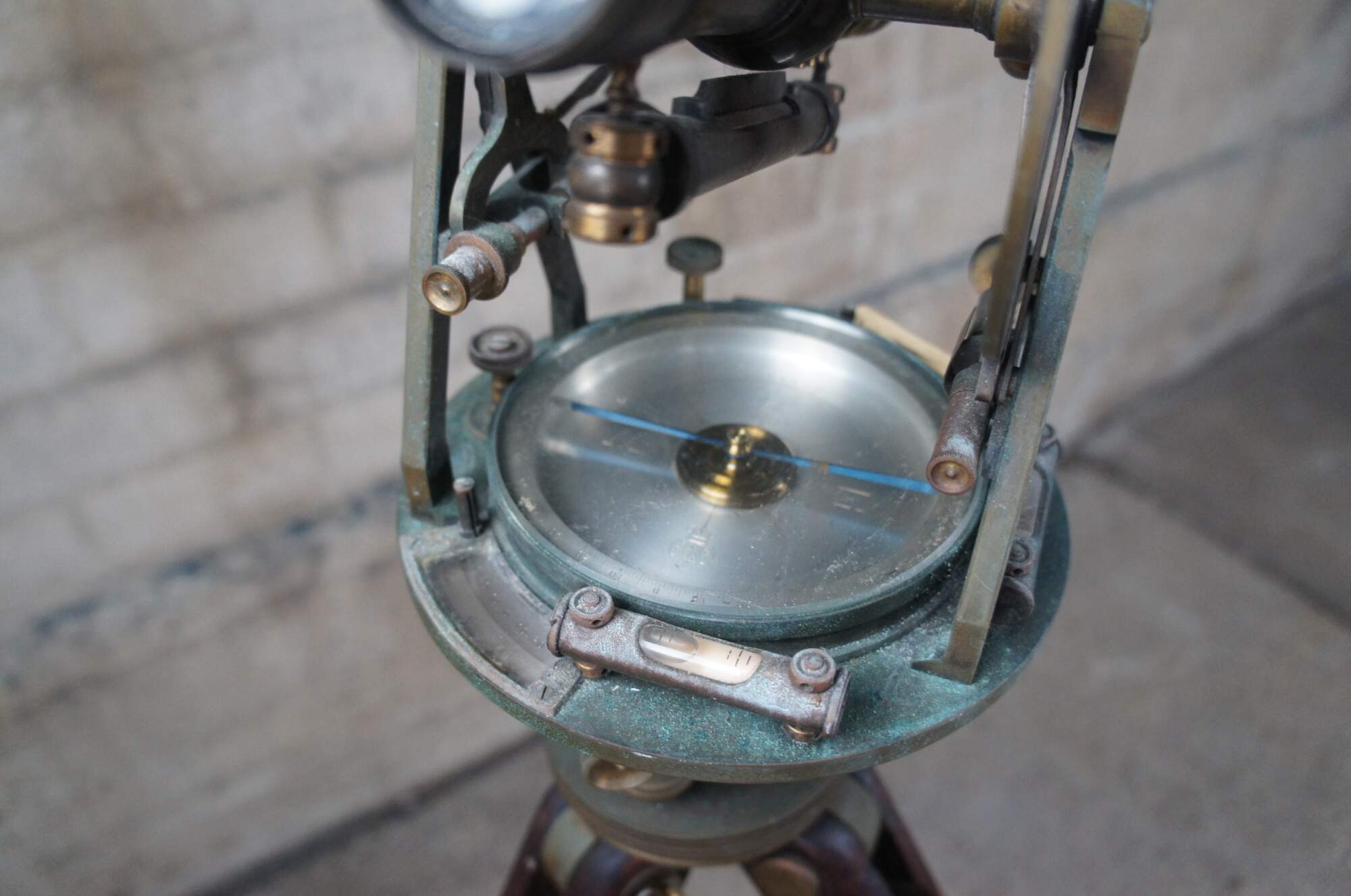 Fair; (verdigris) corrosion and patina from use and age. Could use cleaning / polish. One of the small glass windows along the outside of the compass is cracked.