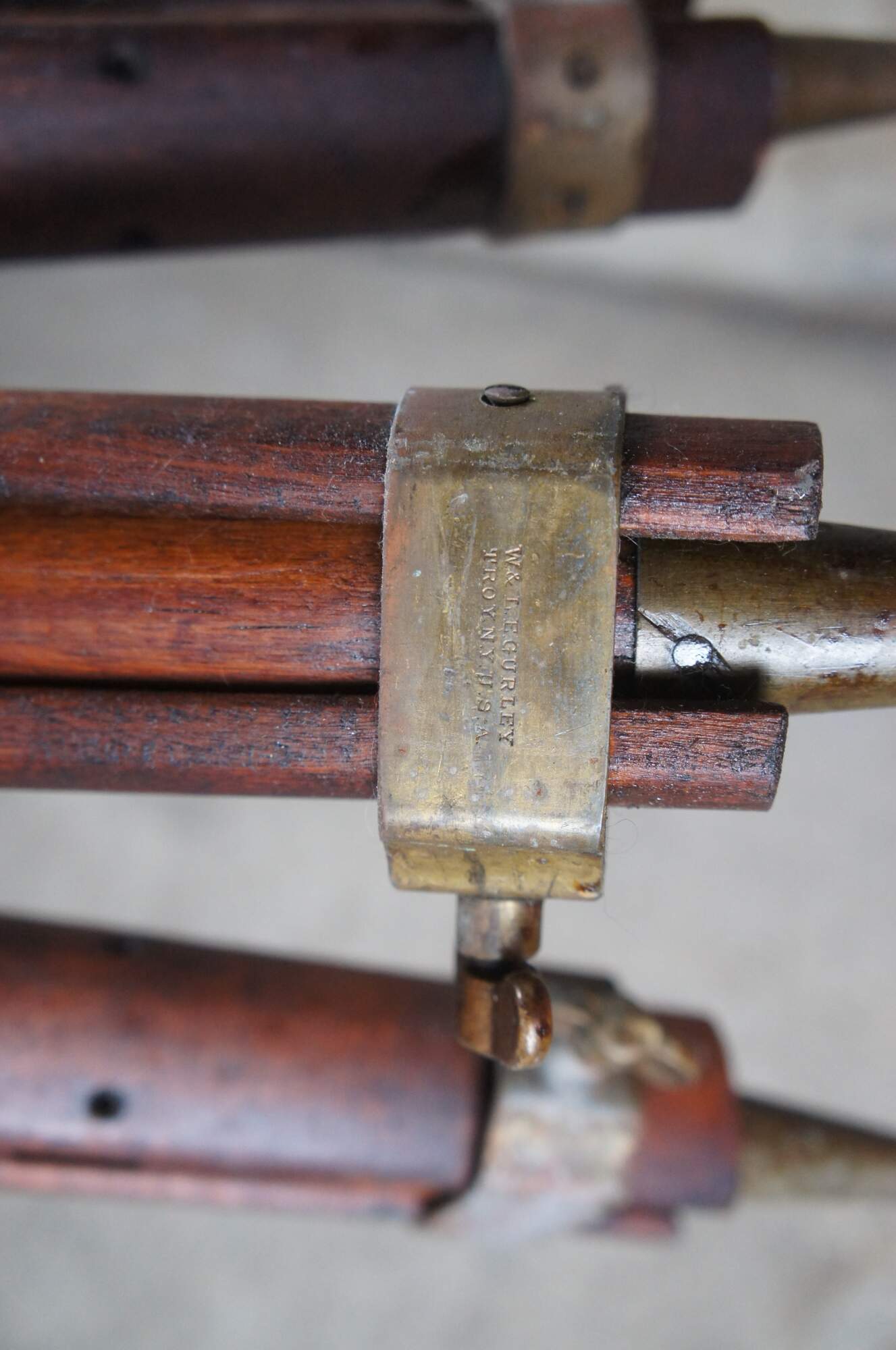 Antique surveyor’s level transit signed W & L.E Gurley, Troy NY. Made from oak, brass and glass with telescoping stand.