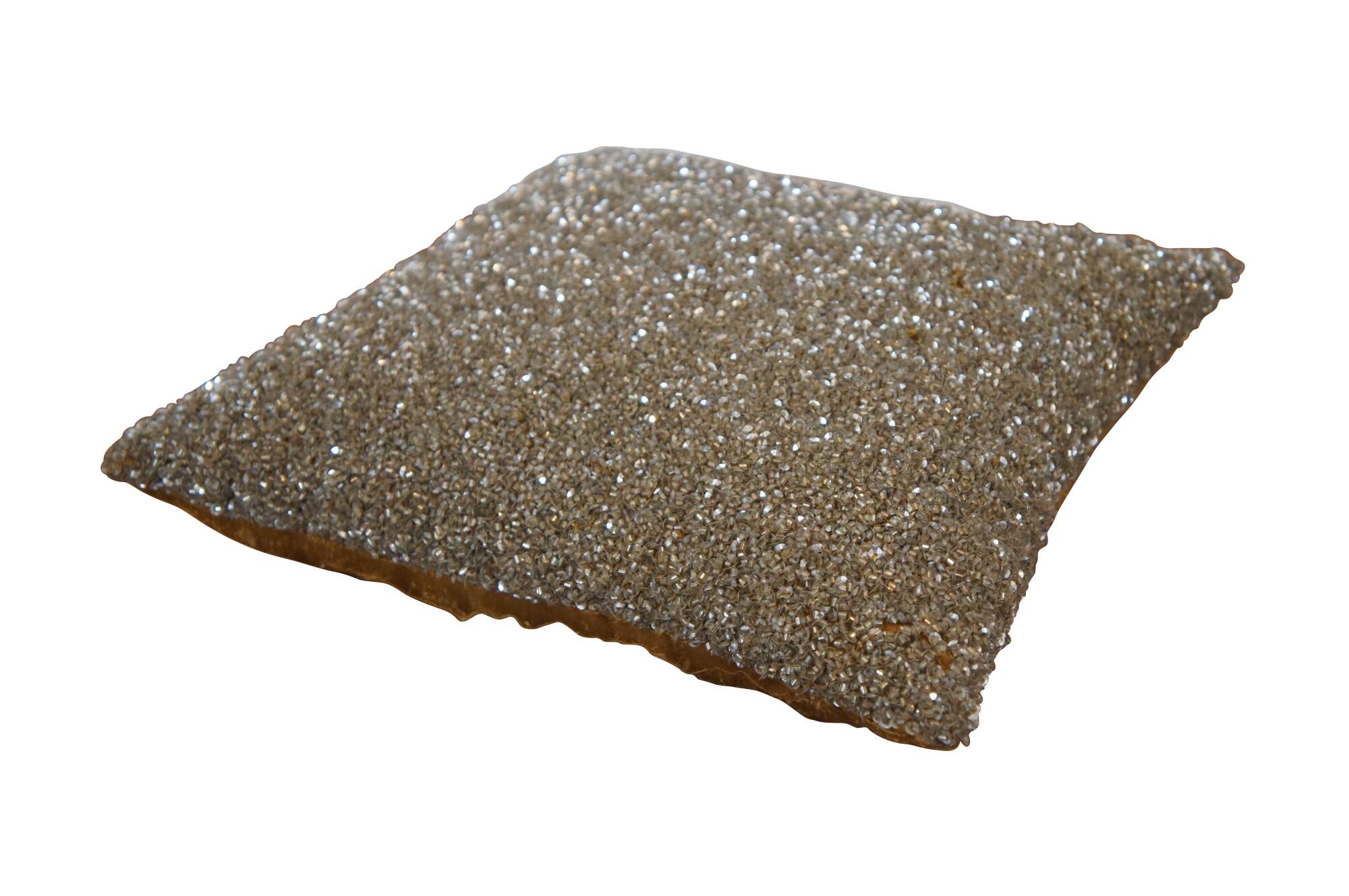 Waterford beaded throw pillow featuring tightly packed sequins and crystal beads on metallic, deep gold polyester. Ployester fiber filled; zippered closure.