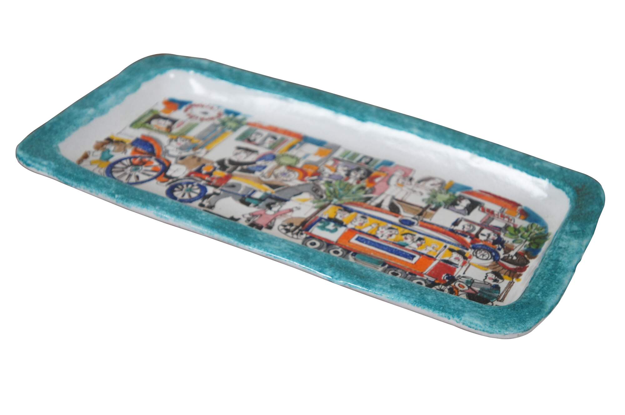 Vintage Italian ceramic pottery decorative serving tray by Ceramiche De Simone in their Folk line. Rectangular form with a teal blue border surround a bustling cityscape scene filled with a variety of figures and vehicles including cars, a trolley, motorbike, even a horse and carriage. Marked on back Desimone Italy 64. Item number VSS39FKE. MSRP: €132.00