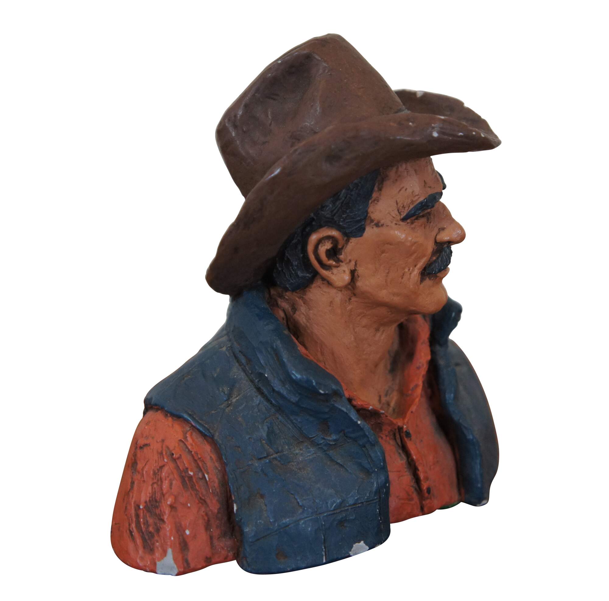 Vintage southwestern hand painted resin figurine featuring the head and shoulders of an American cowboy. Copyright Michael Garman 1974.