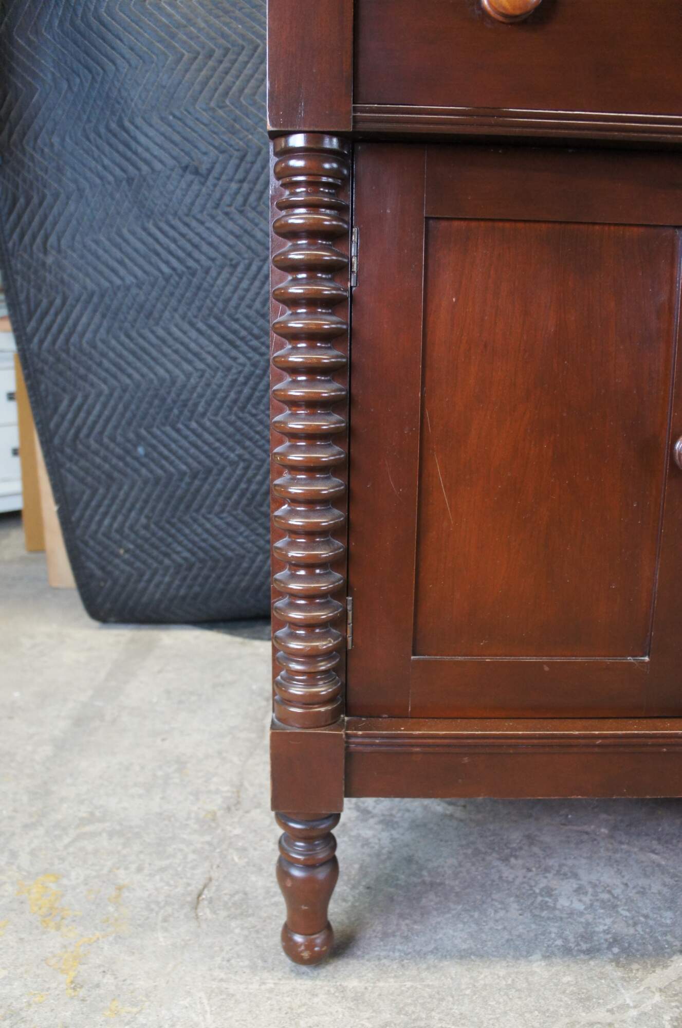 American Empire Revival Sideboard circa first half 20th century. Marked ""Styled by Park"". Features a rectangular form made from cherry with two large upper dovetailed drawers over lower cabients with shelf. Includes turned wooden knobs and applied spool turned columns along the front as well as a horizontal ribbed backsplash. The case is supported by turned turnip feet.