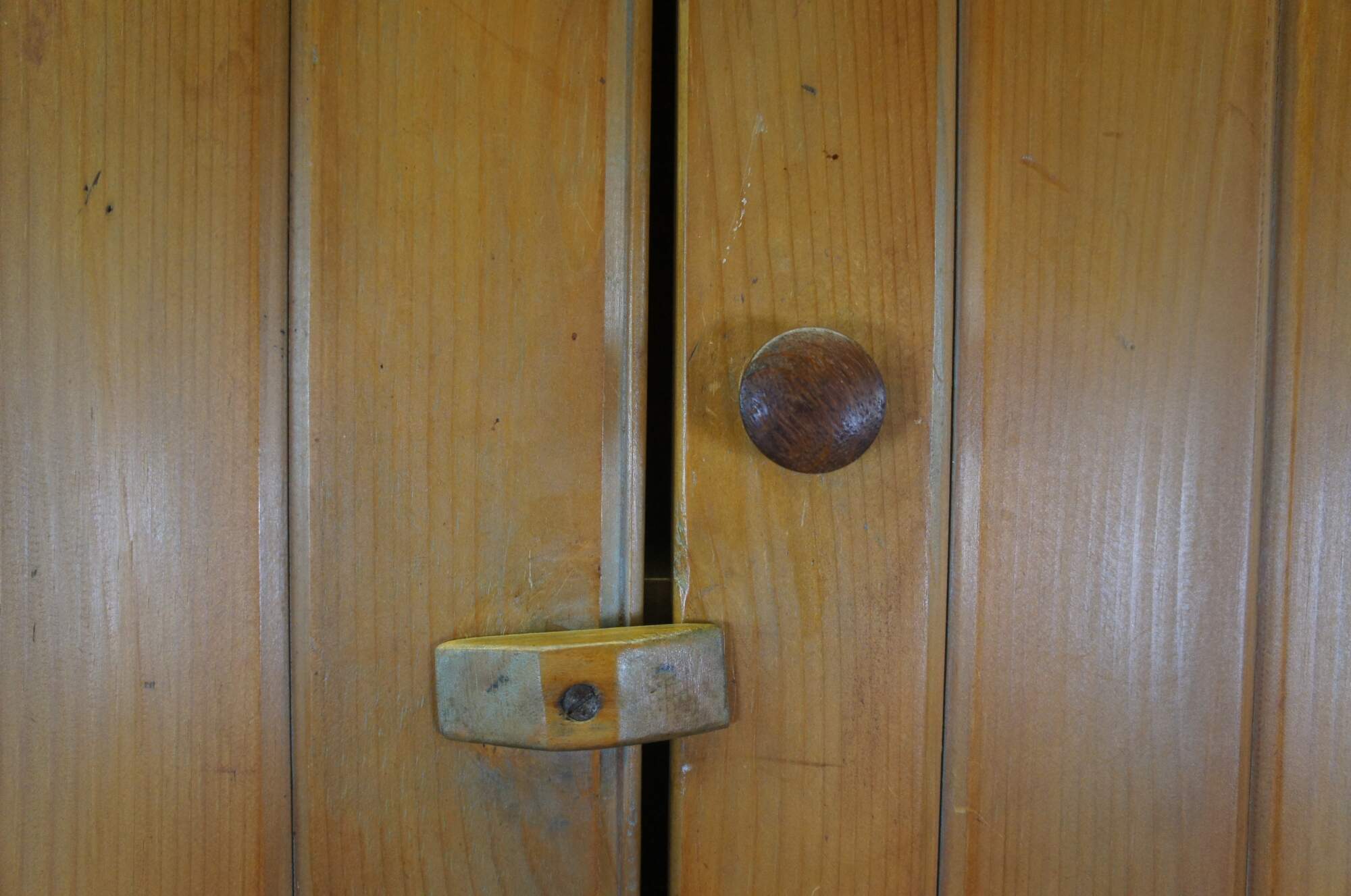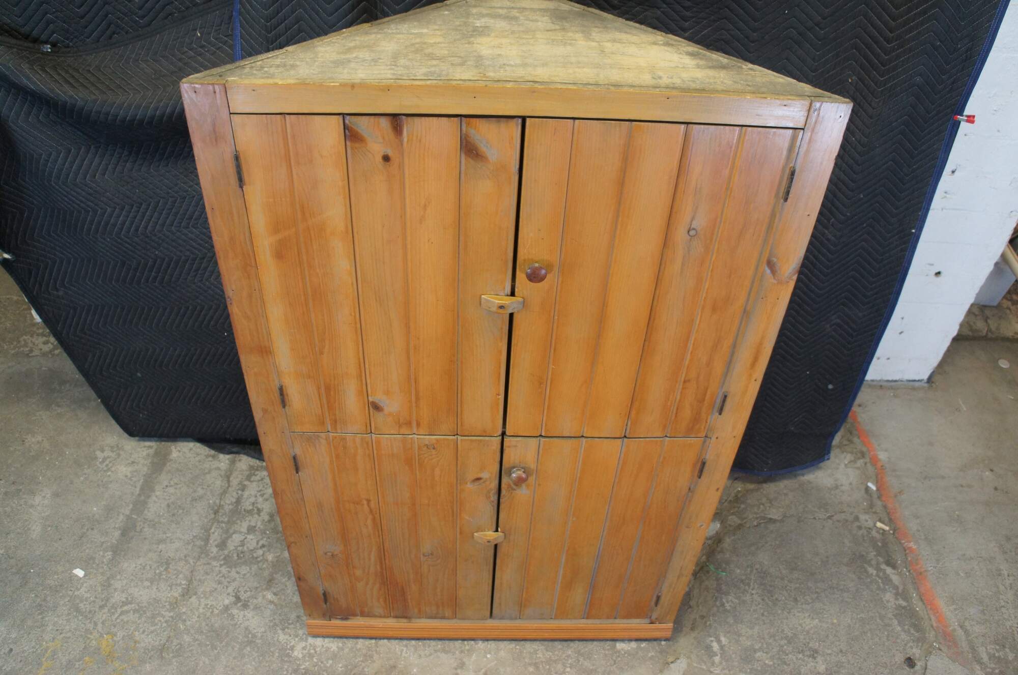 Lovely antique beadboard corner cabinet. Beadboard is wood paneling with vertical grooves and small ridges between each plank. It was Initially used to help protect walls in high-traffic areas of 19th-century homes. This charming corner cabinet is made from pine with an upper and lower paneled compartment opening to three shelves. The cabinet features wooden pulls and latches.