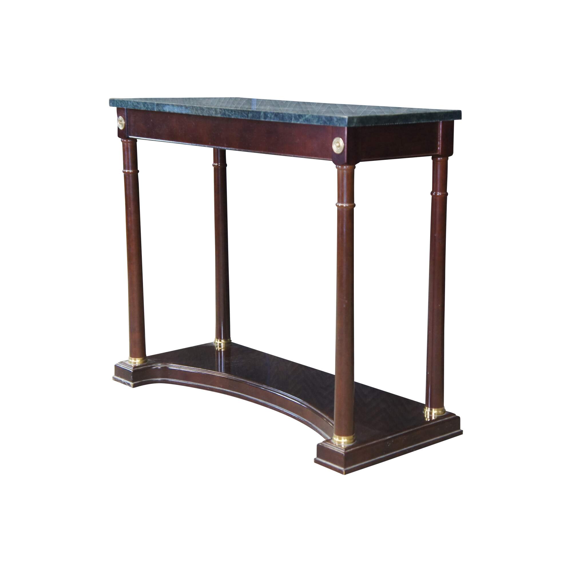 A stunning neoclassical inspired console table by Bombay Company. Made from Mahogany with a green marble top and brass accents. Circa 1989.