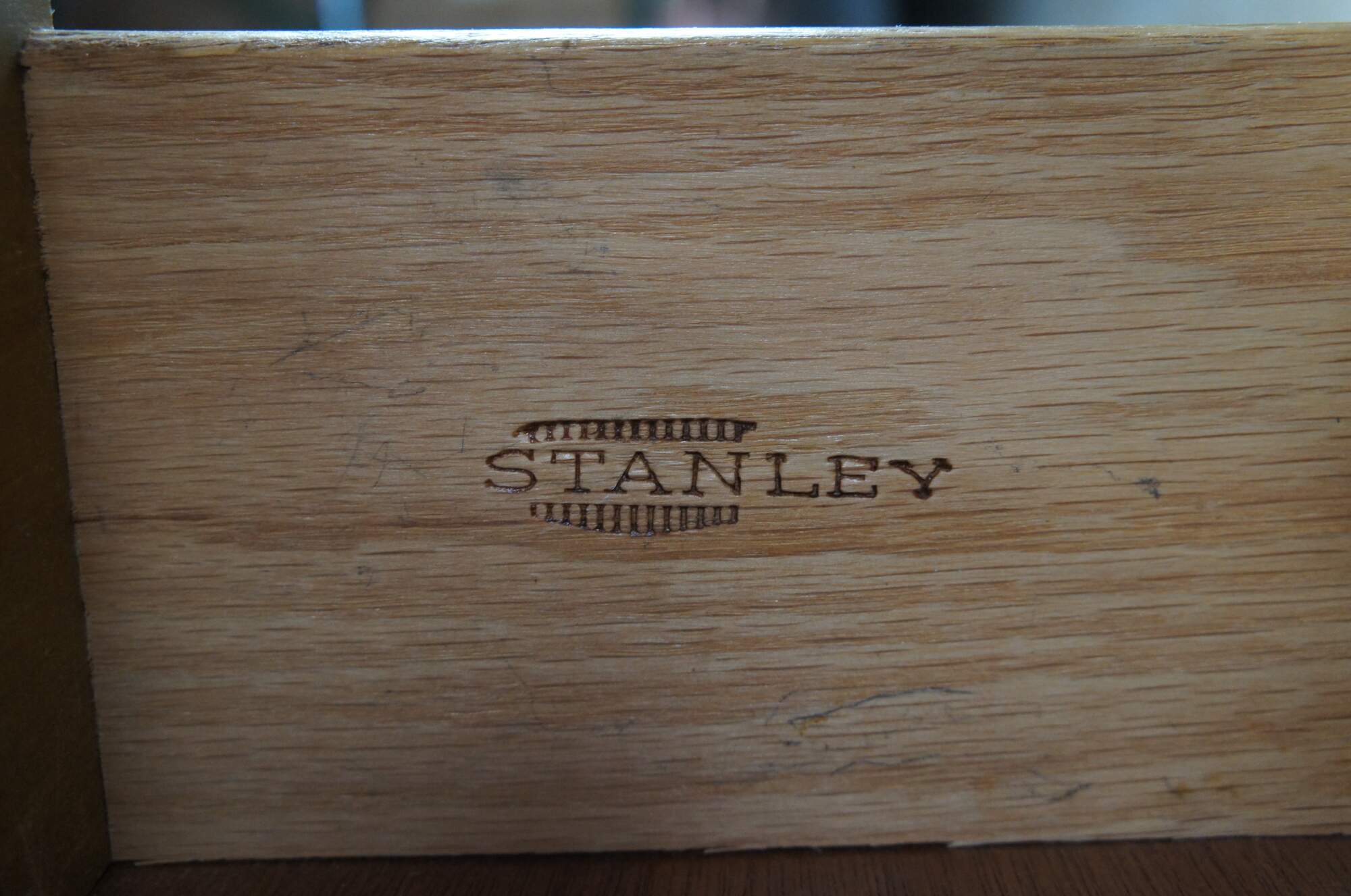 Stanley Furniture nightstand, circa 1980s. Made from oak with three dovetailed drawers and brass hardware.