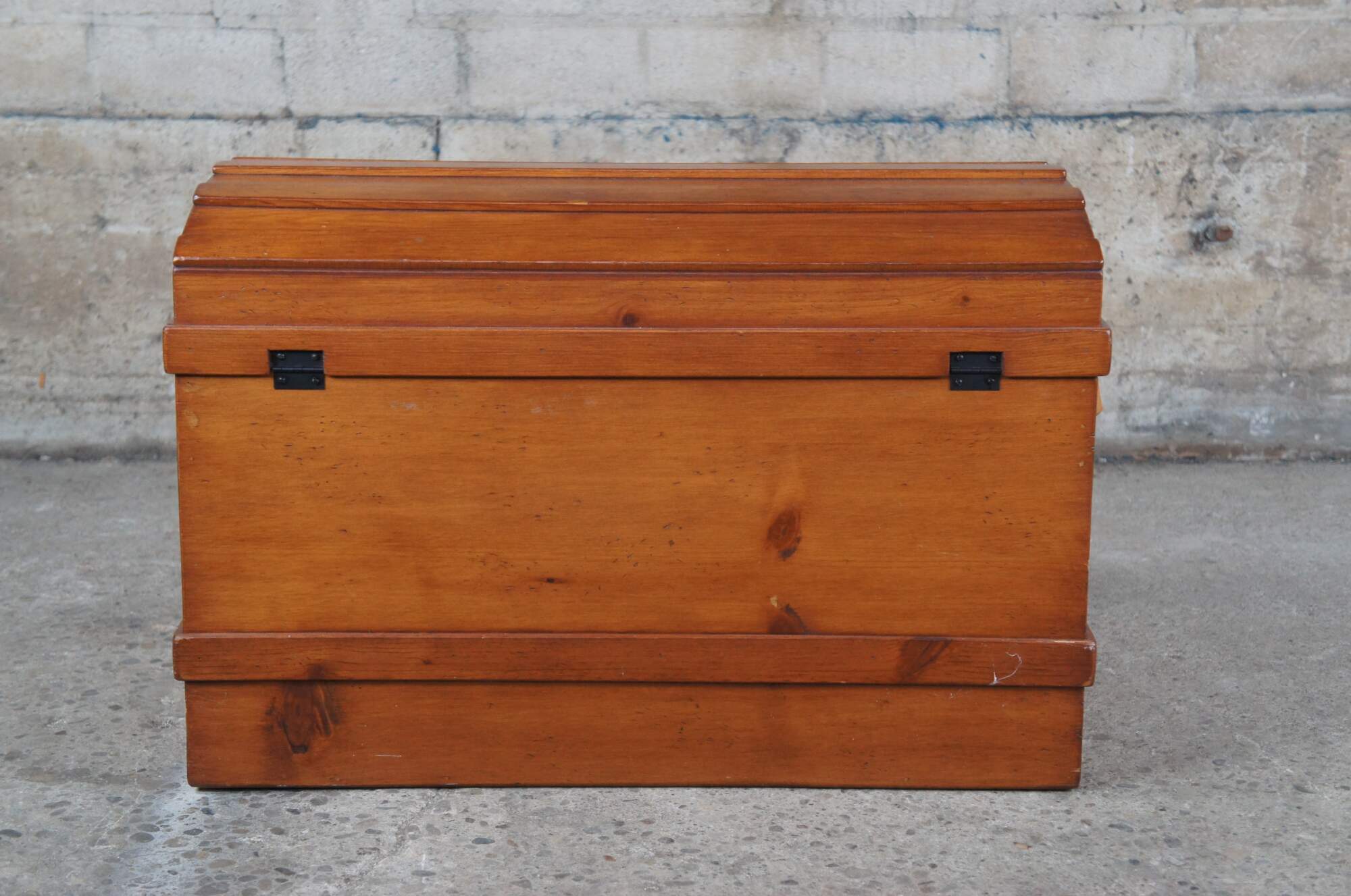 A Victorian style dome top trunk from the latter half of the 20th Century. Made from pine with leather handles and an iron escutcheon plate. Opens to a striped linen interior with removable tray.