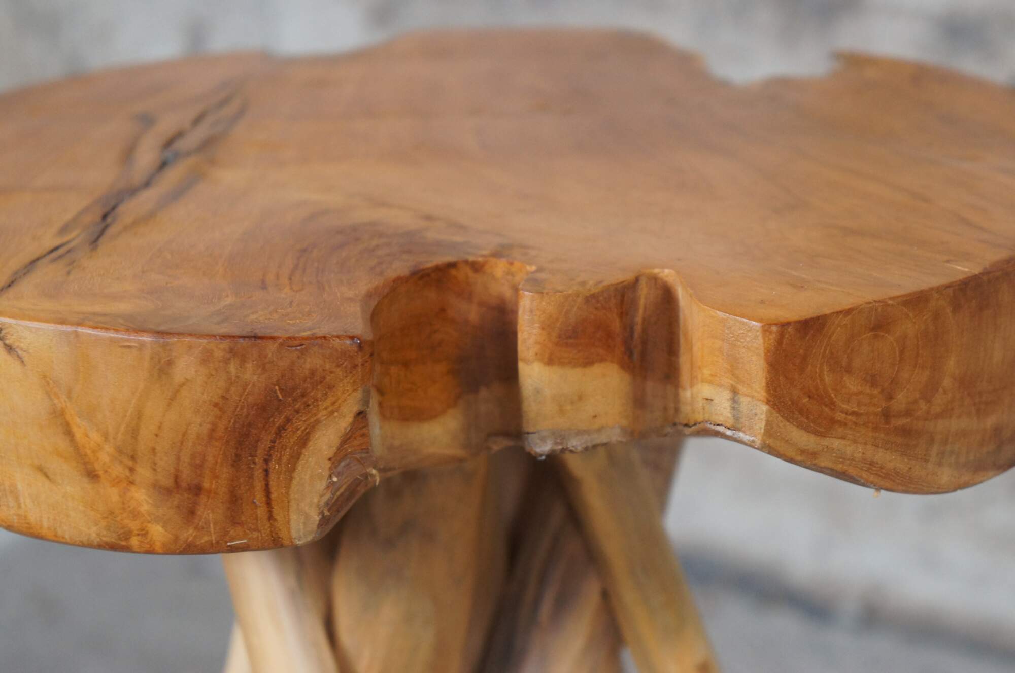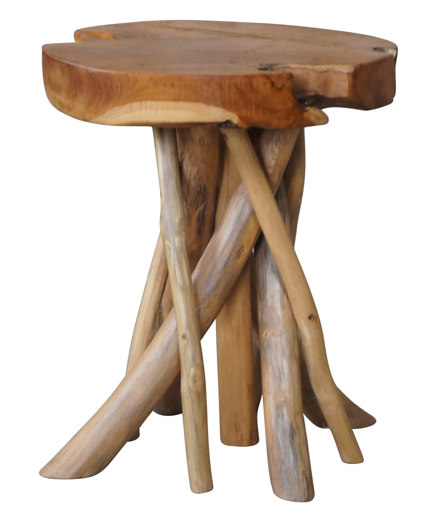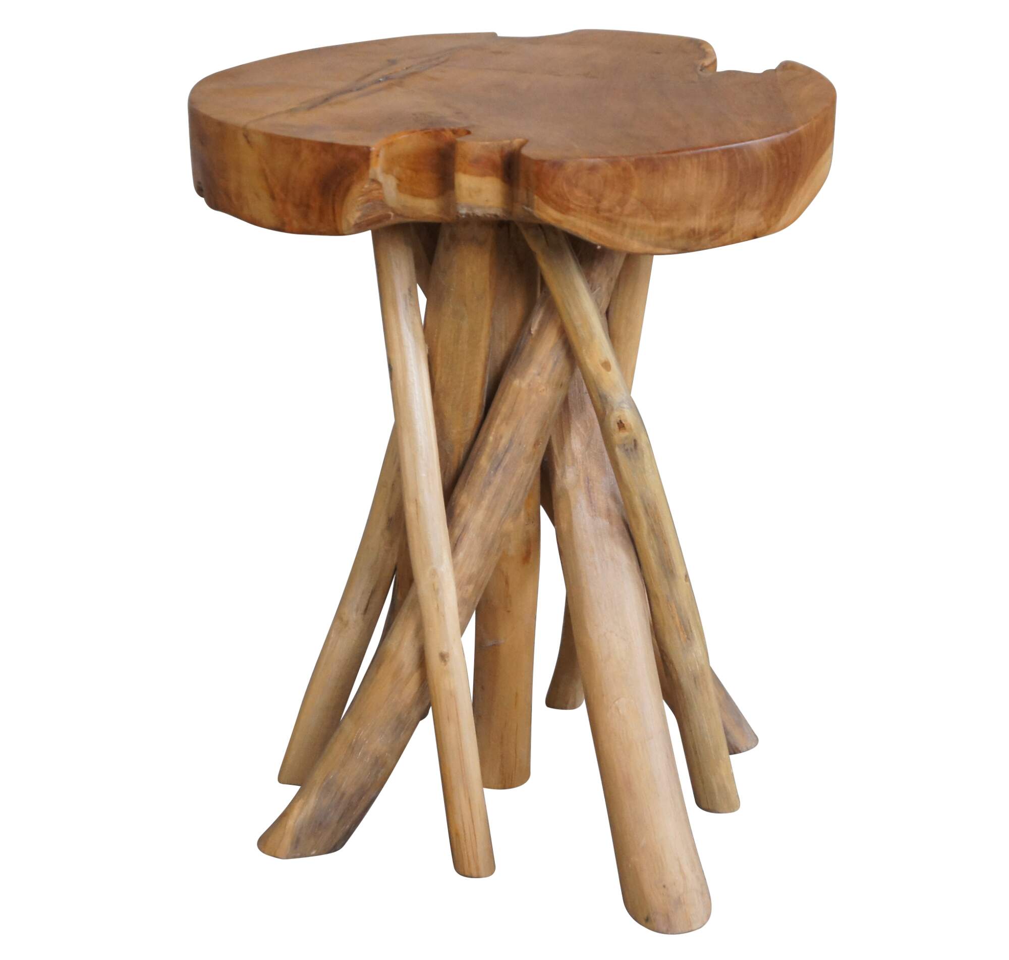 Intriguing farmhouse or lodge side table. Features a teak slab top over branch base. Great for use next to a chair or even as a stool / seat.