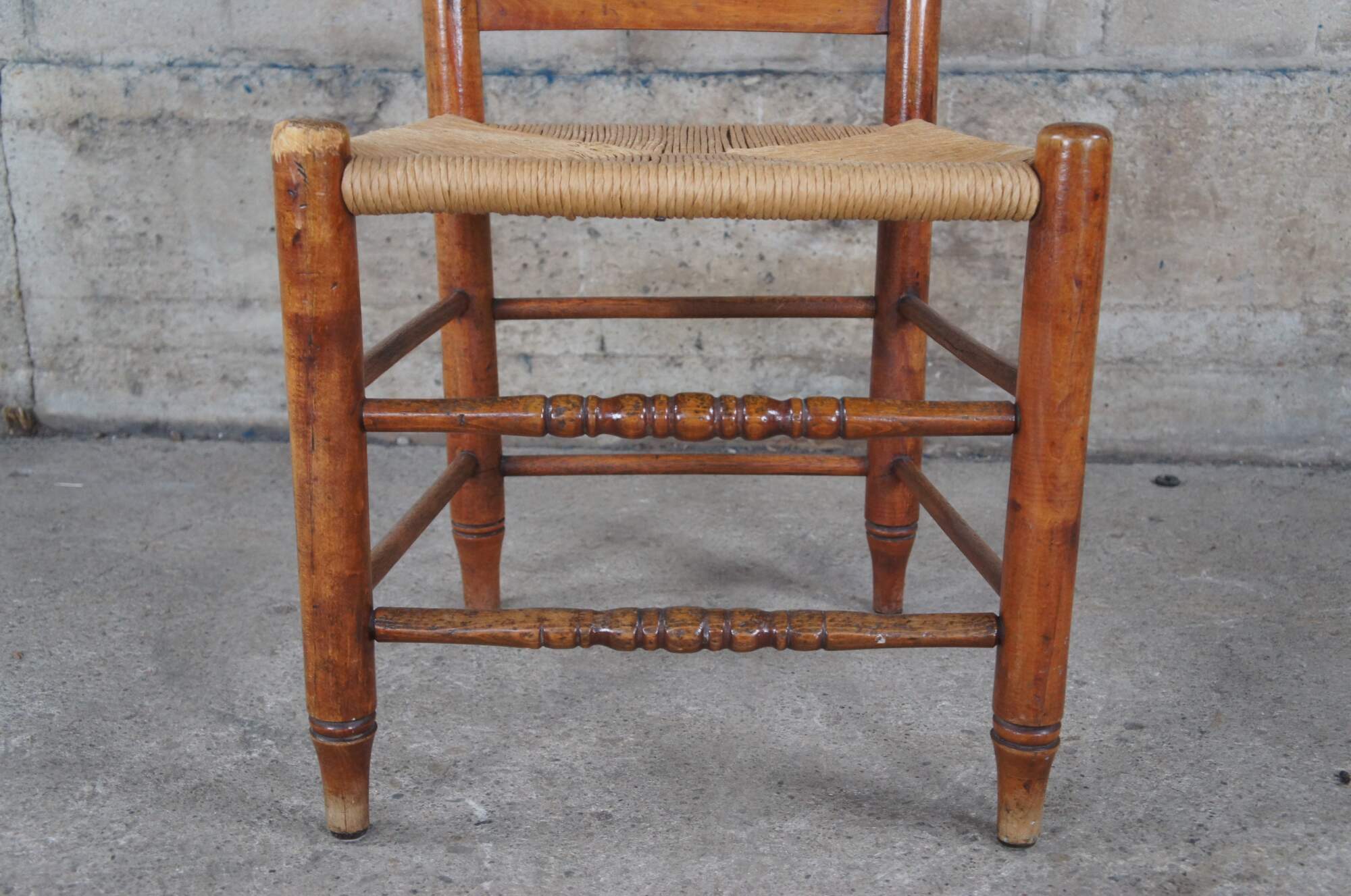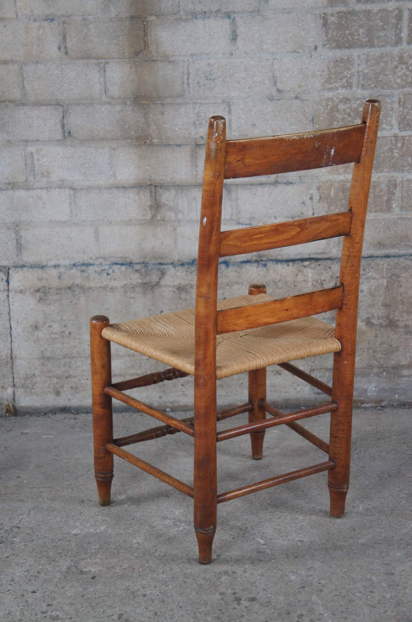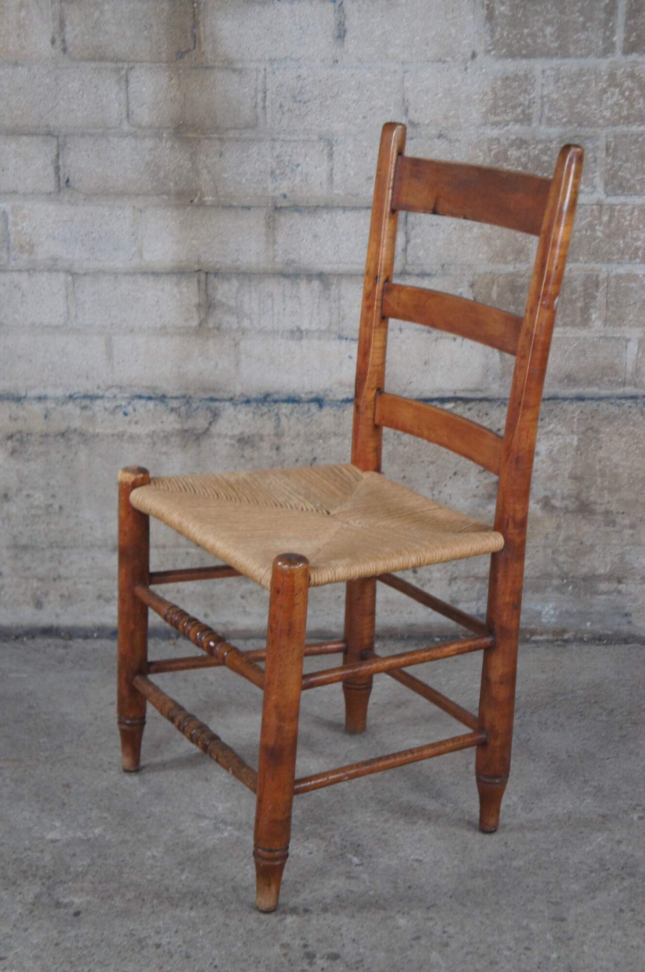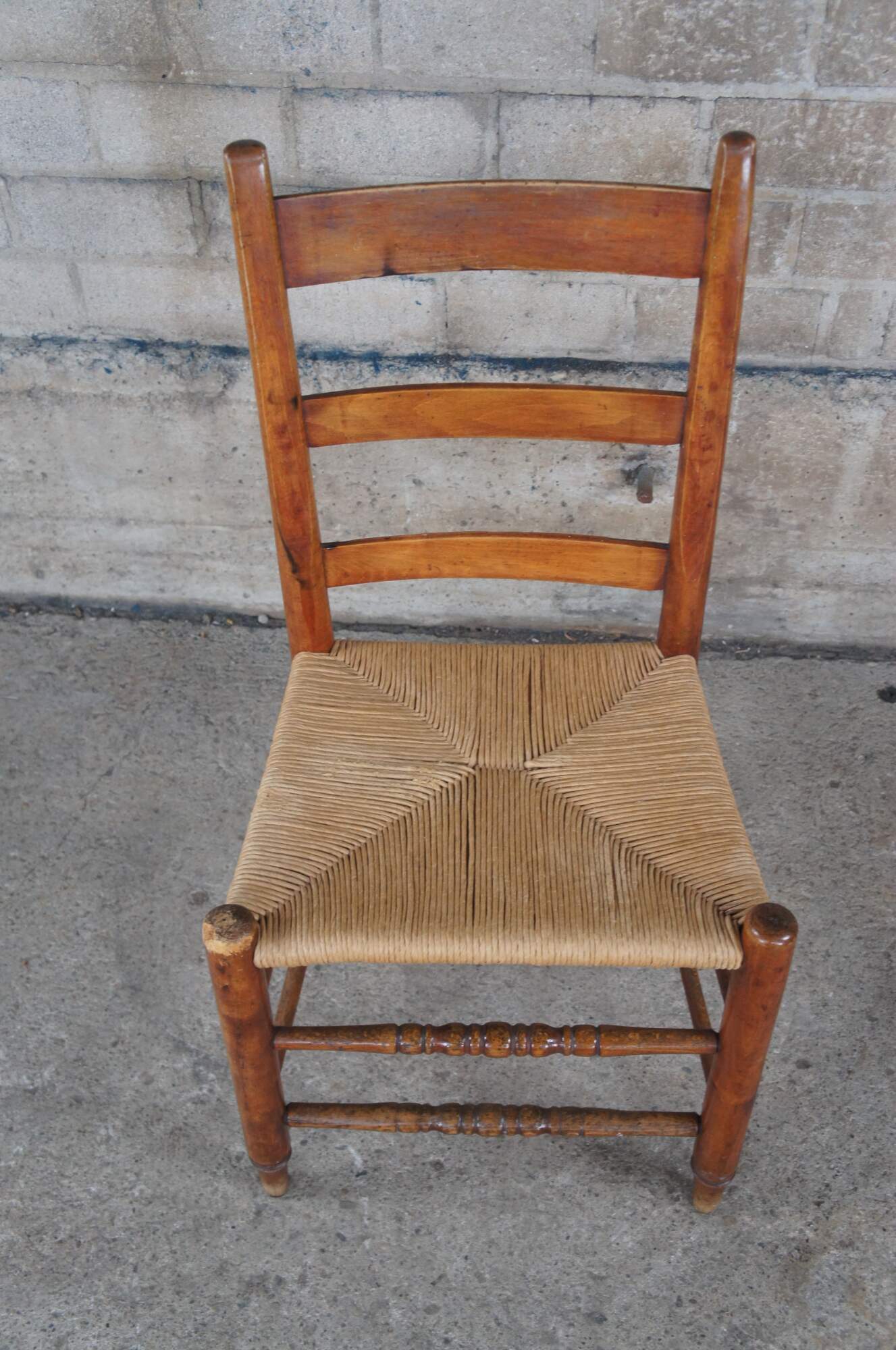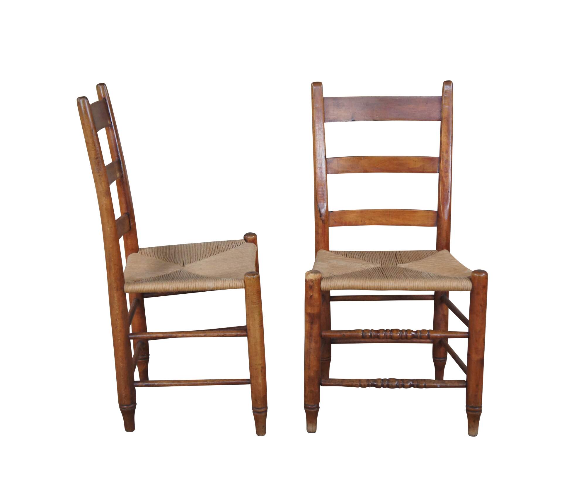 Two primitive antique ladderback chairs. Made of maple featuring turned supports, with rush seat and ladder back.
