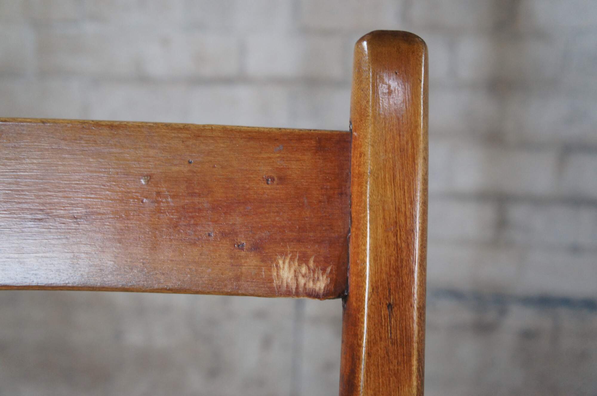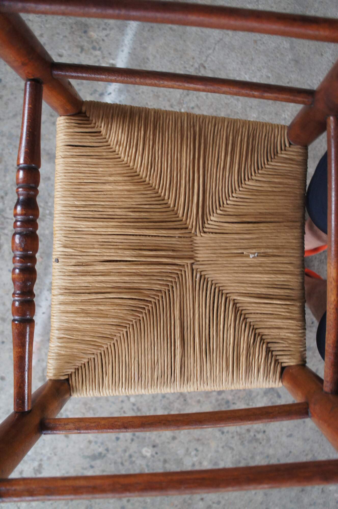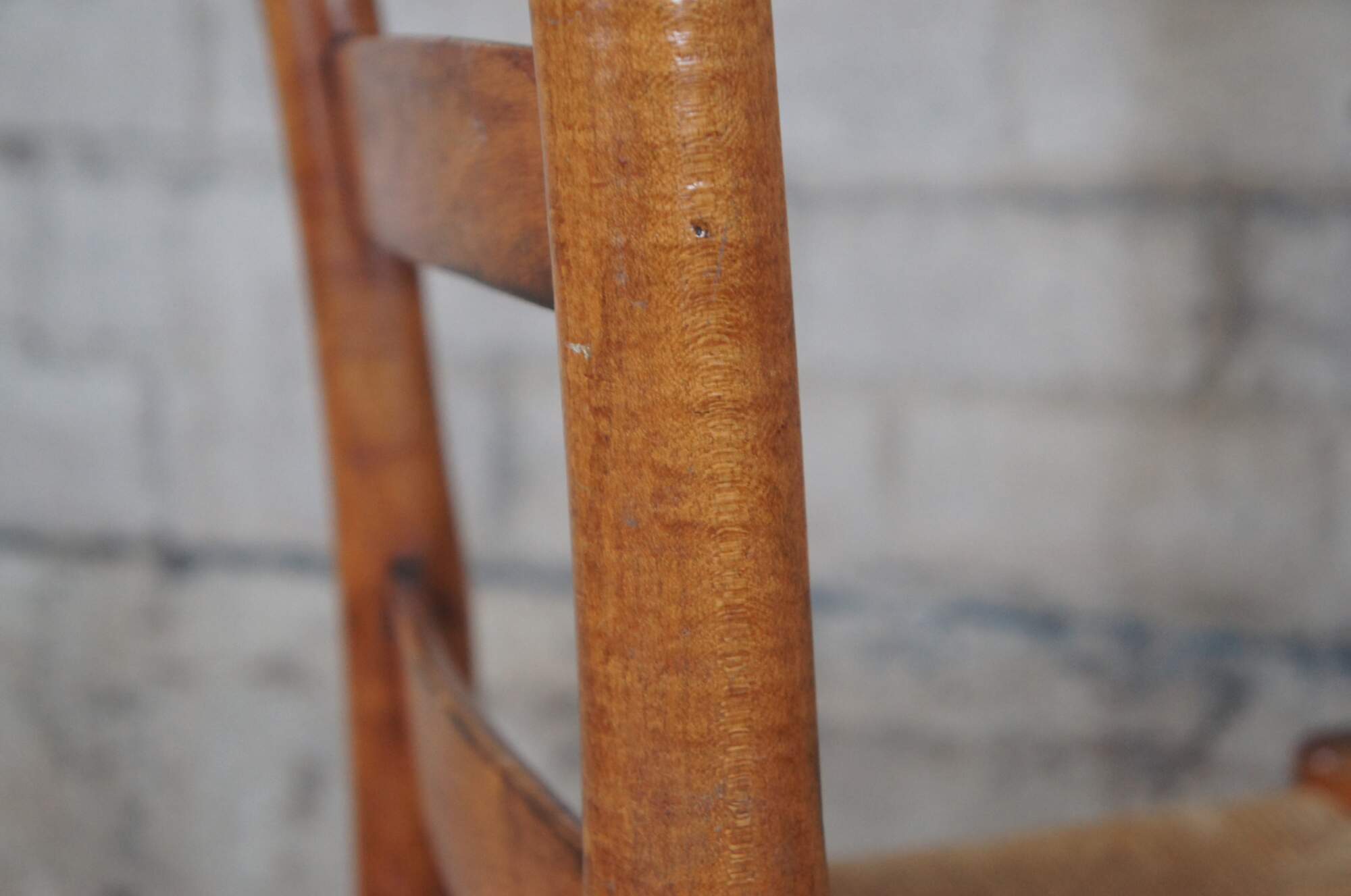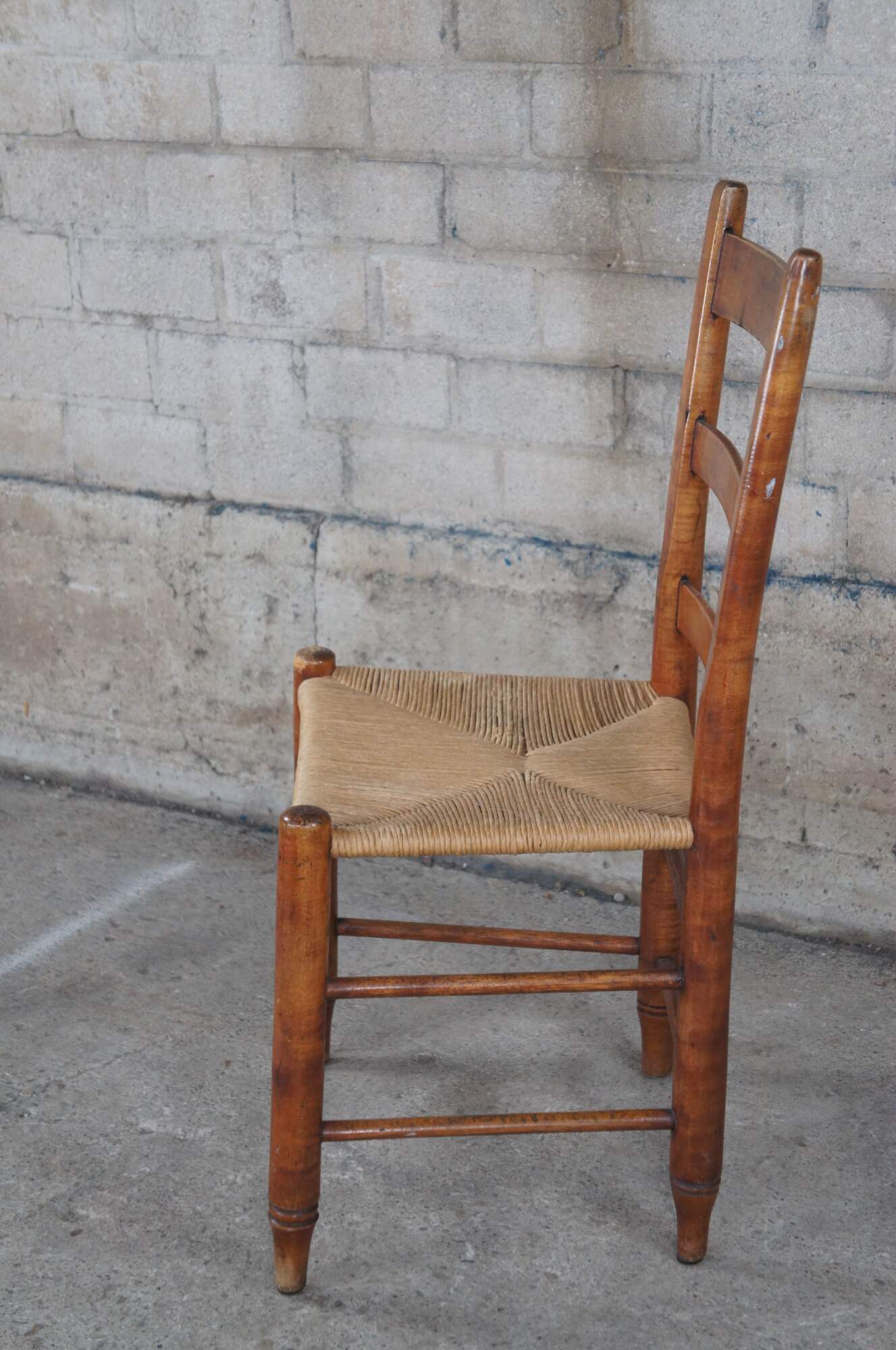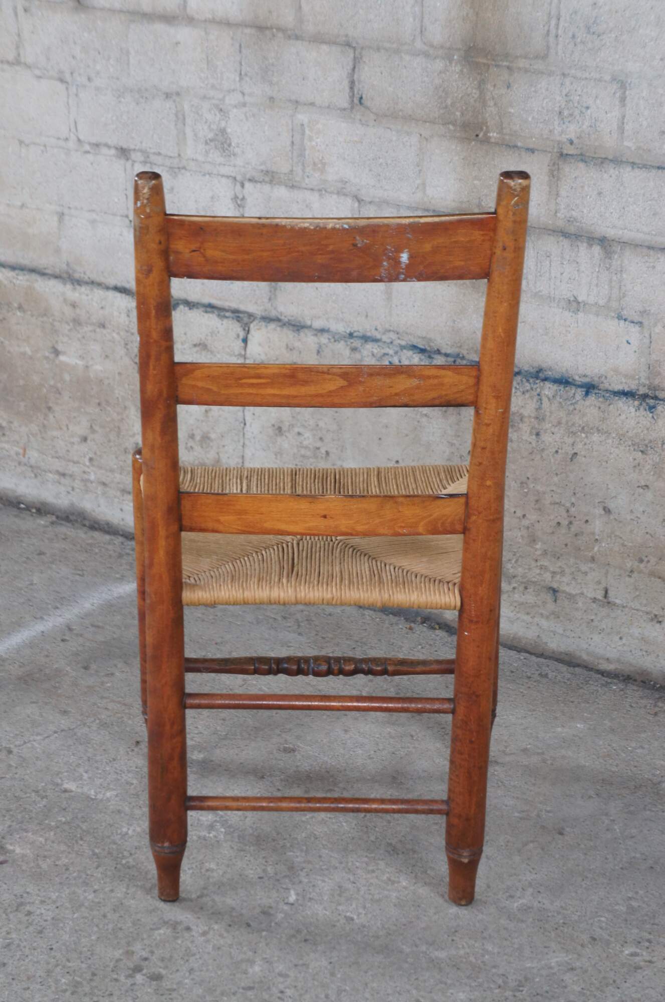 Two primitive antique ladderback chairs. Made of maple featuring turned supports, with rush seat and ladder back.