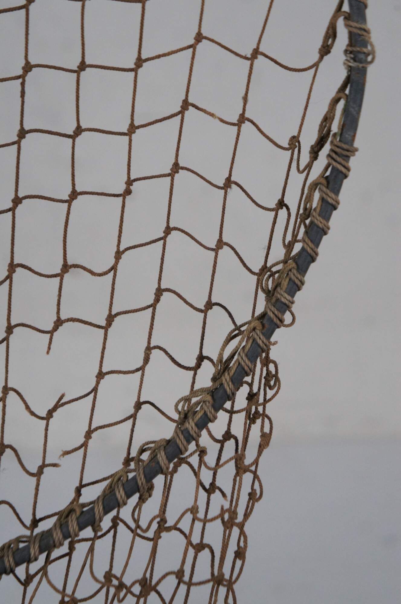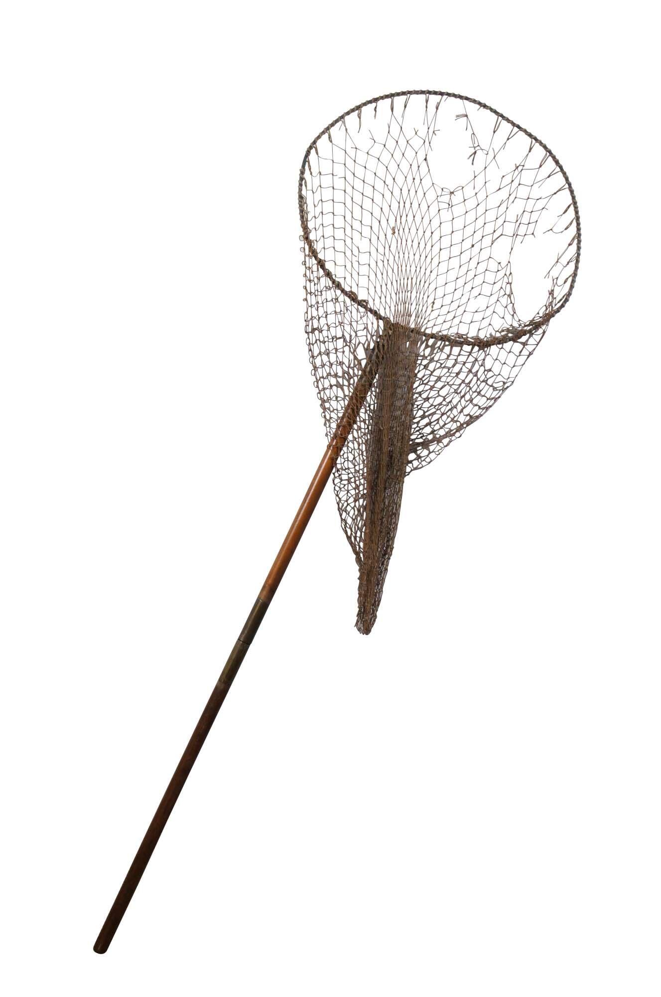 Antique fishing / landing net with long wood and brass pole, round wire top, and woven cotton net.