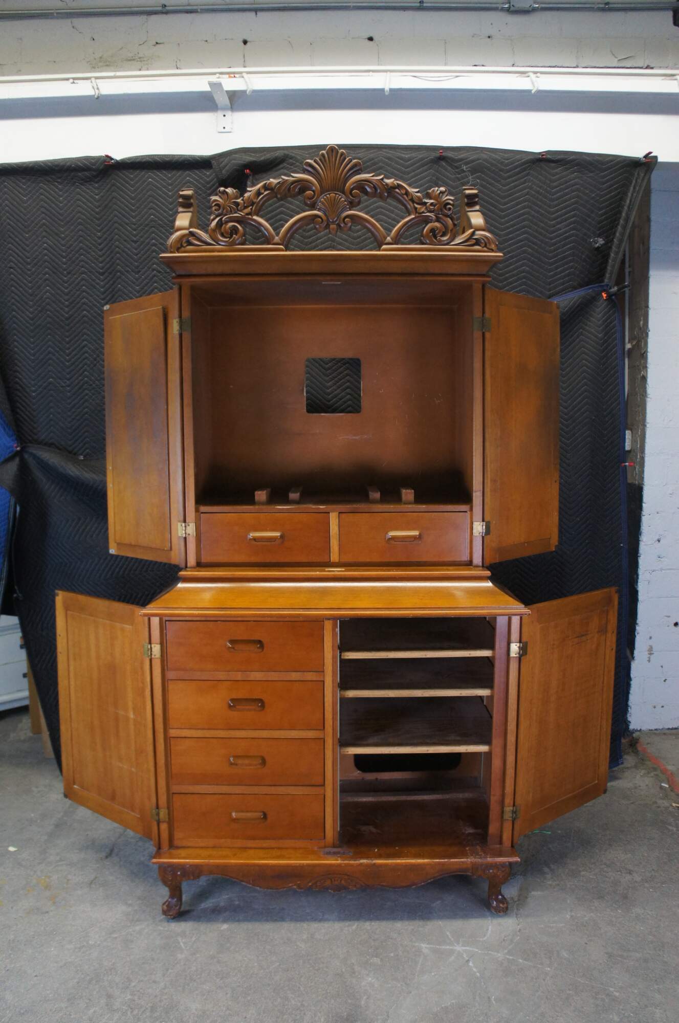An impressive dry bar / tv cabinet reclaimed from The Plaza Hotel of NYC in the 1990s. Drawing inspiration from French and Italian styling. A tall case made from mahogany with mirrored beveled hutch doors. This stately piece would have been used within one of the hotel suites. Features an ornately carved crown, chamfered stiles, applied foliate and cabriole legs. Opens via brass acorn hardware to an upper television space with two drawers. TV area can easily be modified to hold shelves for additional storage. Base opens to four drawers along the left and three shelves to the right. The lower right side of the cabinet used to hold a mini bar and bears the original "Private Bar" label.