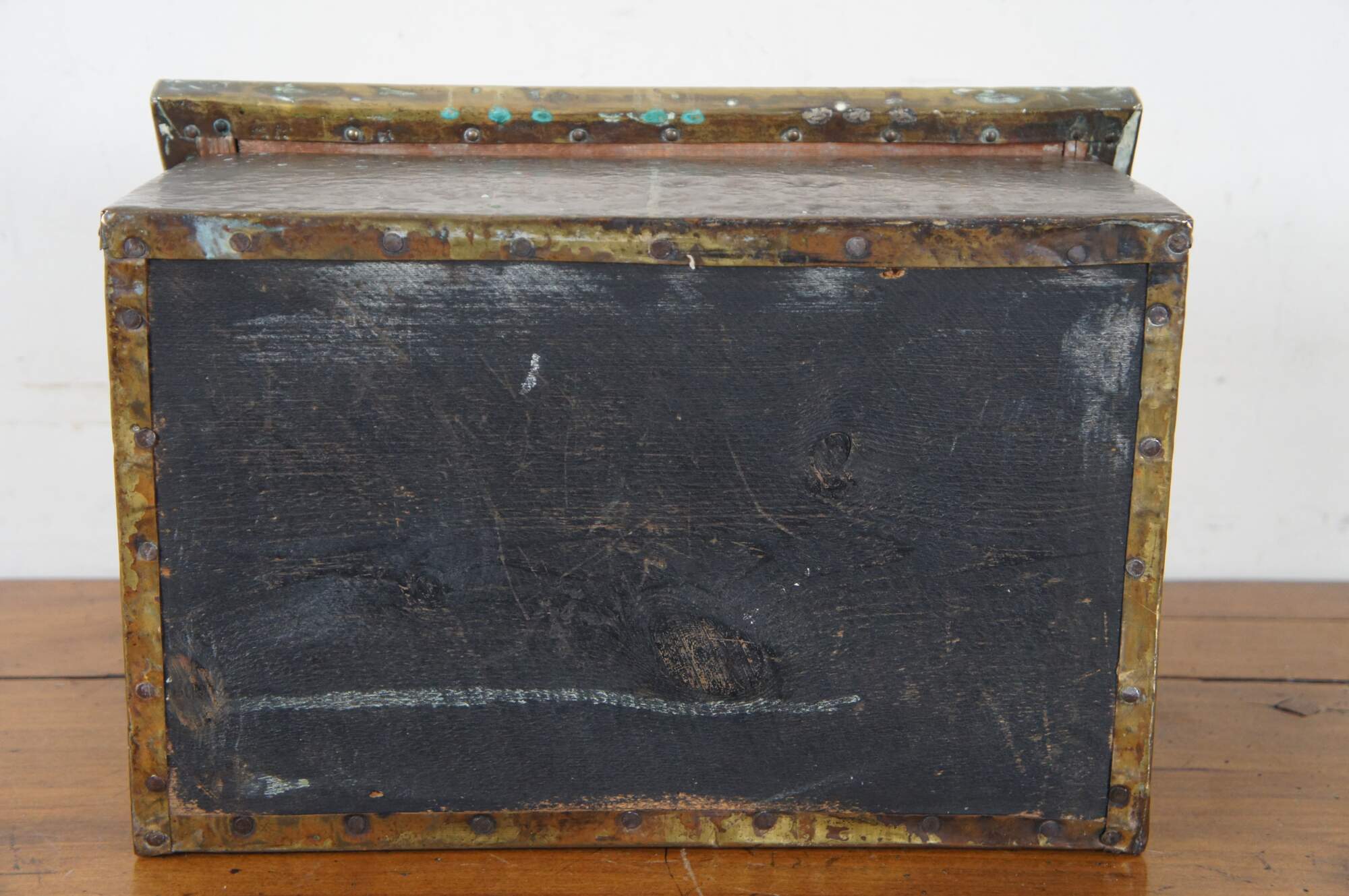 Late 19th century brass and wood lined slipper box. Rectangular form with sloped flip top lid, embossed with the label “Slippers” in a simple but elegant frame. Traditionally placed by the fireside to warm one’s house slippers in before wearing.