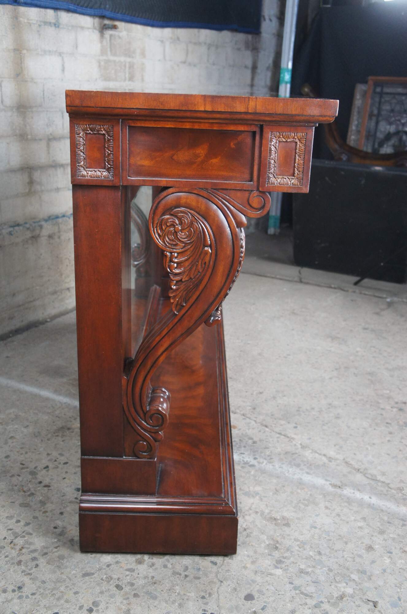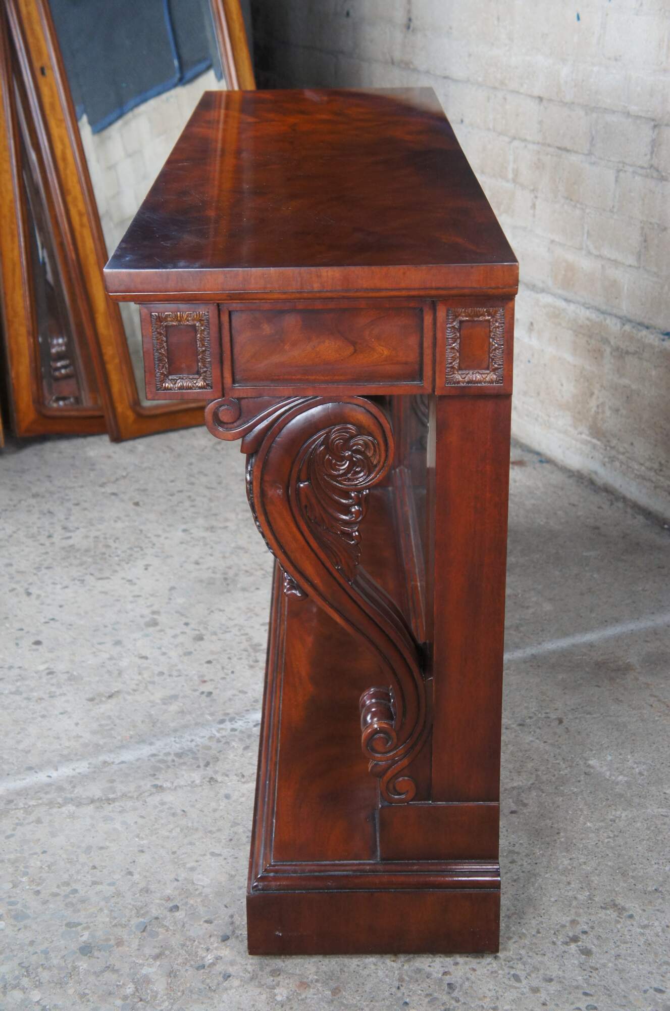 A stately English Regency mirrored pier table by Ralph Lauren, circa 1990s. The rectangular frame is made from a warm brown mahogany with matchbook burled panels. A pronounced top is supported by thick acanthus-scrolled corbels over a plinth base. The central mirror has an antiqued finish and one inch bevel. Includes foliate carved panels and a faux escuthceon with key for the drawer pull.