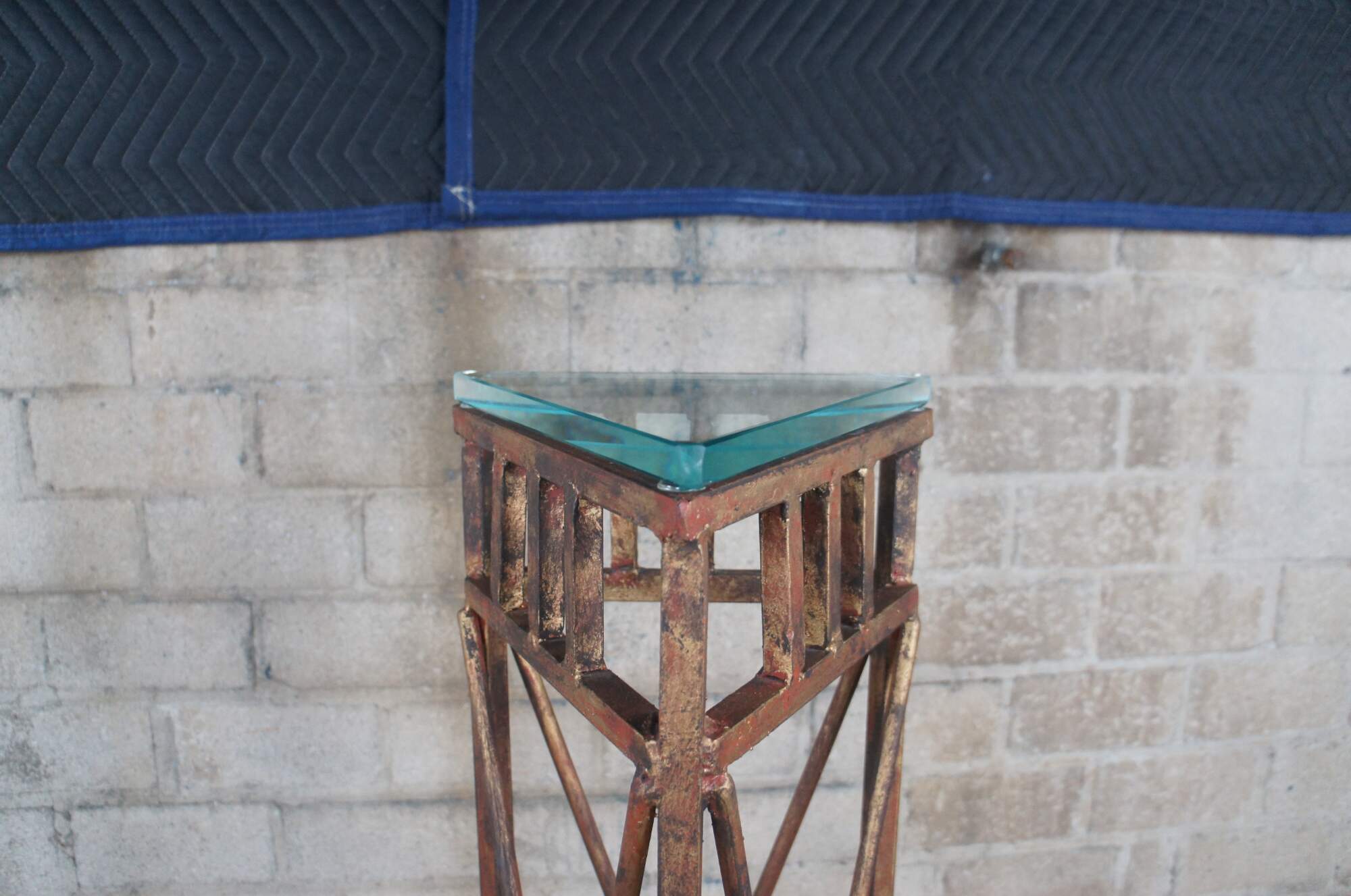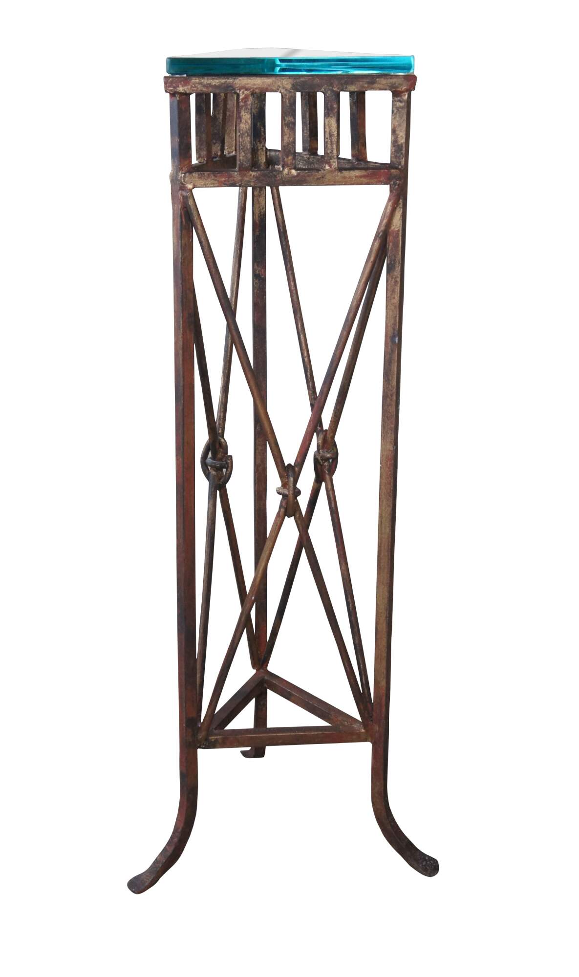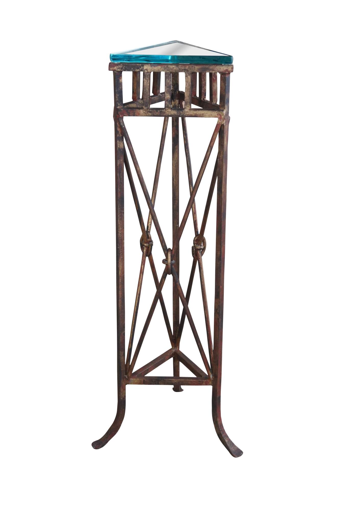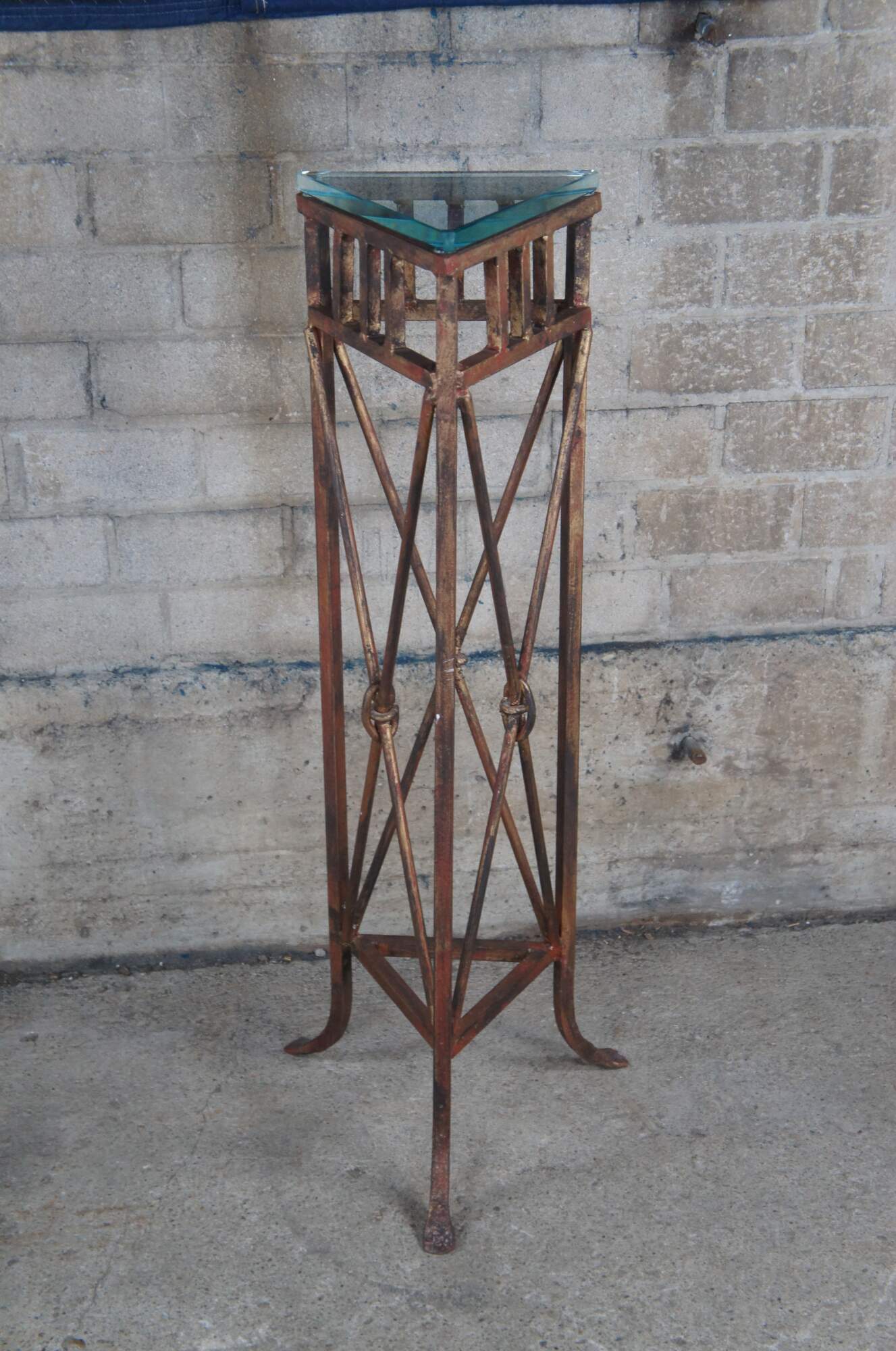 An iron pedestal in Neoclassical and French Empire styling. Features a reddish gold triangular prism form with "X" shape column over flared base. Topped with triangular tempered glass. Great for display of a culpture or vase.