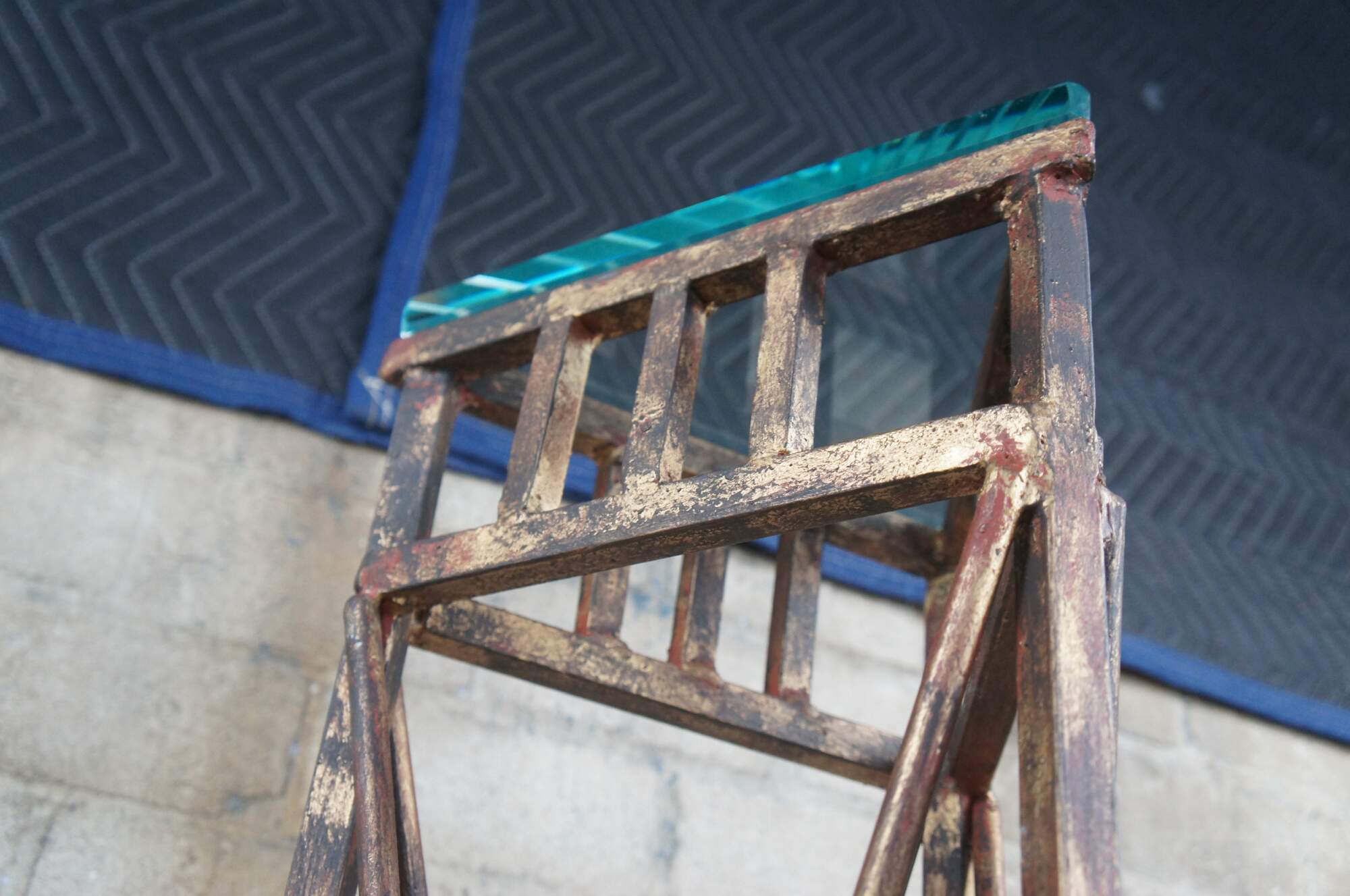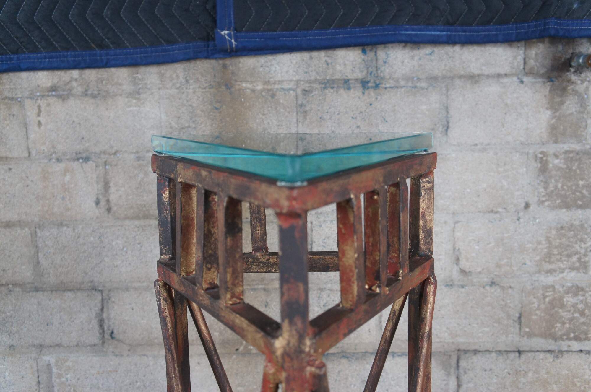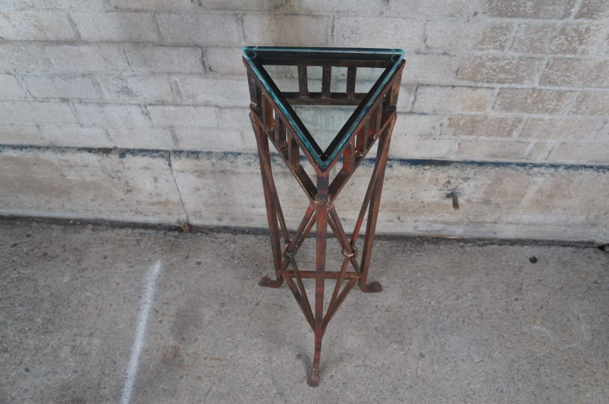An iron pedestal in Neoclassical and French Empire styling. Features a reddish gold triangular prism form with "X" shape column over flared base. Topped with triangular tempered glass. Great for display of a culpture or vase.