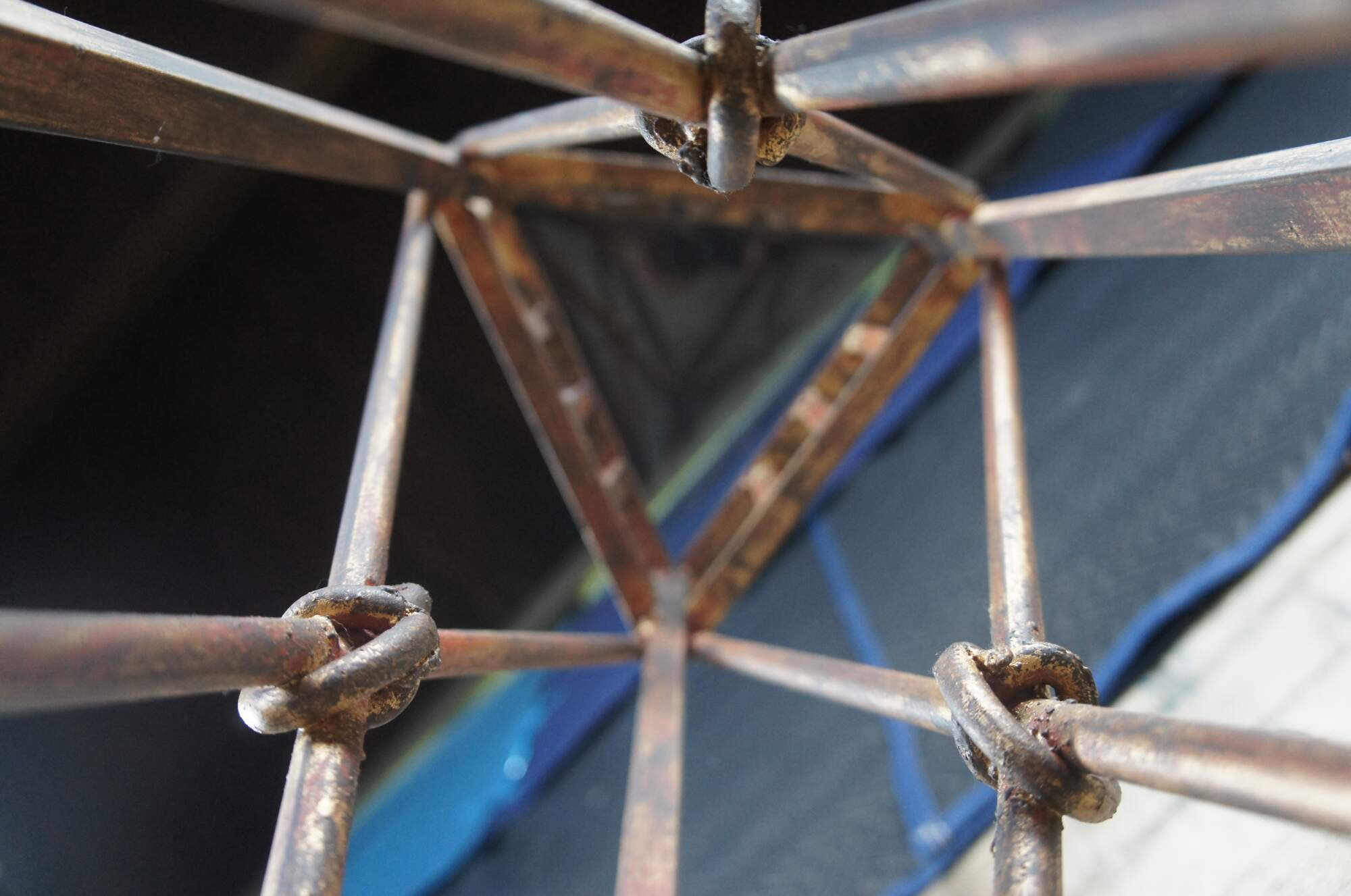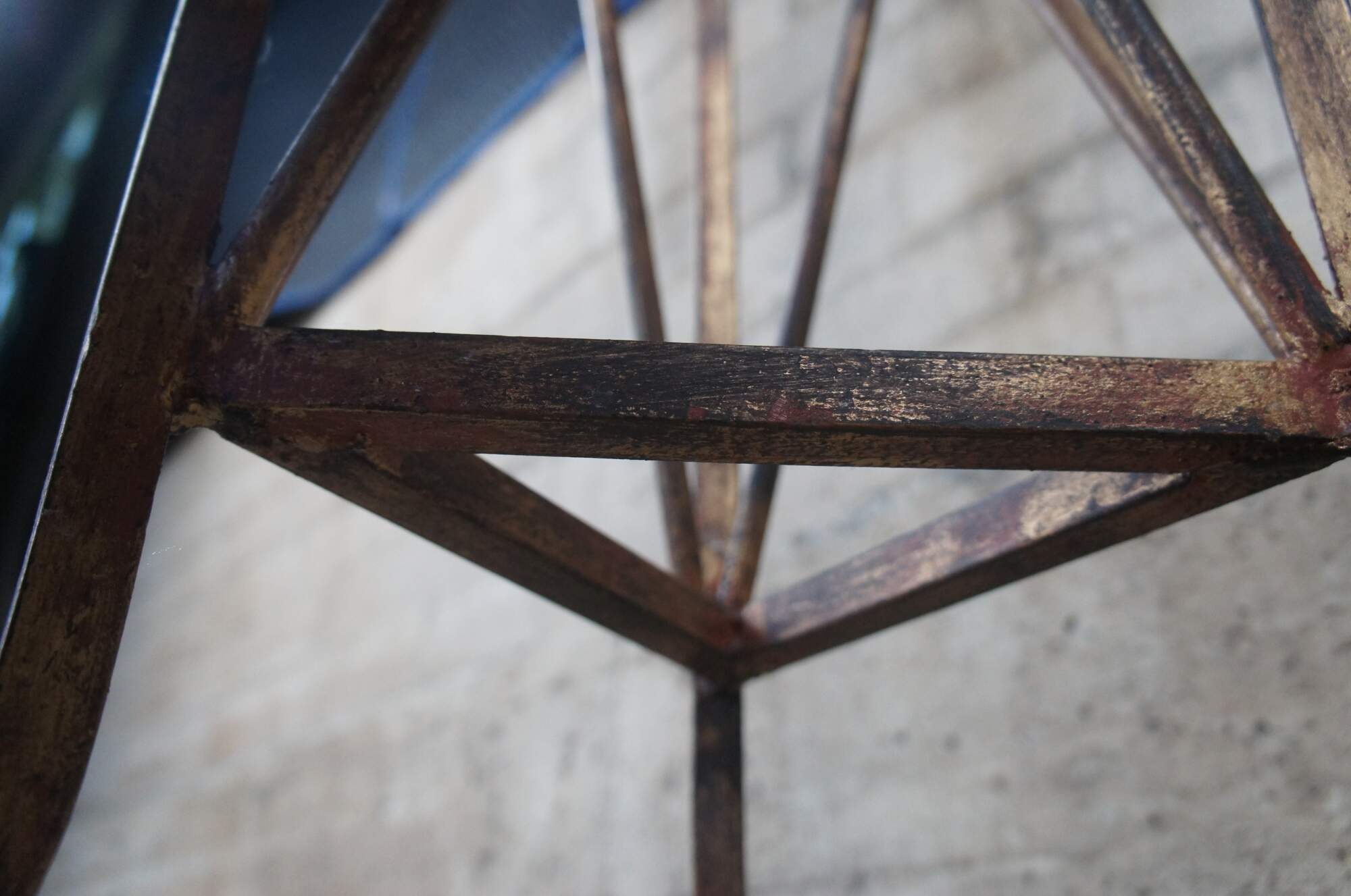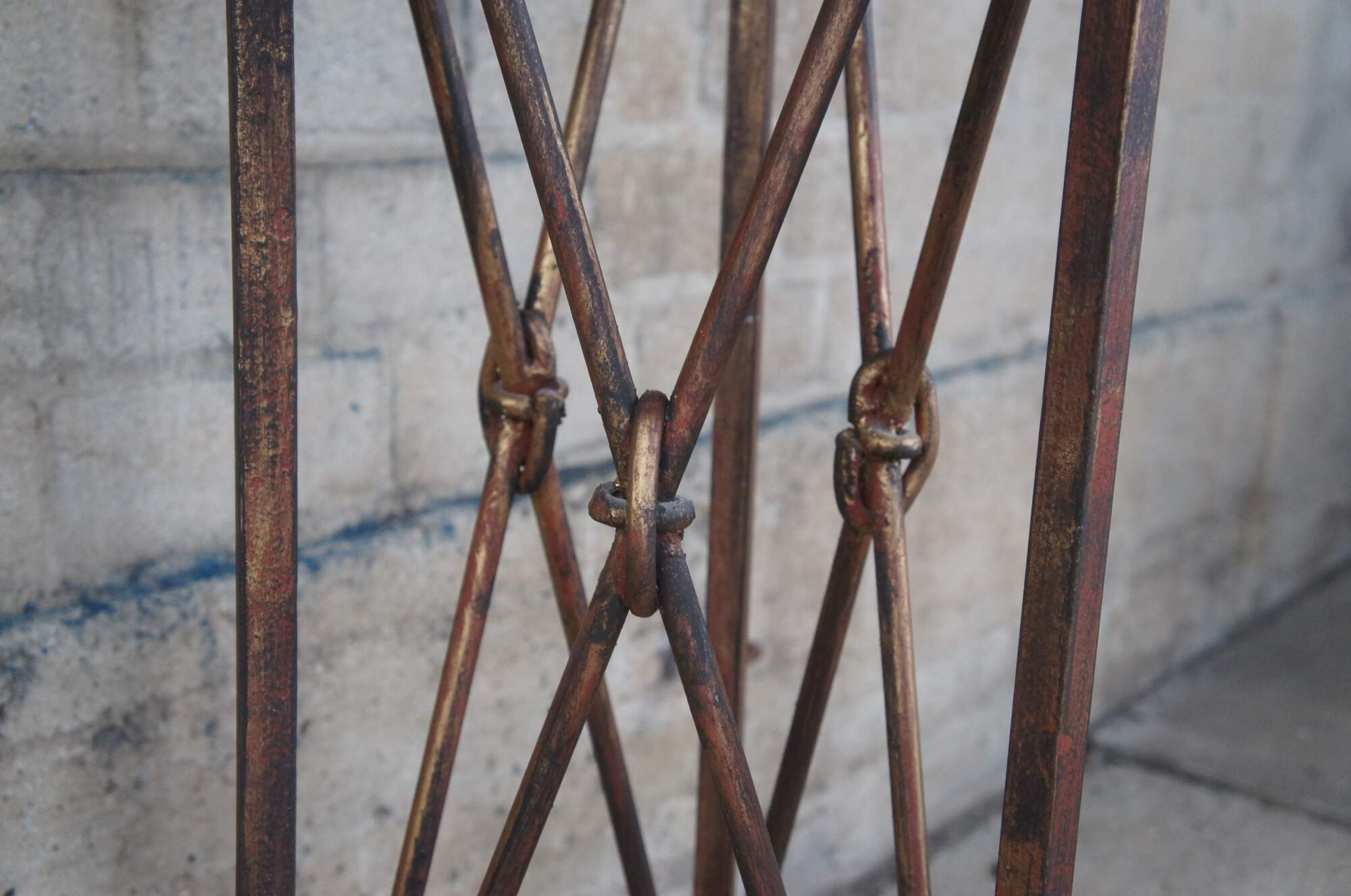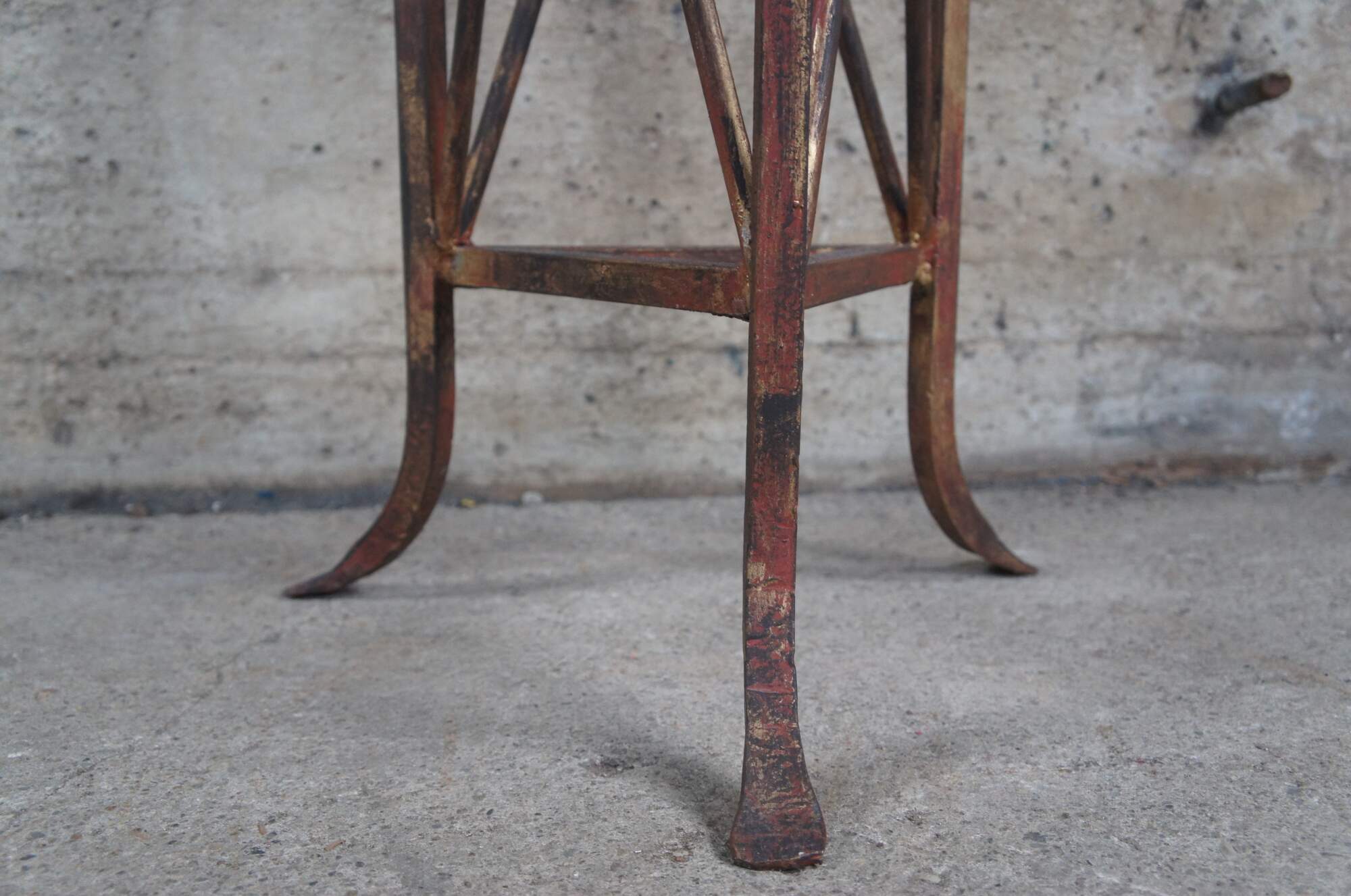 An iron pedestal in Neoclassical and French Empire styling. Features a reddish gold triangular prism form with "X" shape column over flared base. Topped with triangular tempered glass. Great for display of a culpture or vase.