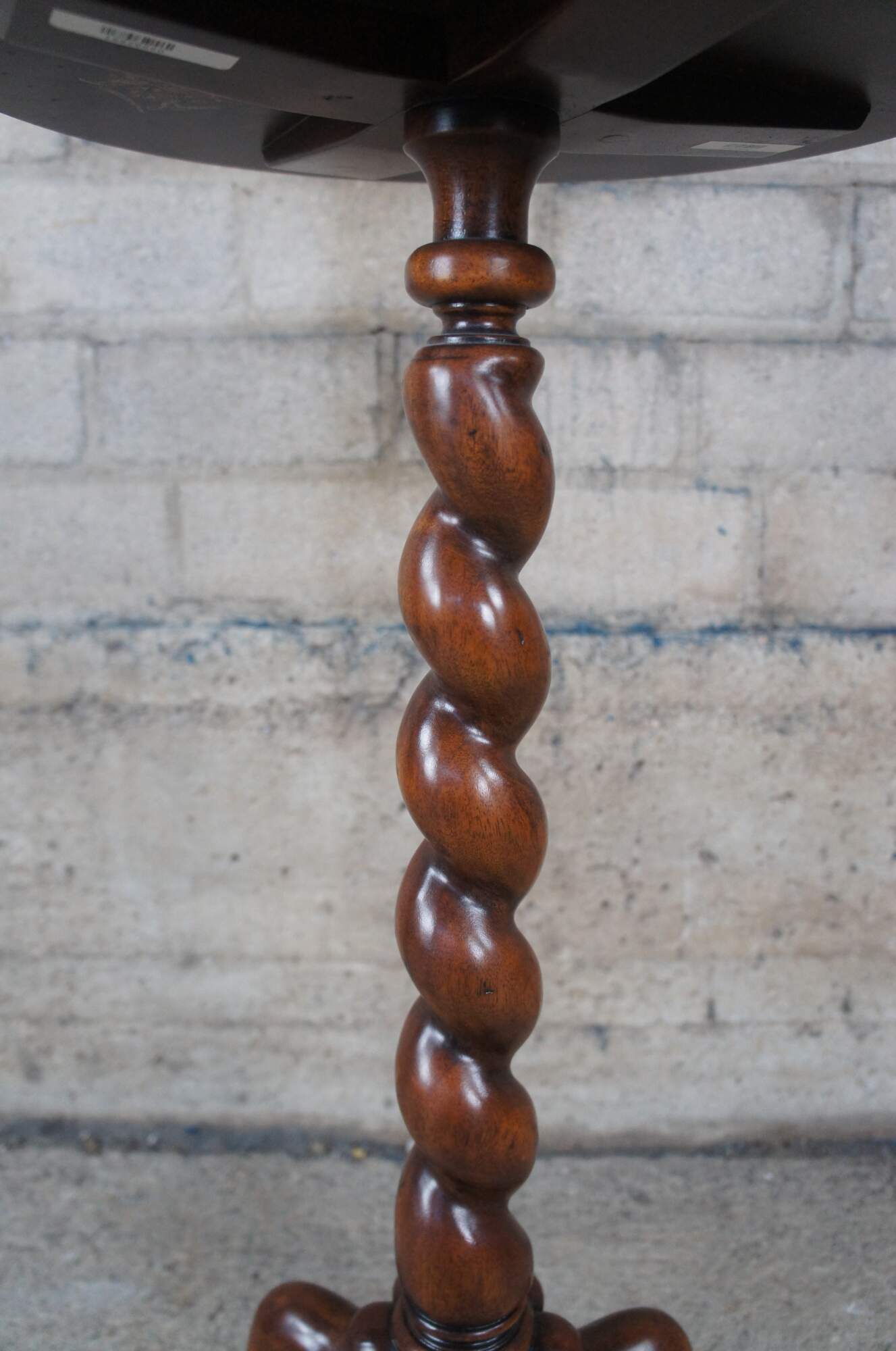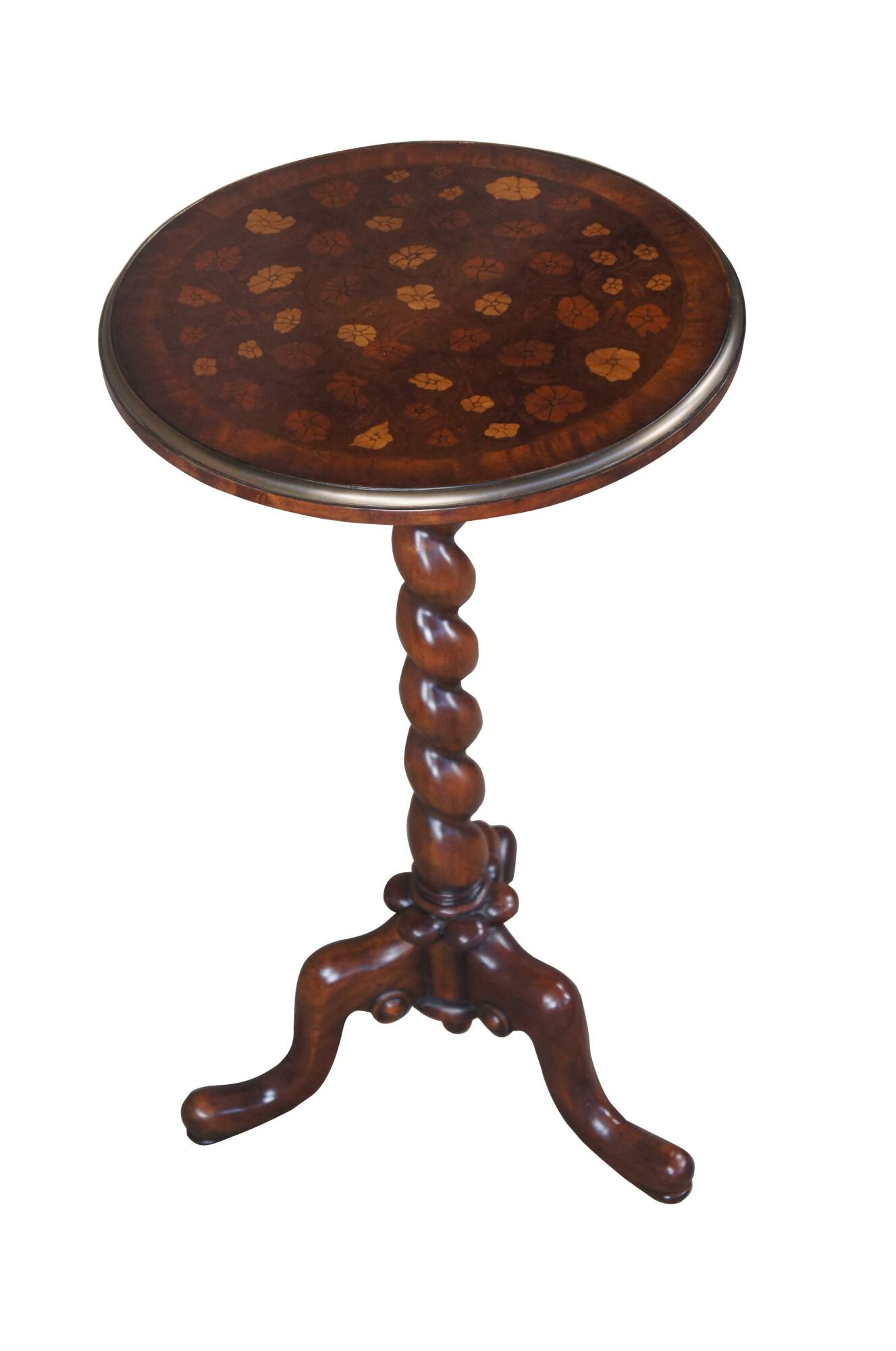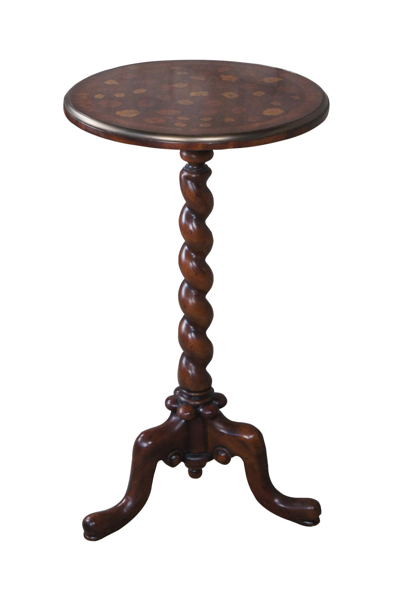 Vintage Theodore Alexander sculpture pedestal, lamp table or plant stand. Inspired by the likes of William & Mary styling which was prolific in Early Americana and Britain until the early 1700s. Made of mahogany featuring round form with brass banded floral inlaid top, barley twisted column and downswept tripod base terminating to pad feet. The base it is marked with a heraldic shield / crest with griffon / dragon.