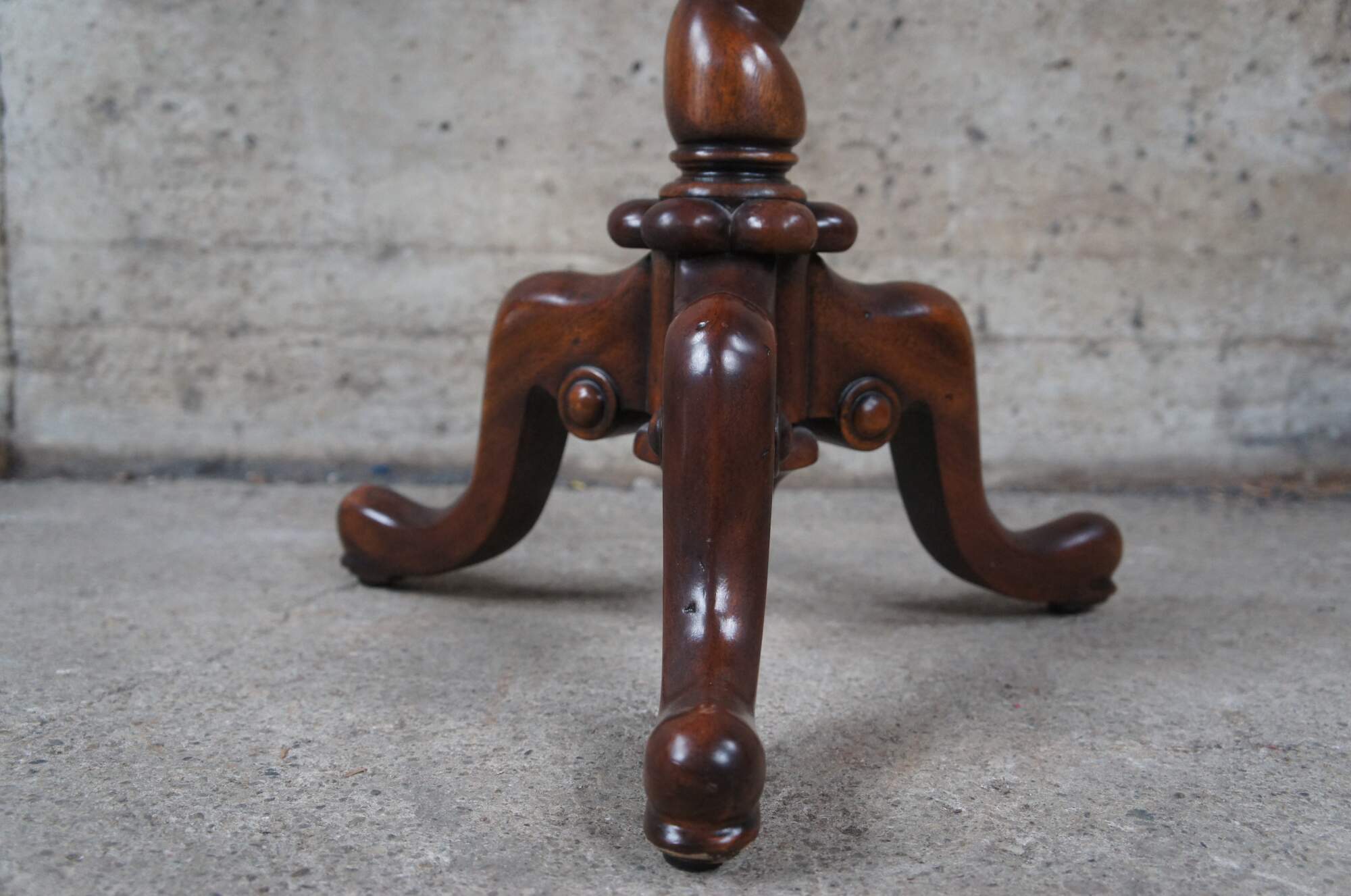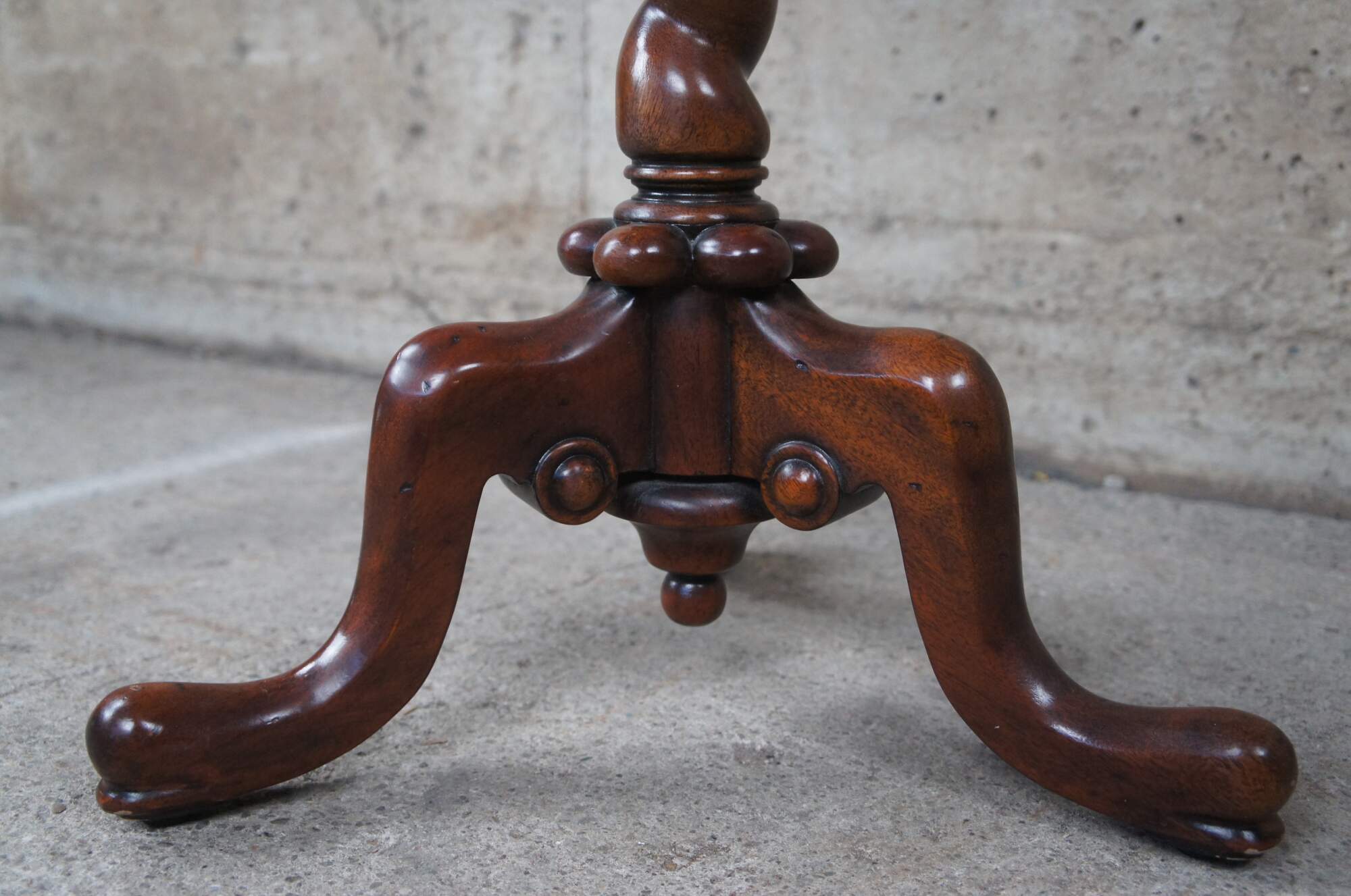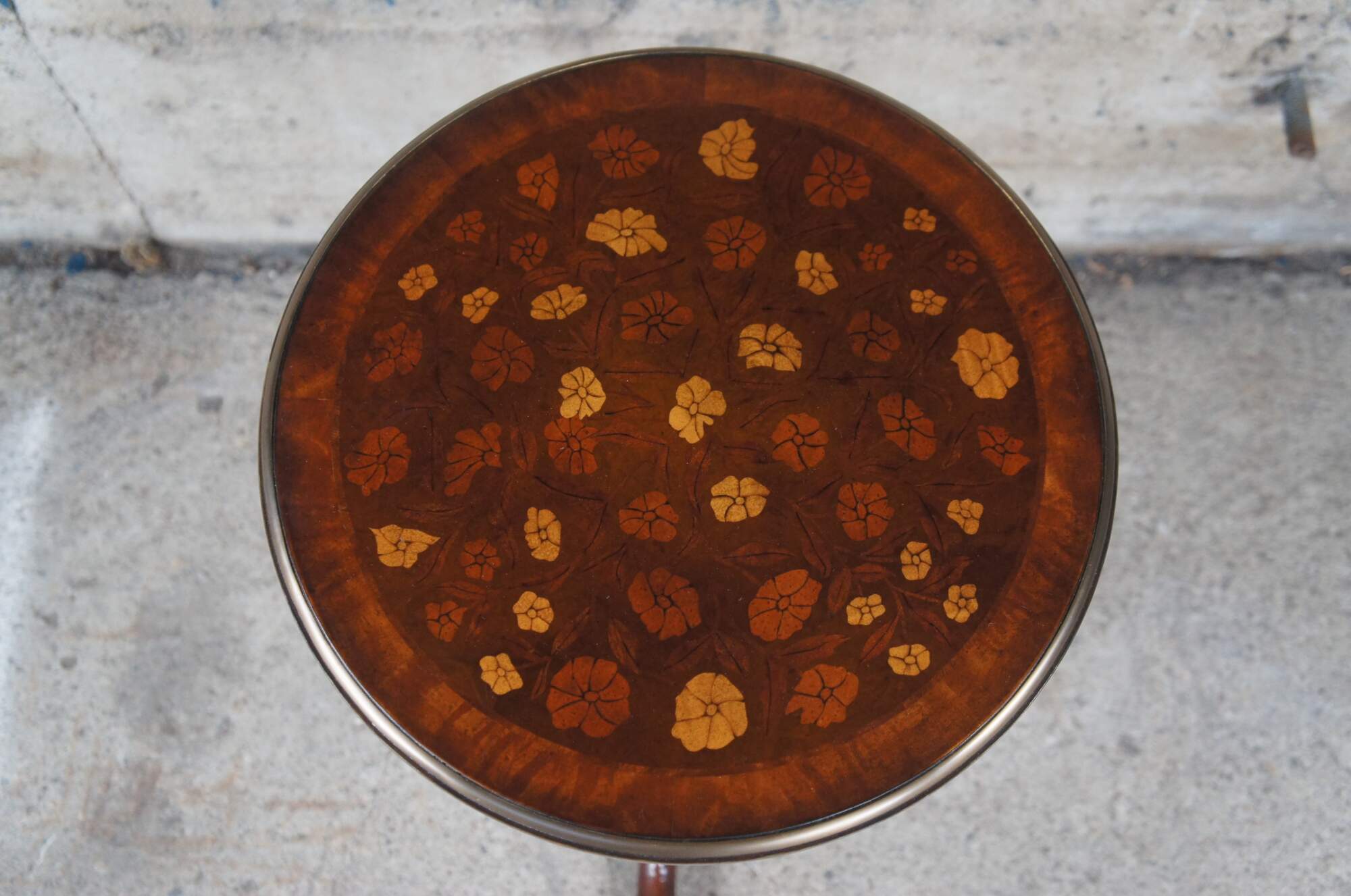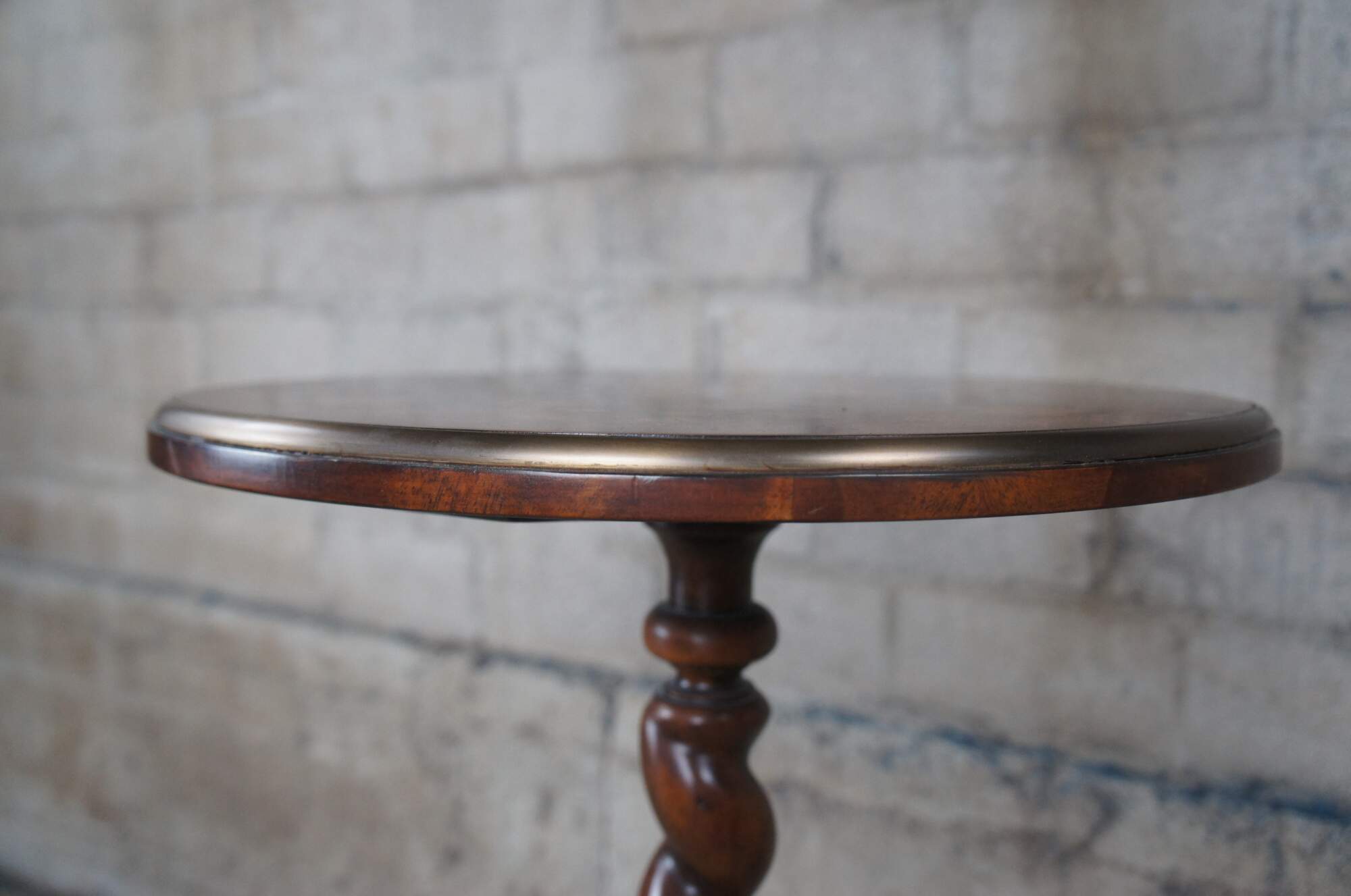 Vintage Theodore Alexander sculpture pedestal, lamp table or plant stand. Inspired by the likes of William & Mary styling which was prolific in Early Americana and Britain until the early 1700s. Made of mahogany featuring round form with brass banded floral inlaid top, barley twisted column and downswept tripod base terminating to pad feet. The base it is marked with a heraldic shield / crest with griffon / dragon.