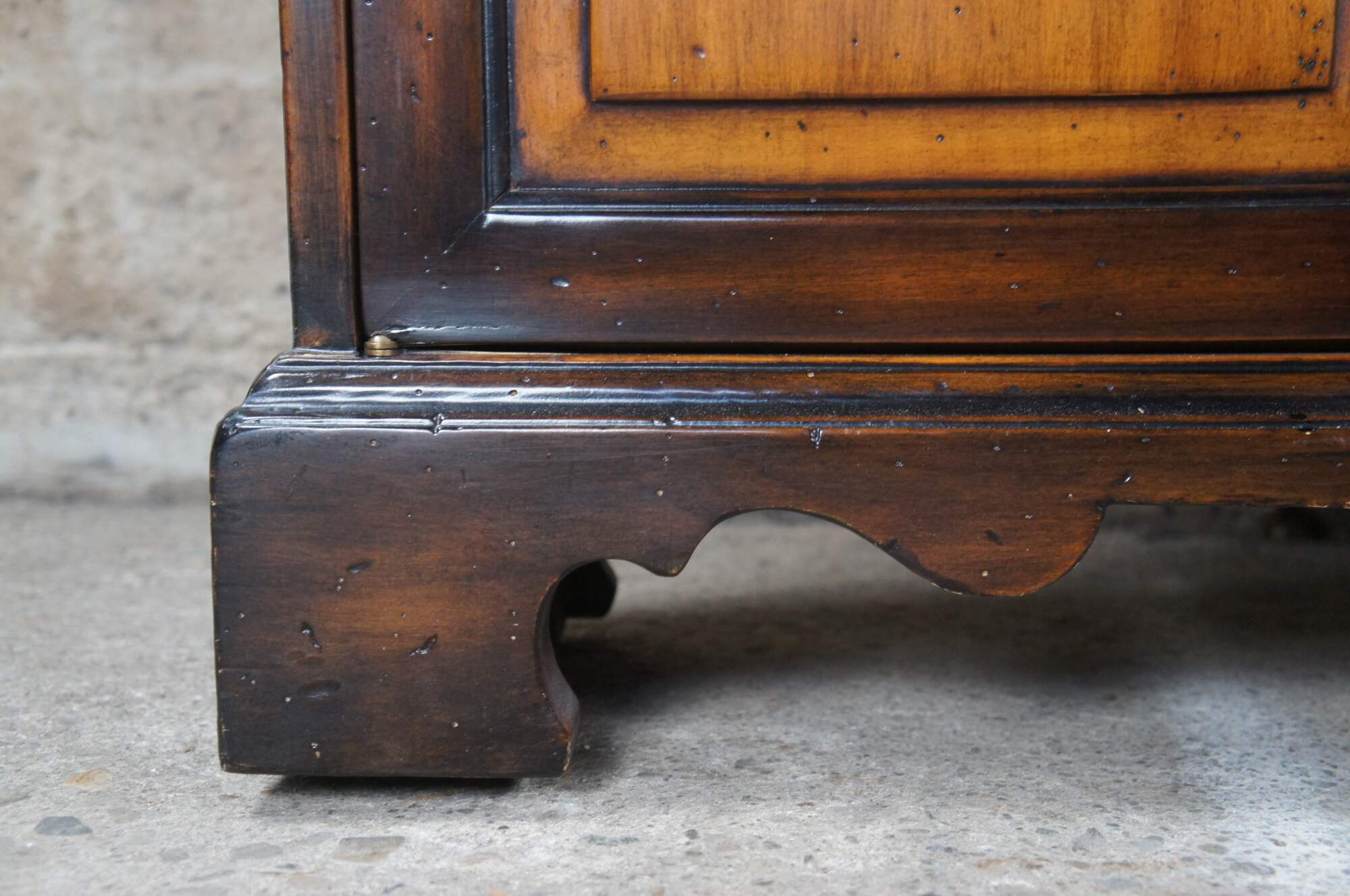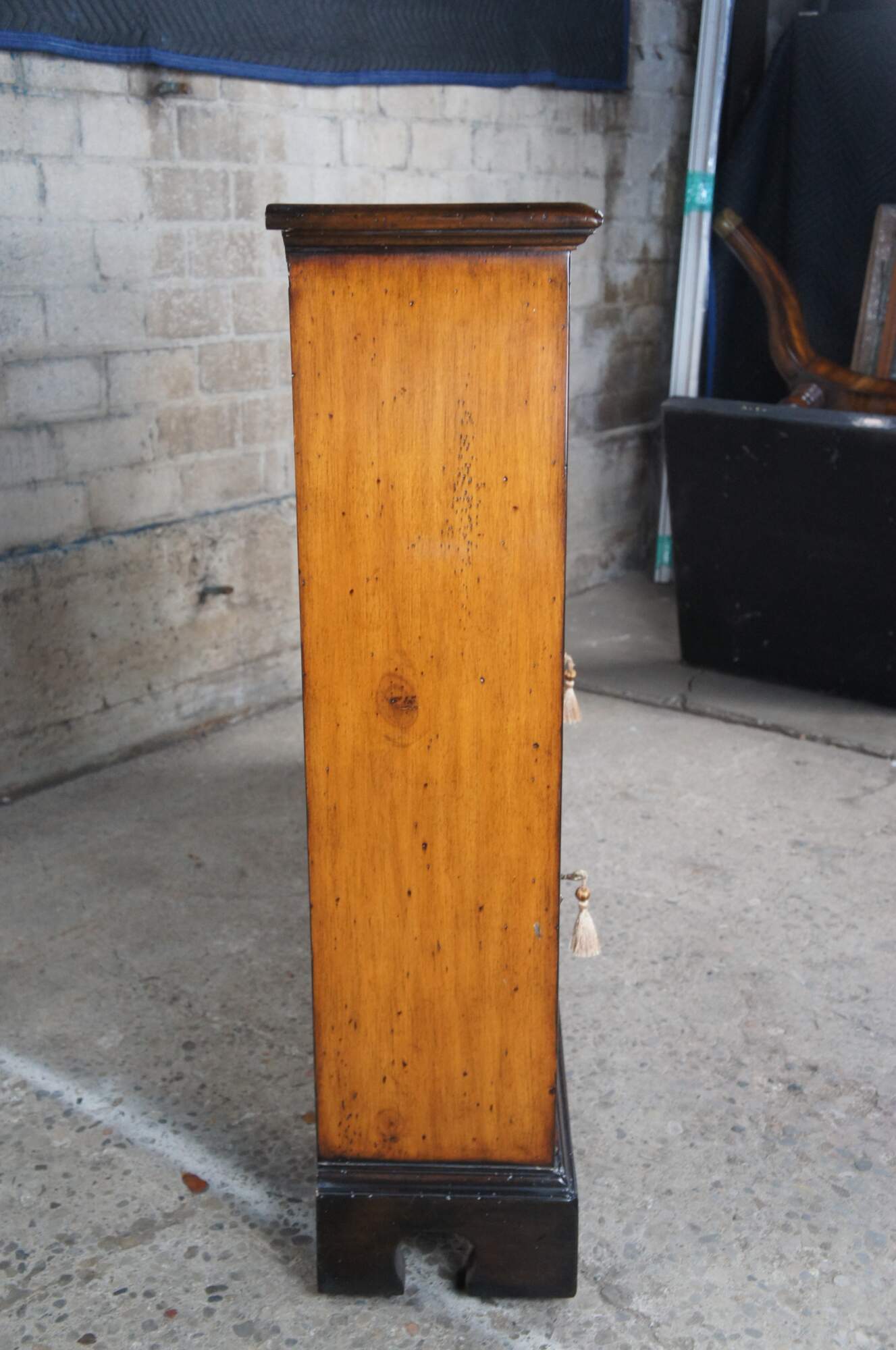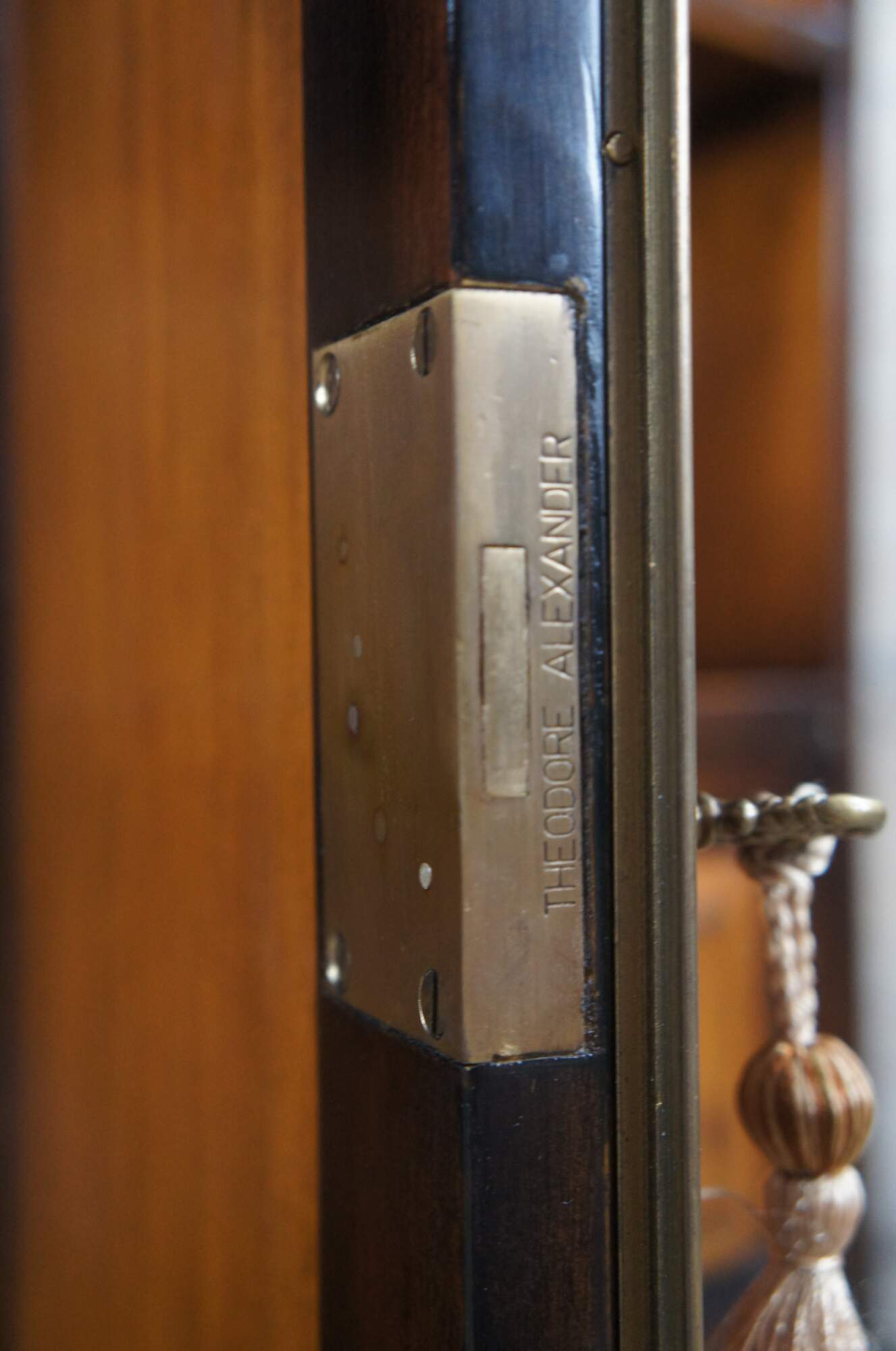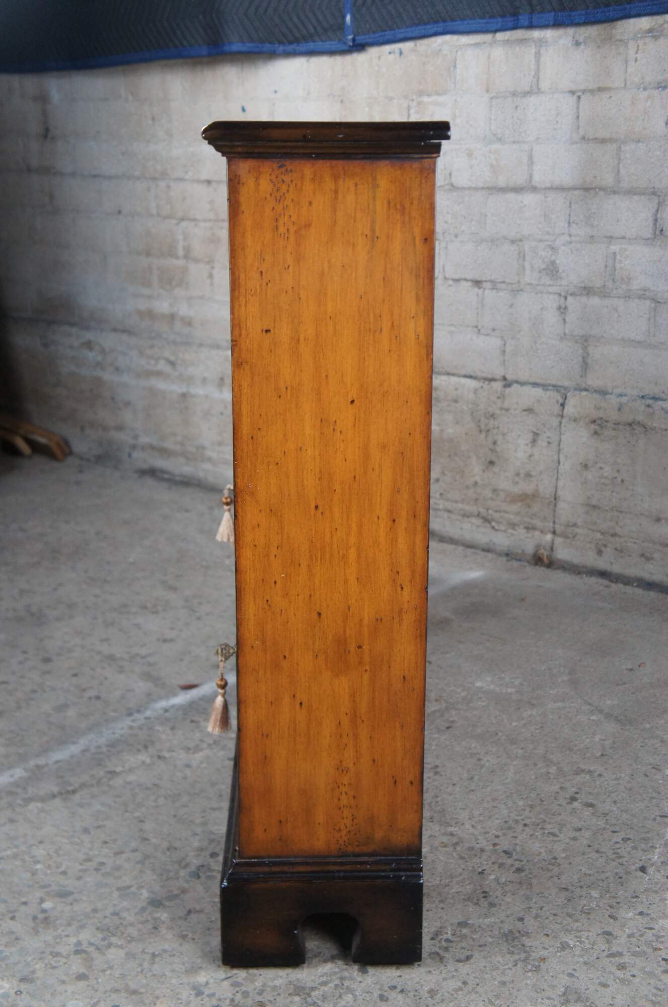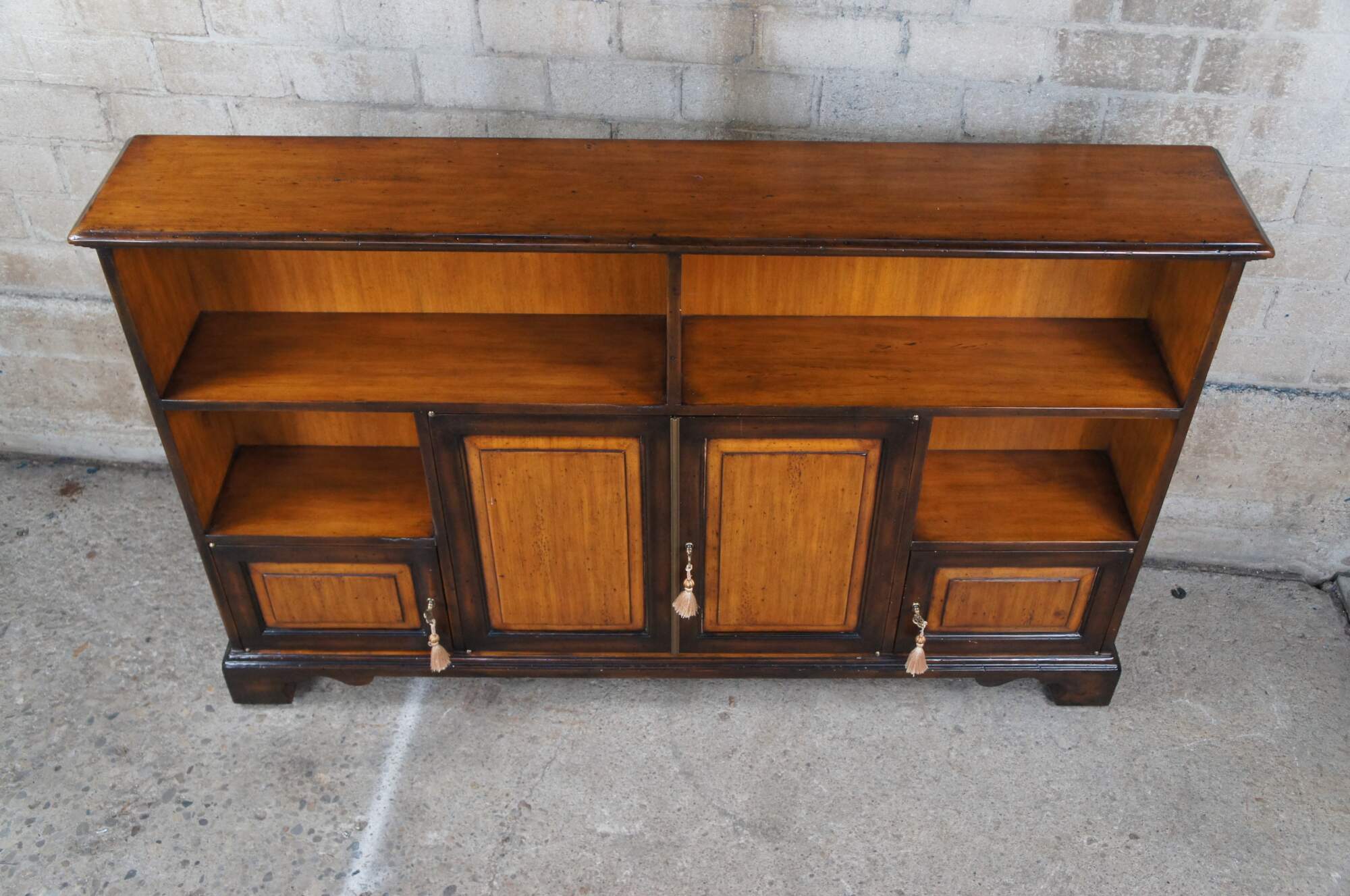 Vintage Theodore Alexander Chateau du Vallois petite console or book shelf cabinet, circa last quarter 20th century. Made of mahogany with a two tone French Provincial styling. Features a slender rectangular frame with cubbies for books or collectibles and three lower lockable cabinets for accessory storage. The case is supported by bracket feet. Marked Chateau du Vallois along backside with brass plaque.