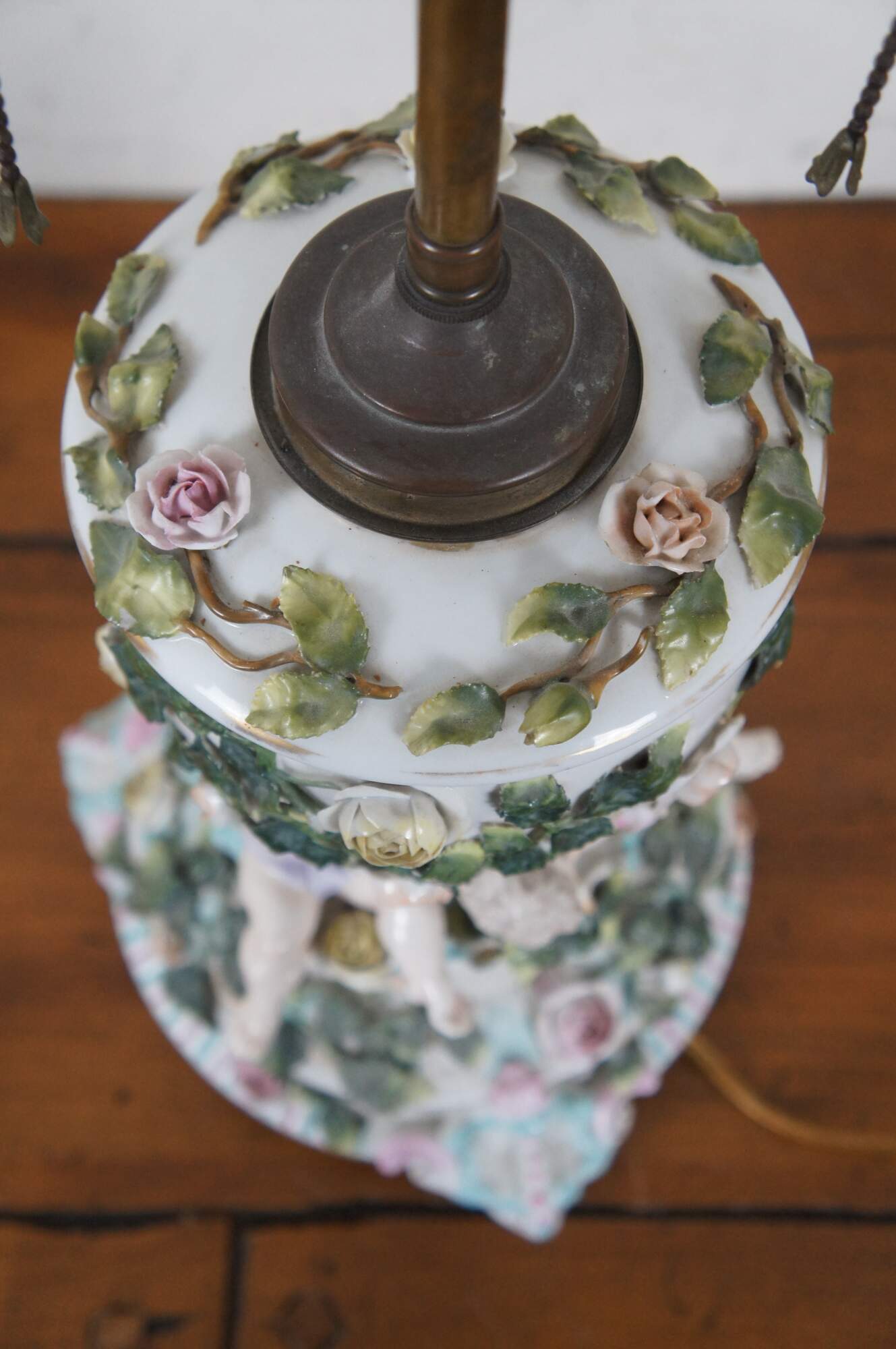Antique German Sitzendorf Dresden converted oil lamp mantel trophy urn featuring a design of climbing roses and reclining cherubs. Marked on base with crossed lines, circa 1884 - 1902. Includes round white scalloped edge shade with braided trim.