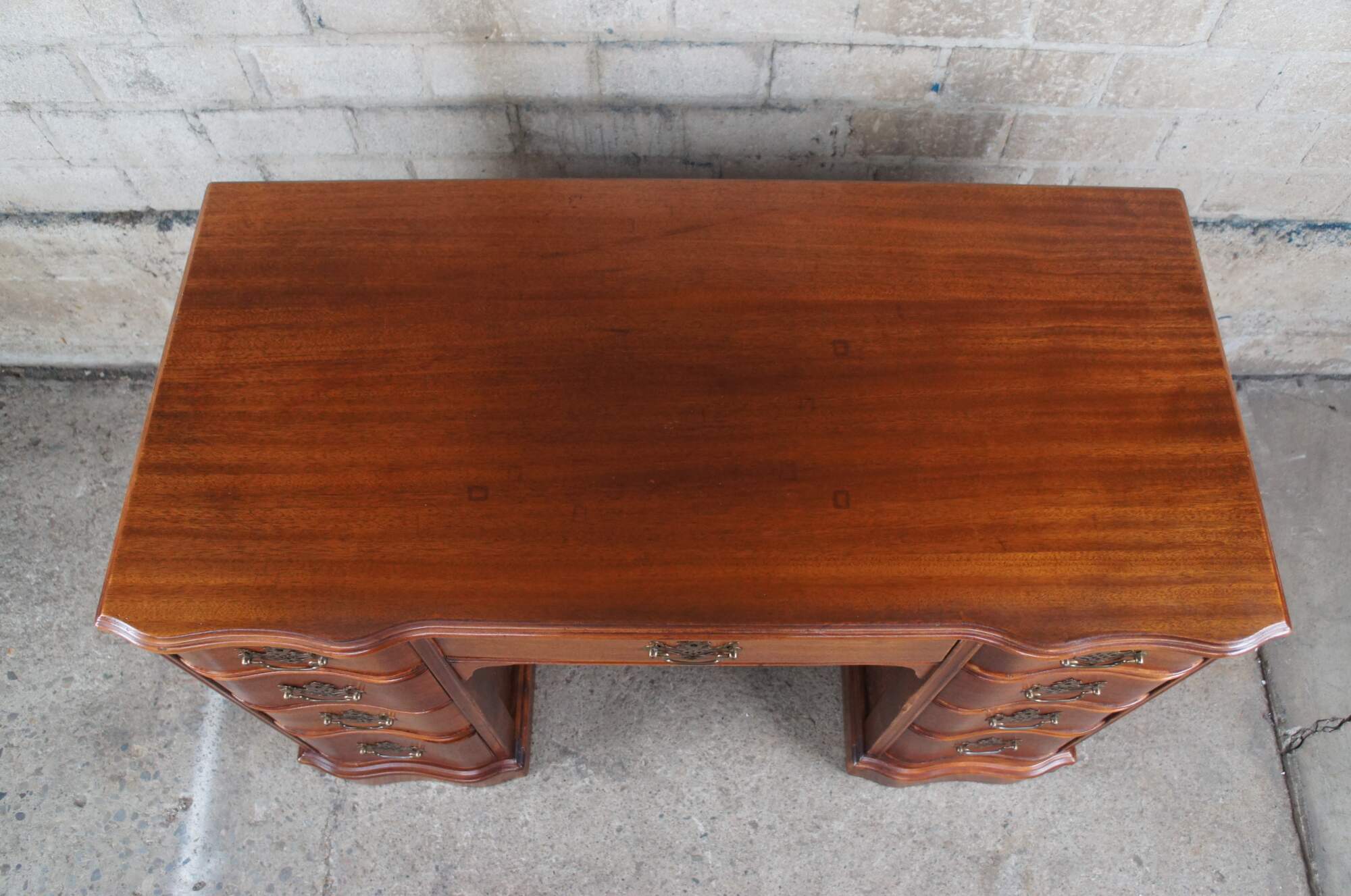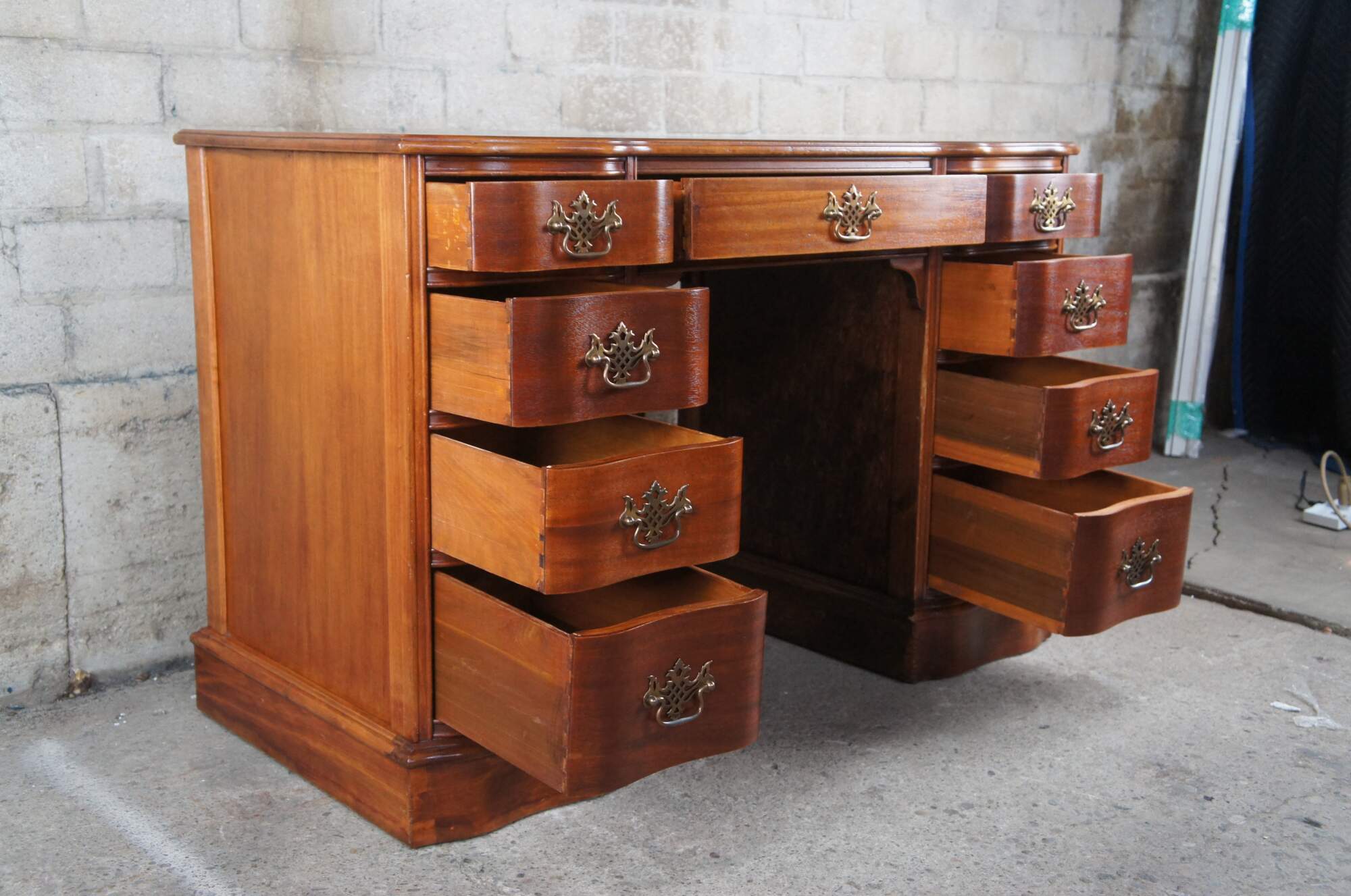 Antique Chippendale library writing desk. Made of mahogany featuring serpentine rectangular form with nine dovetailed drawers and pierced brass hardware.