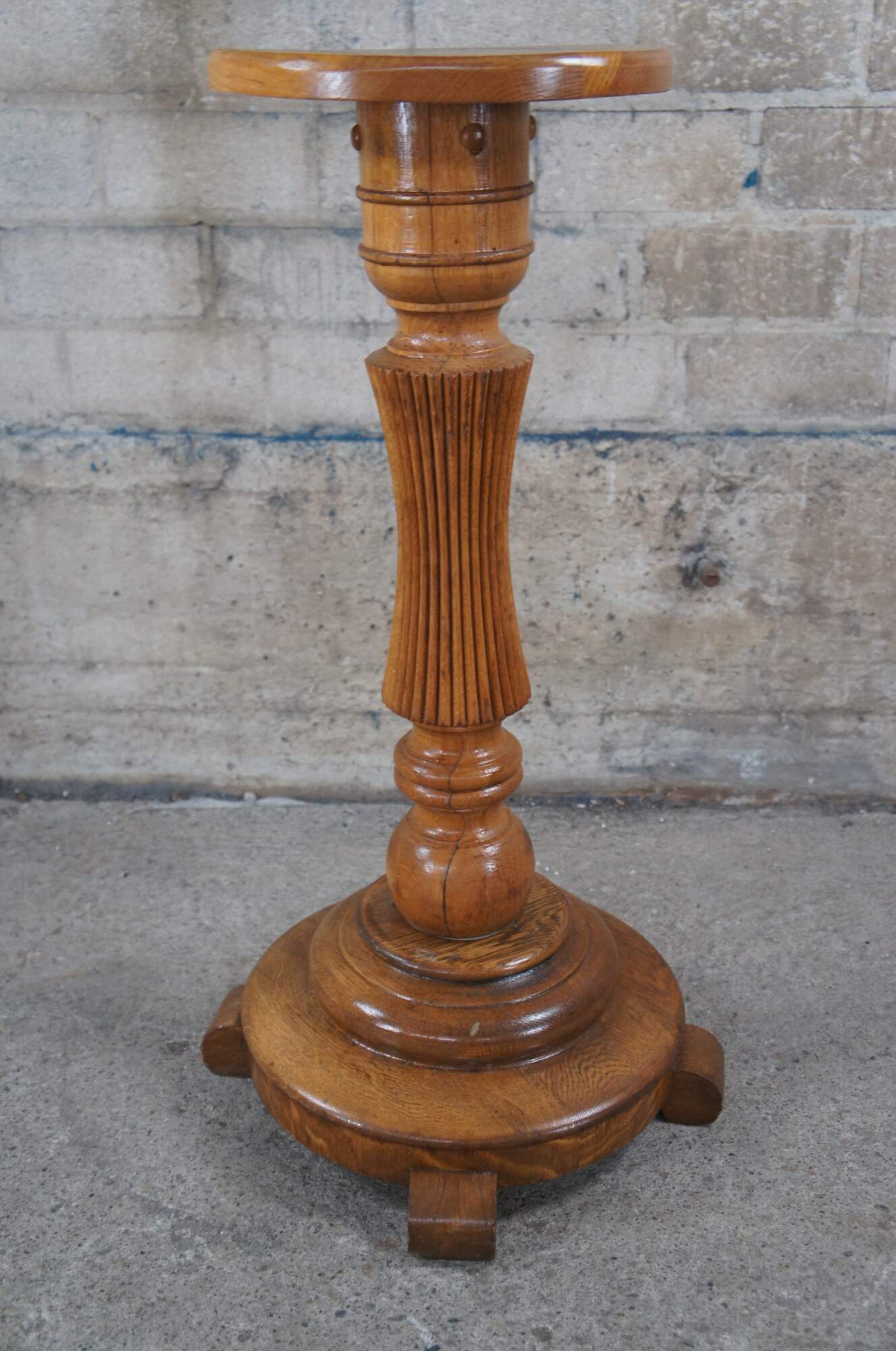 Victorian era oak pedestal, circa late 19th century. Features a beautifully turned column with reeded center over tiered and footed base. Great for display of plants and sculptures.