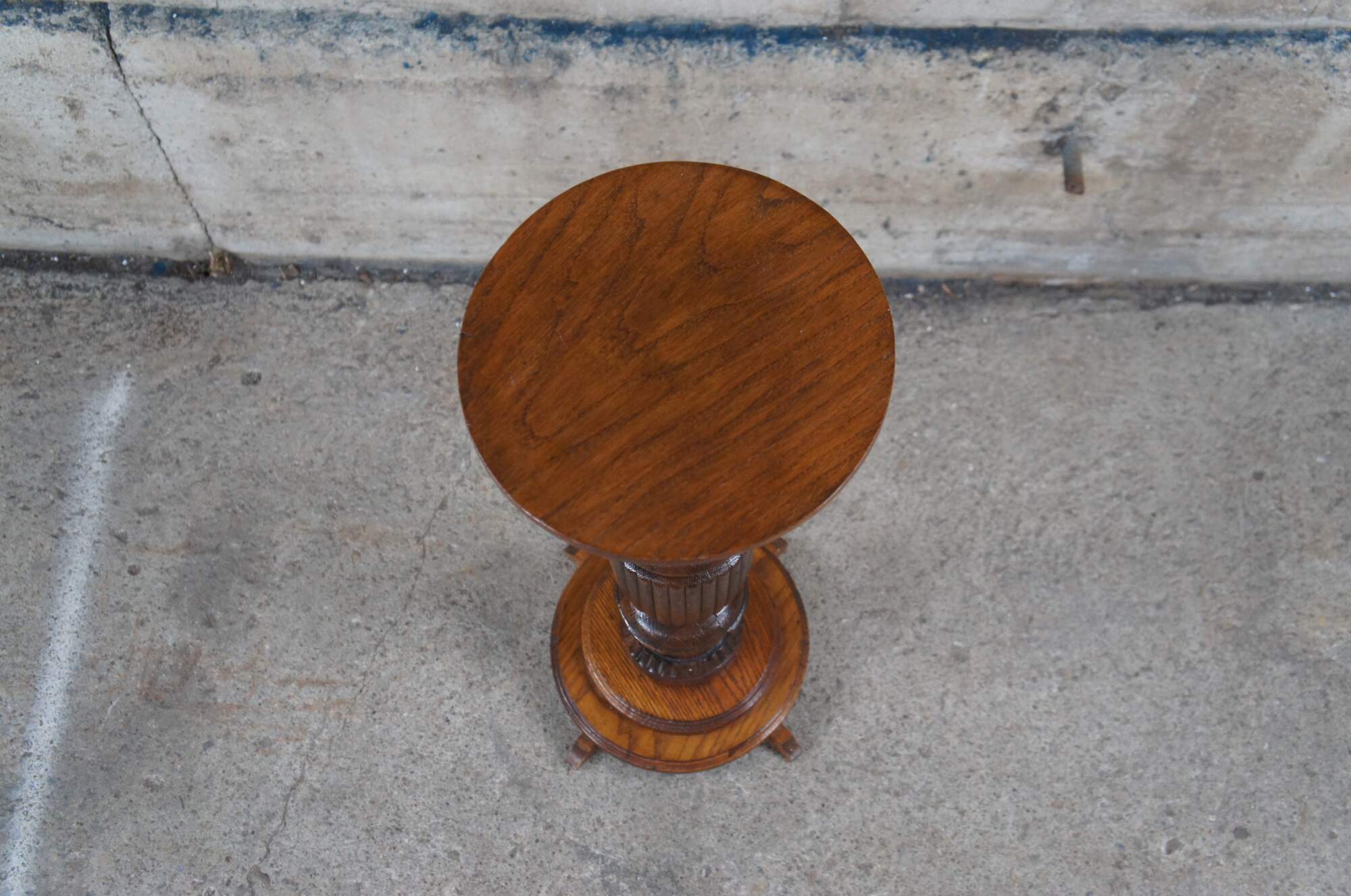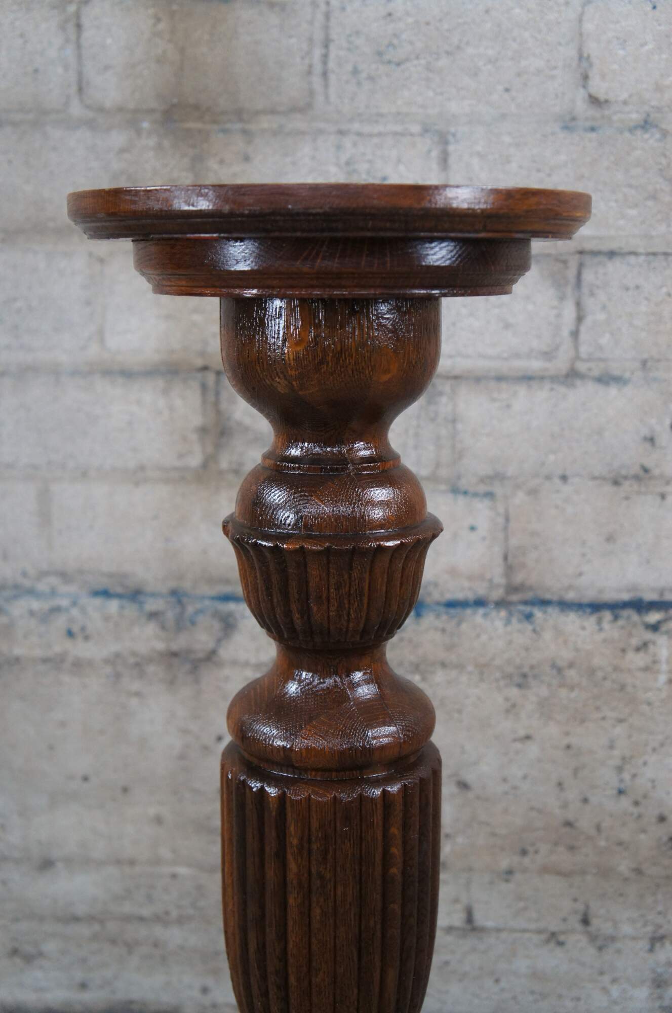 Victorian era oak pedestal, circa late 19th century. Features a beautifully turned column with reeded center over tiered and footed base. Great for display of plants and sculptures.