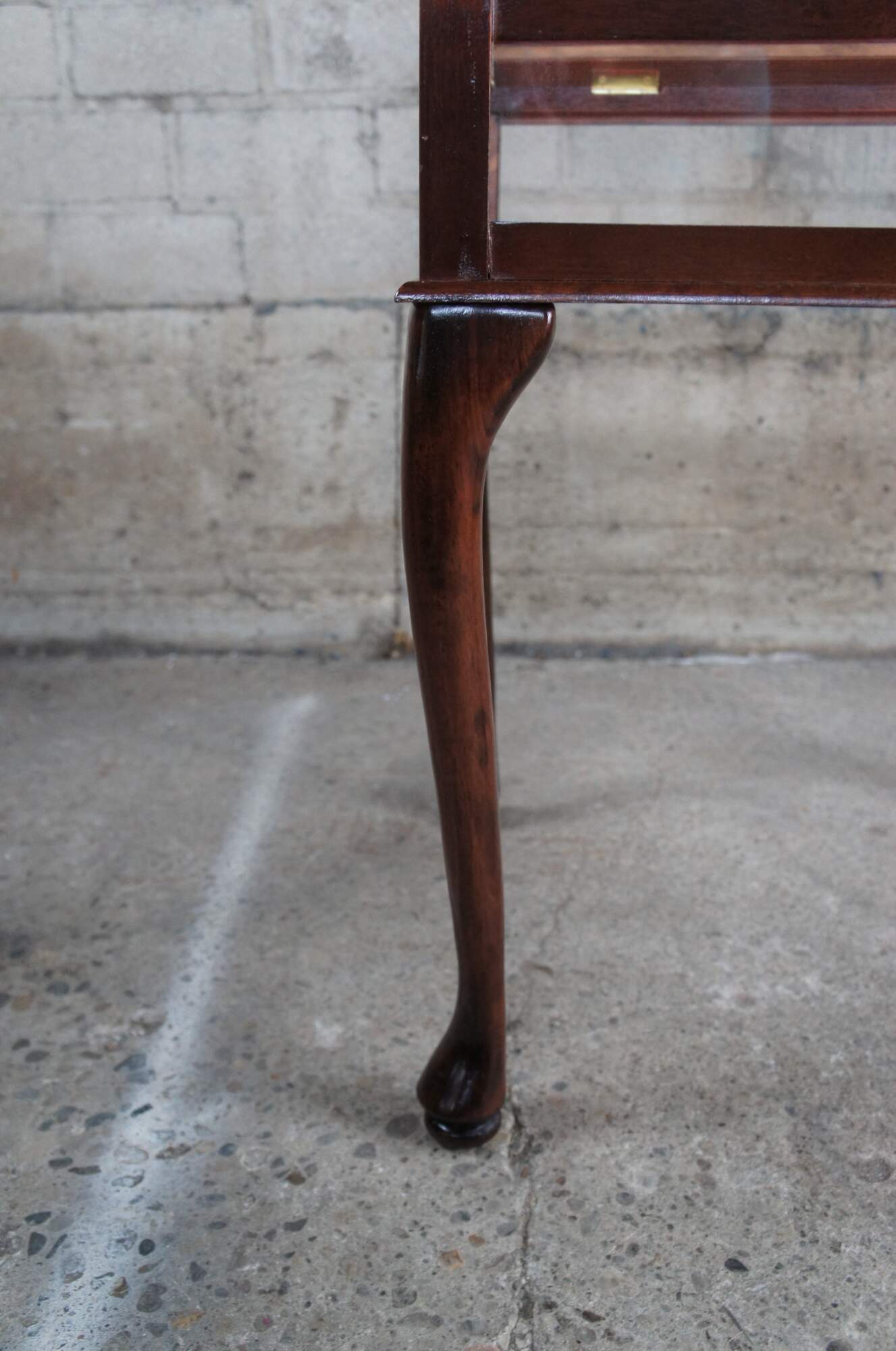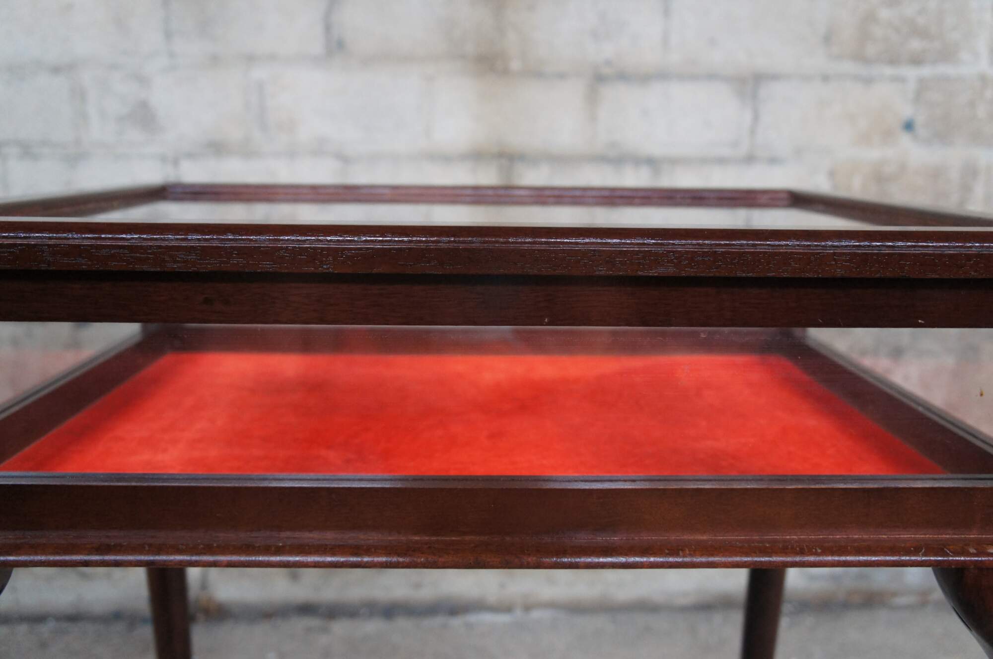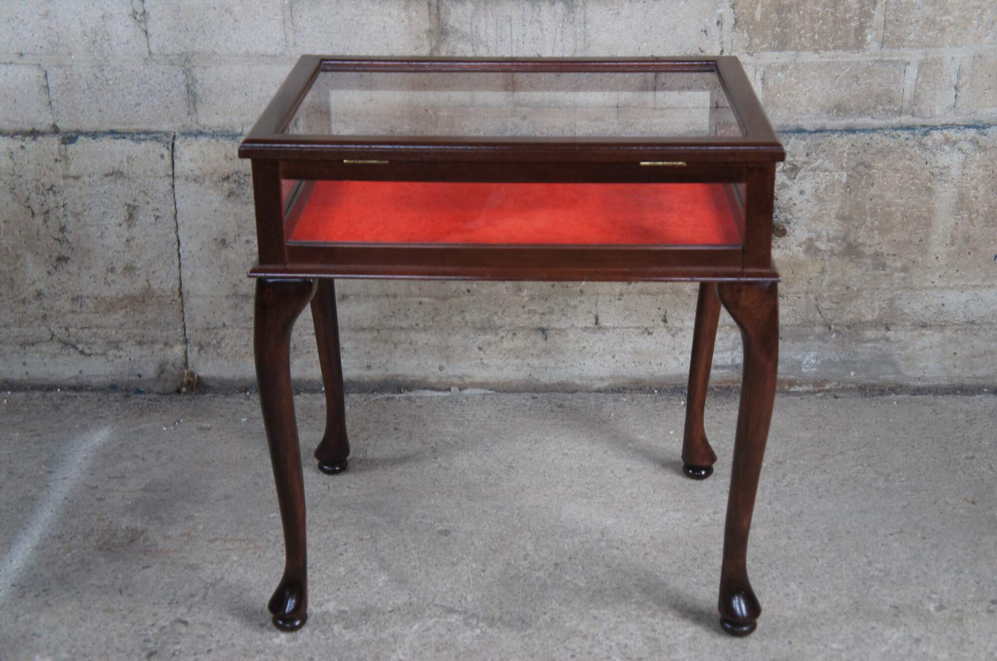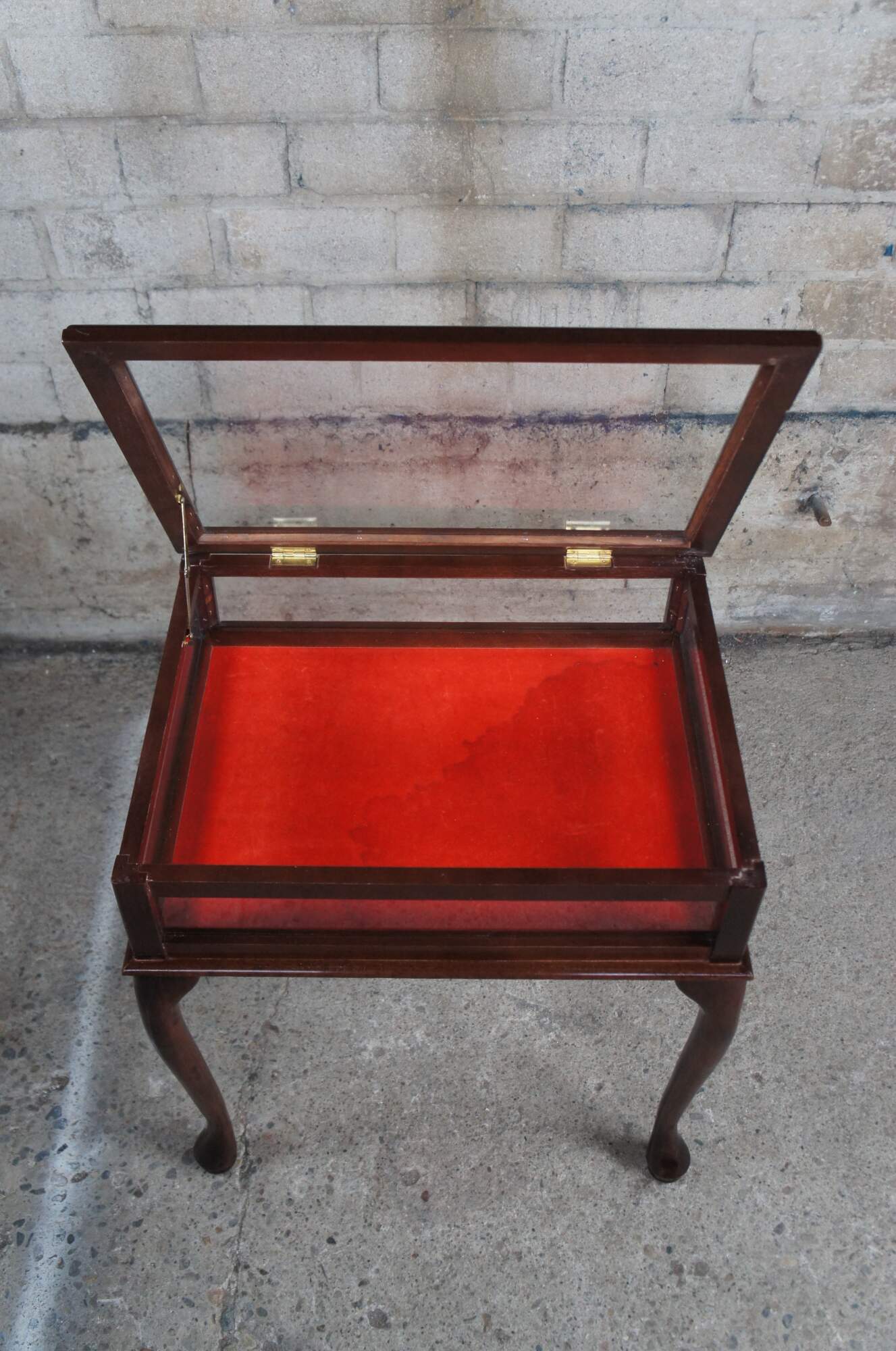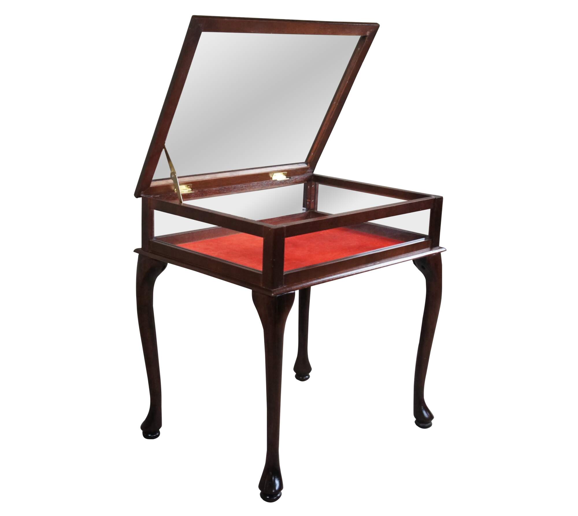 Vintage queen anne style Bijouterie / Vitrine / Curio Display table. Made of mahogany featuring glass sides and top with red felt insert and serpentine legs.