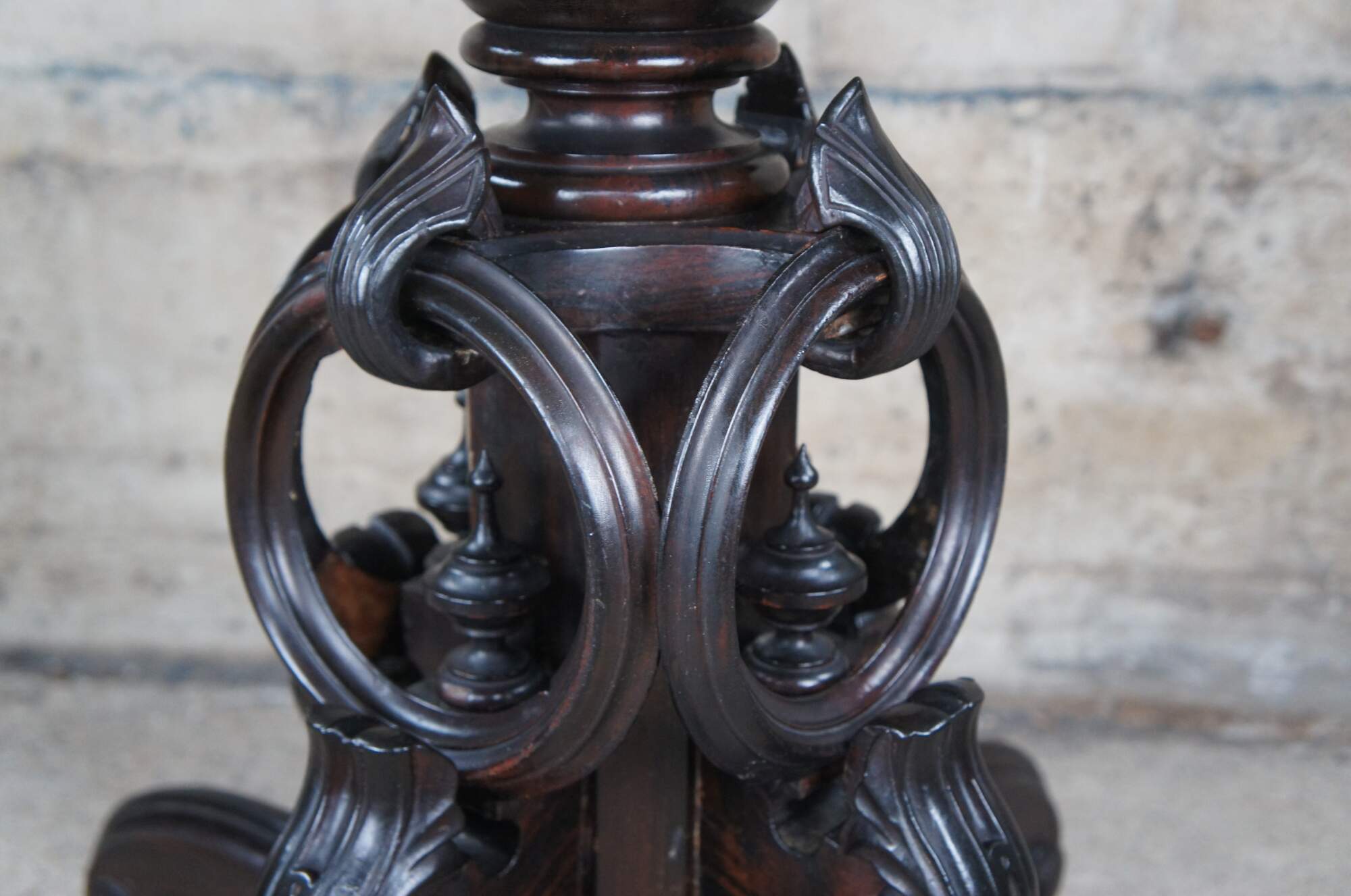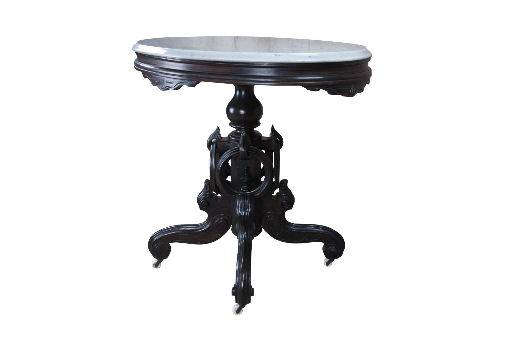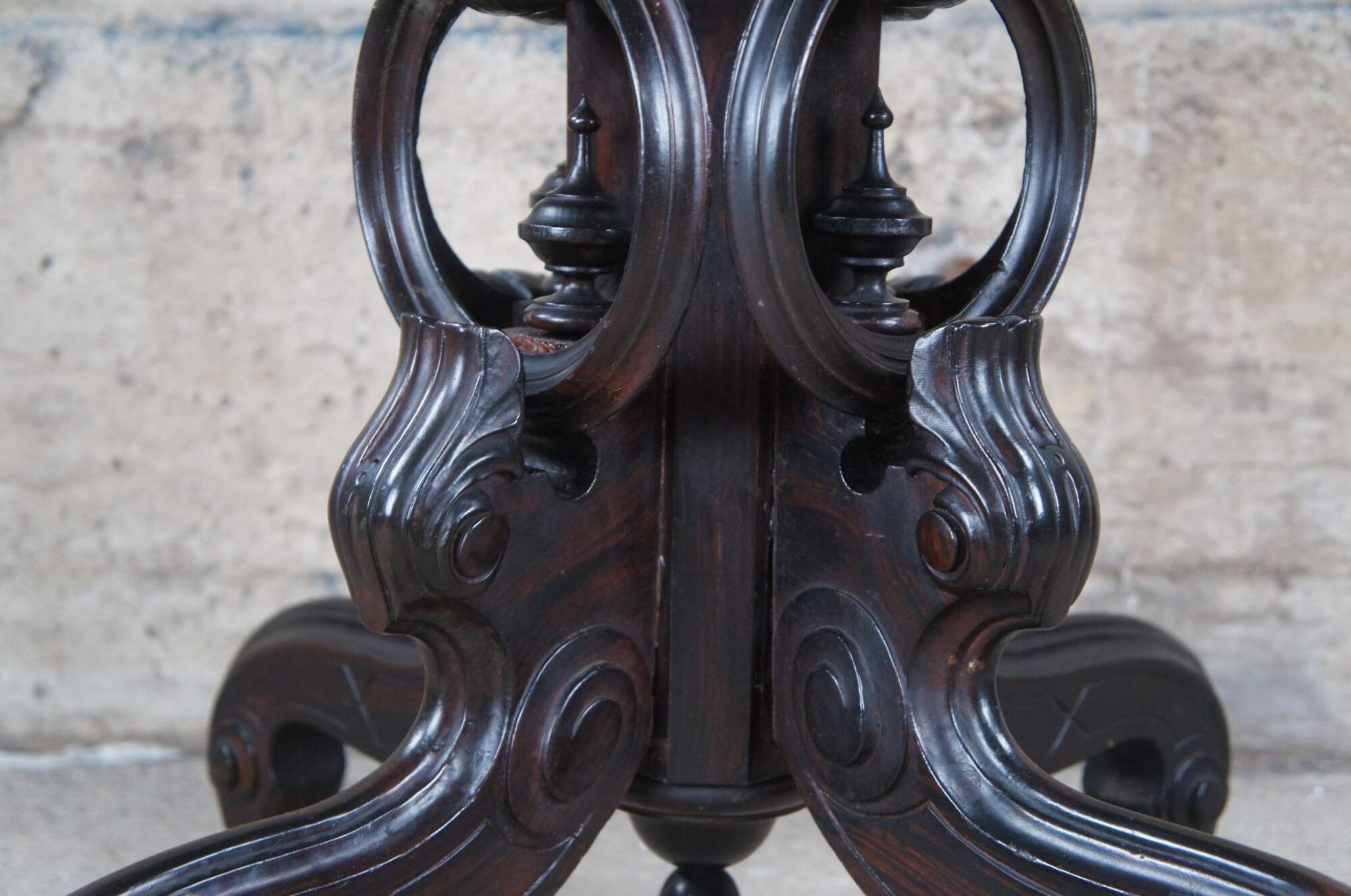 Antique Victorian Eastlake parlor table with Rosewood painted grain finish featuring an oval top with beveled edge over acanthus leaf accents, rings, finials, and serpentine legs.