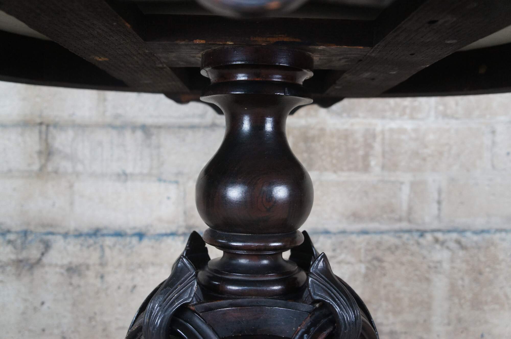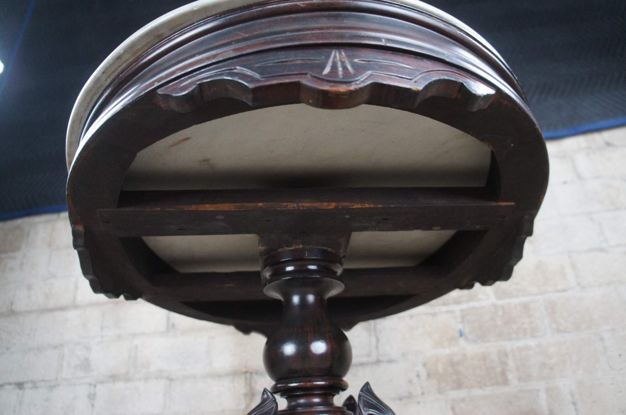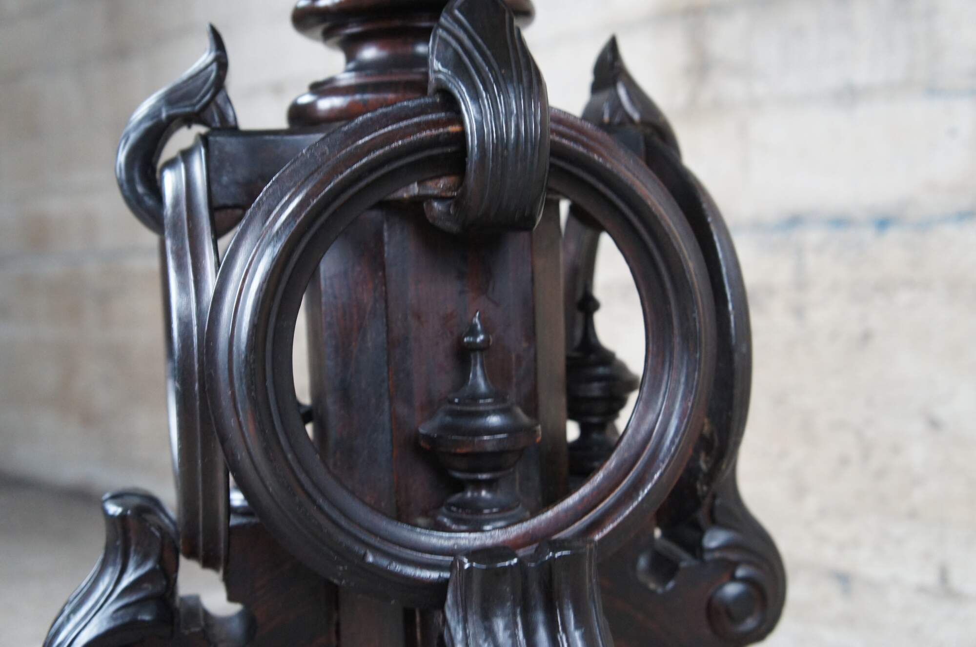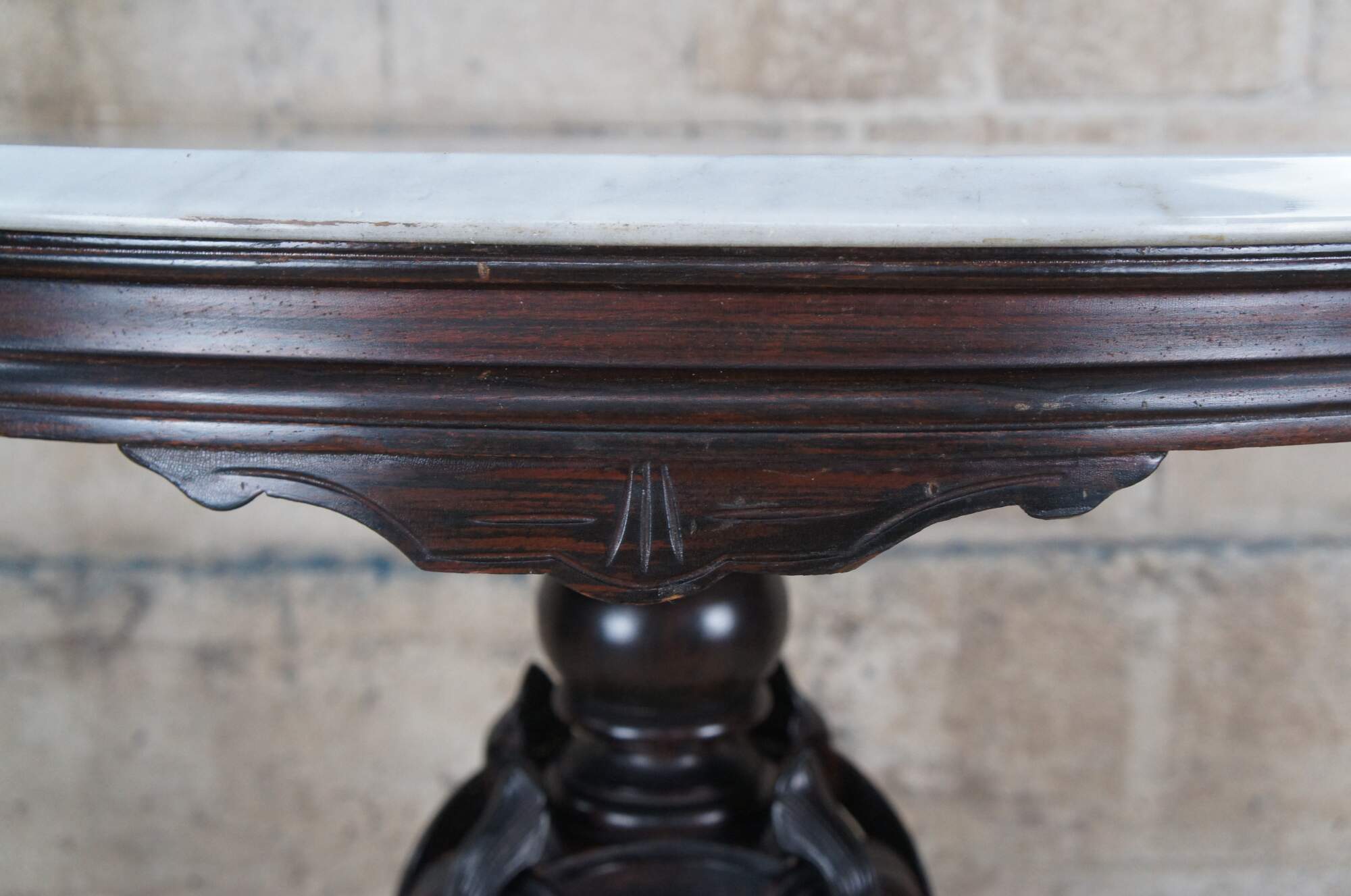Antique Victorian Eastlake parlor table with Rosewood painted grain finish featuring an oval top with beveled edge over acanthus leaf accents, rings, finials, and serpentine legs.