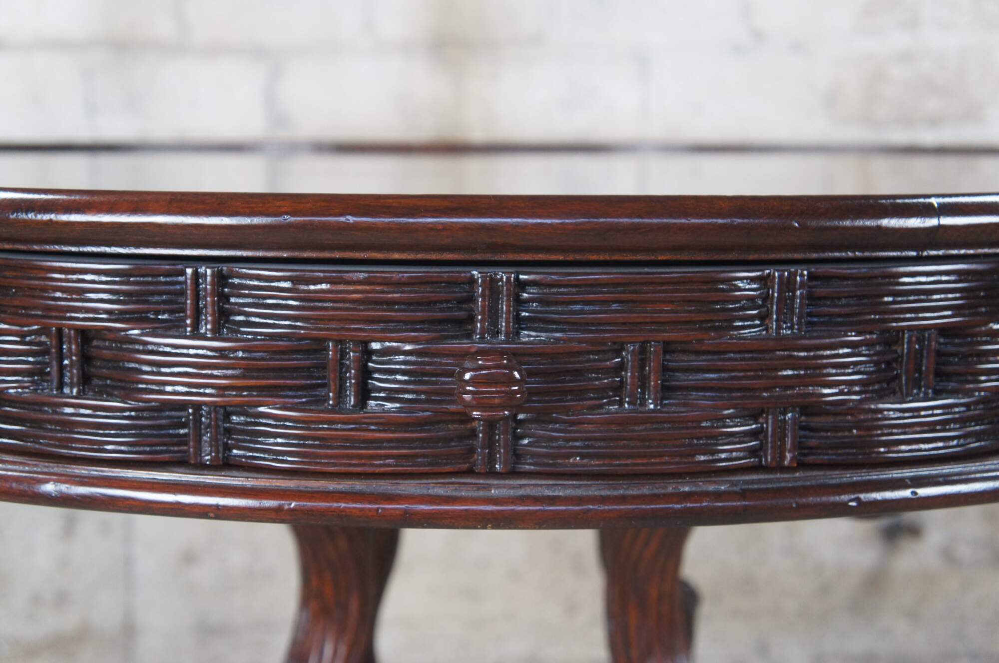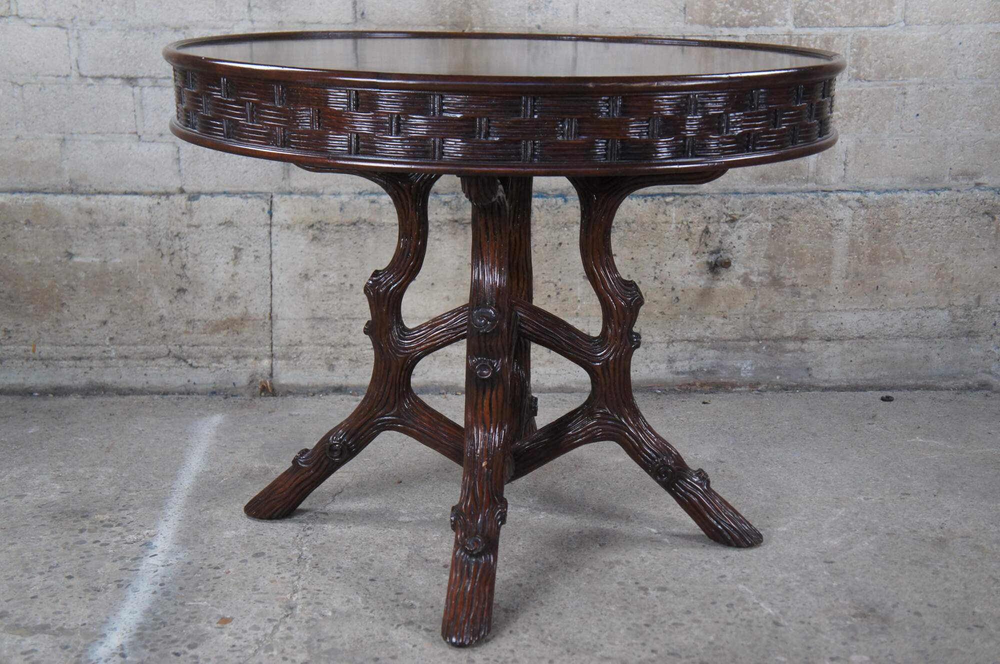 Vintage EJ Victor for Ralph Lauren modern adirondack center table, circa last quarter 20th century. Made from oak with a wram brown finish. Features a round top with molded basketweave edge and one drawer, over a freeform tree or log molded base. An amazing find as these tables rarely make it to market.