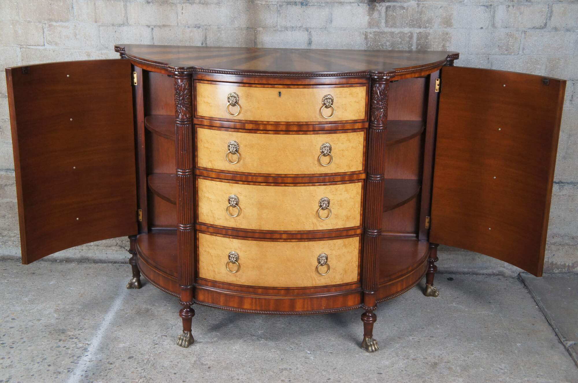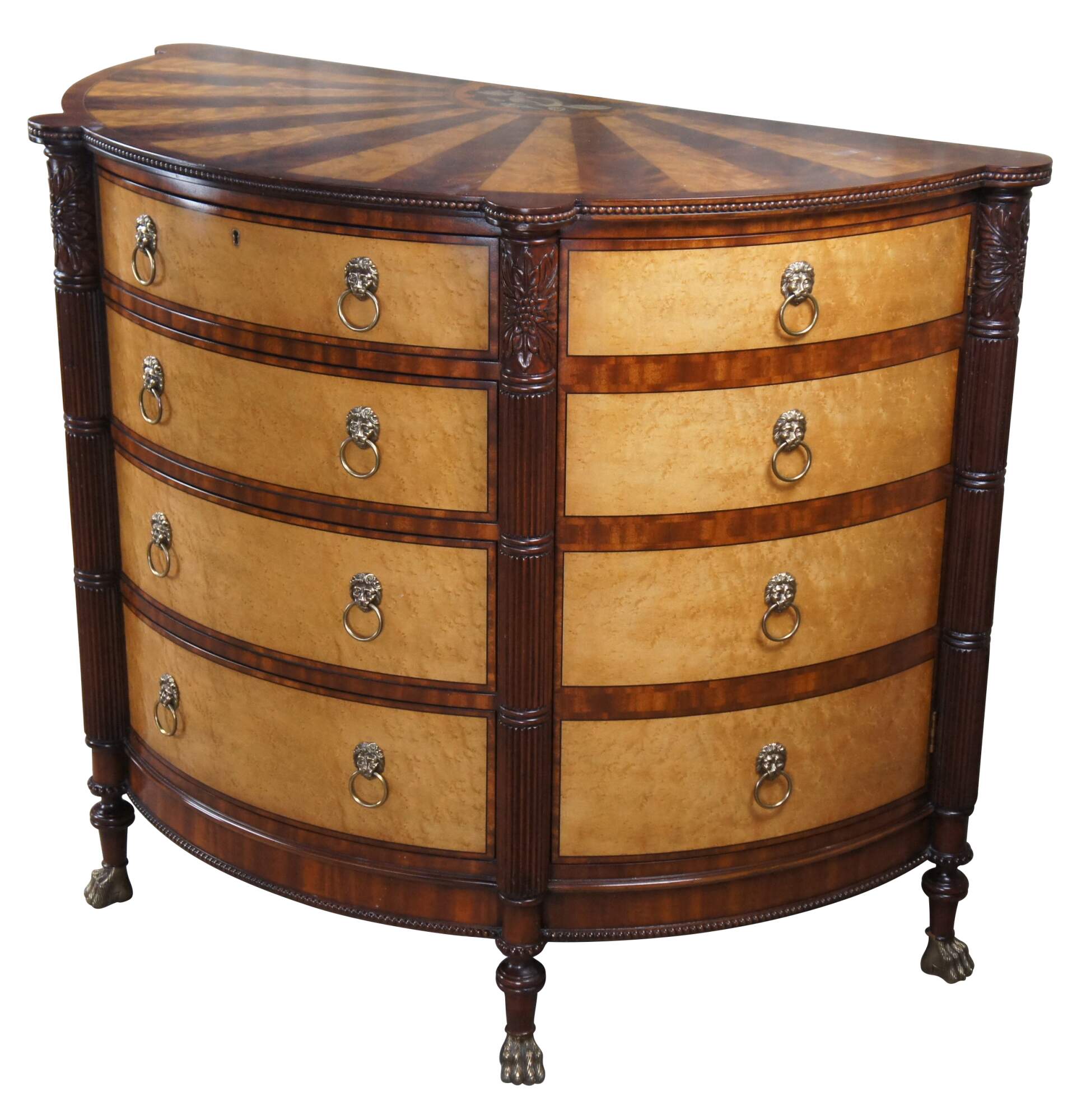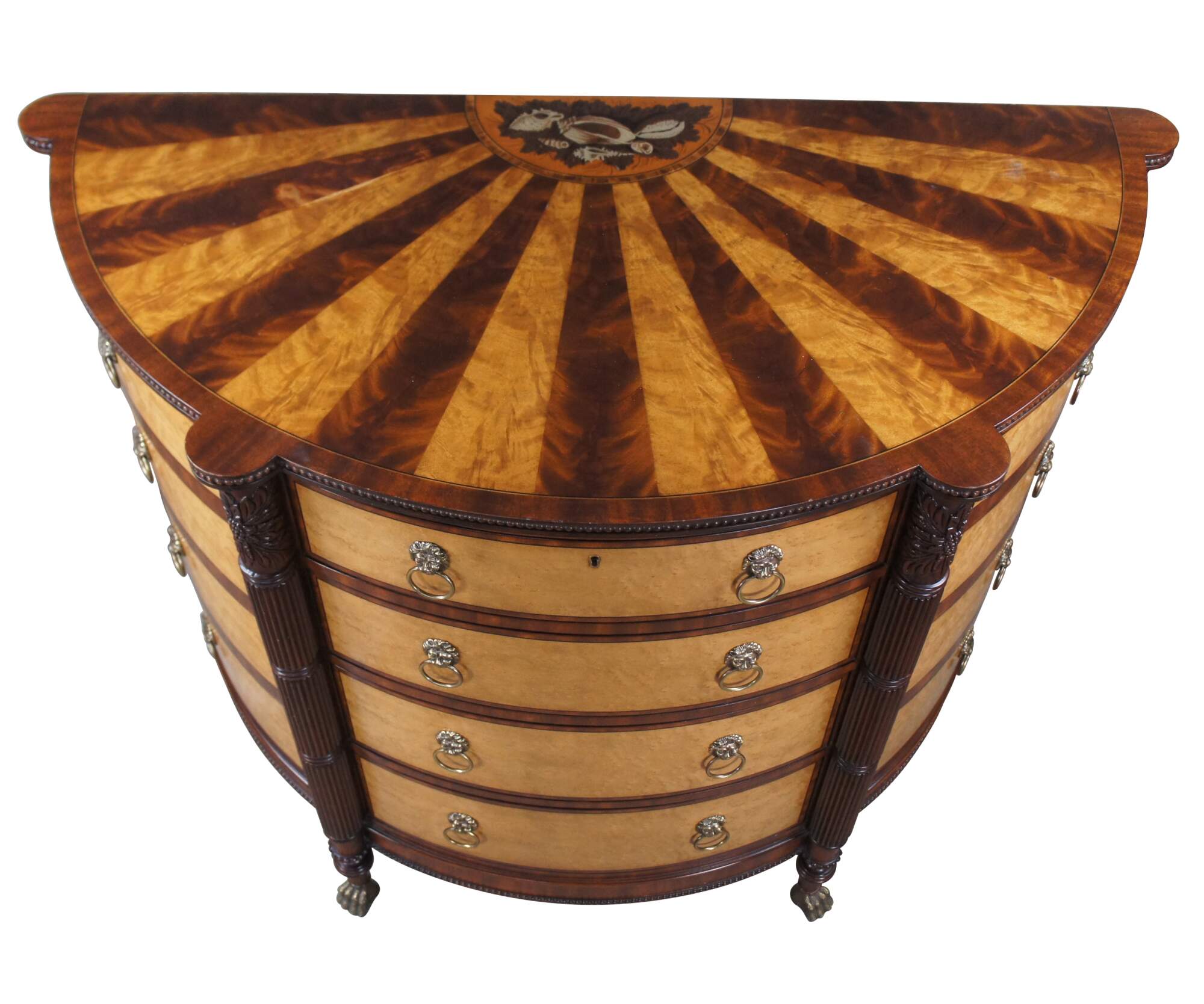A rare and impressive commode by Harold Ionson. Made of birdseye maple, satinwood and Honduras mahogany, featuring a half round / bow front with four drawers, two side cabinets, brass paw / claw feet and supurb sunburst / starburst top with nautical sea shell and cartusche theme. Includes silverwear insert by EJ Victor.