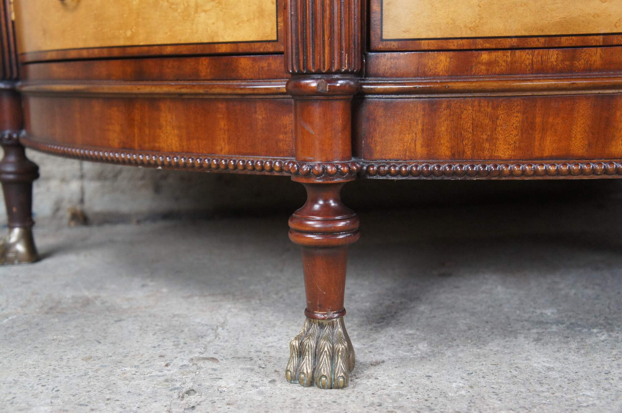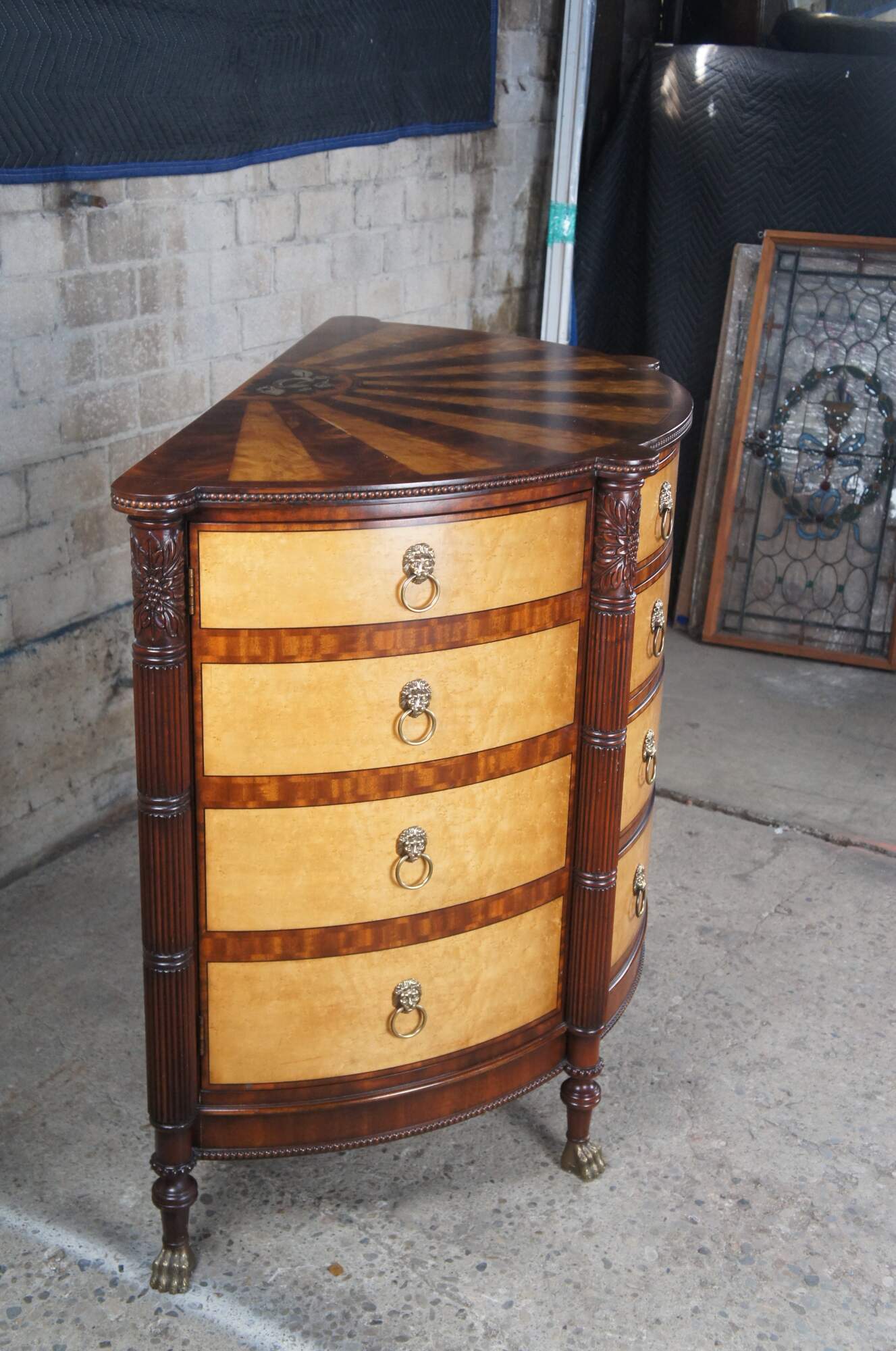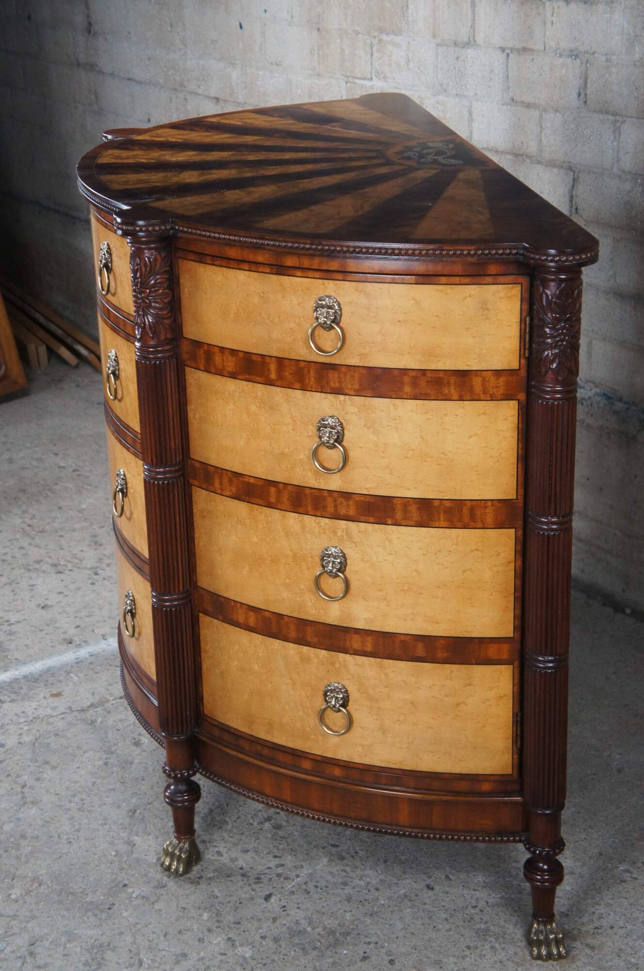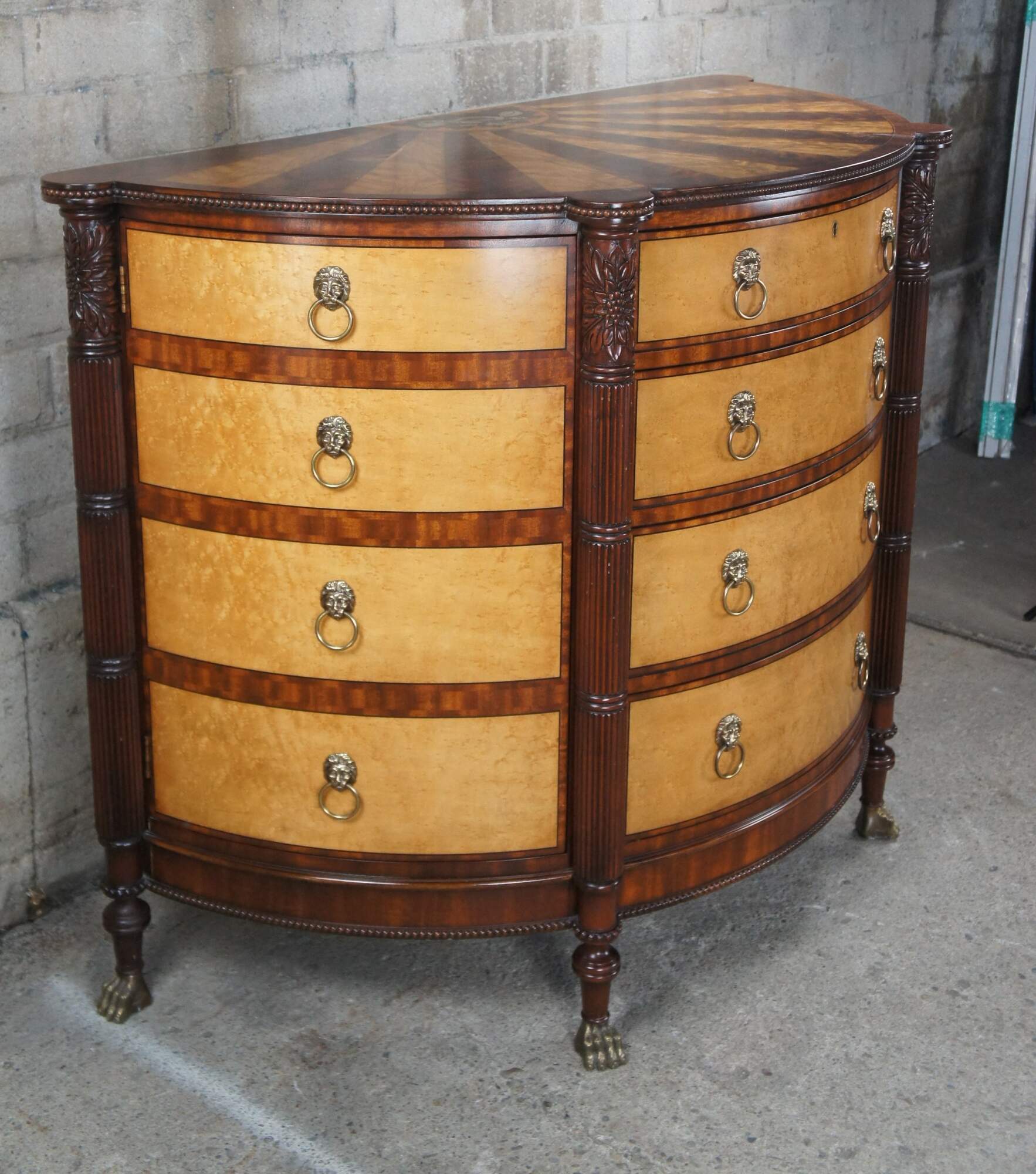 A rare and impressive commode by Harold Ionson. Made of birdseye maple, satinwood and Honduras mahogany, featuring a half round / bow front with four drawers, two side cabinets, brass paw / claw feet and supurb sunburst / starburst top with nautical sea shell and cartusche theme. Includes silverwear insert by EJ Victor.