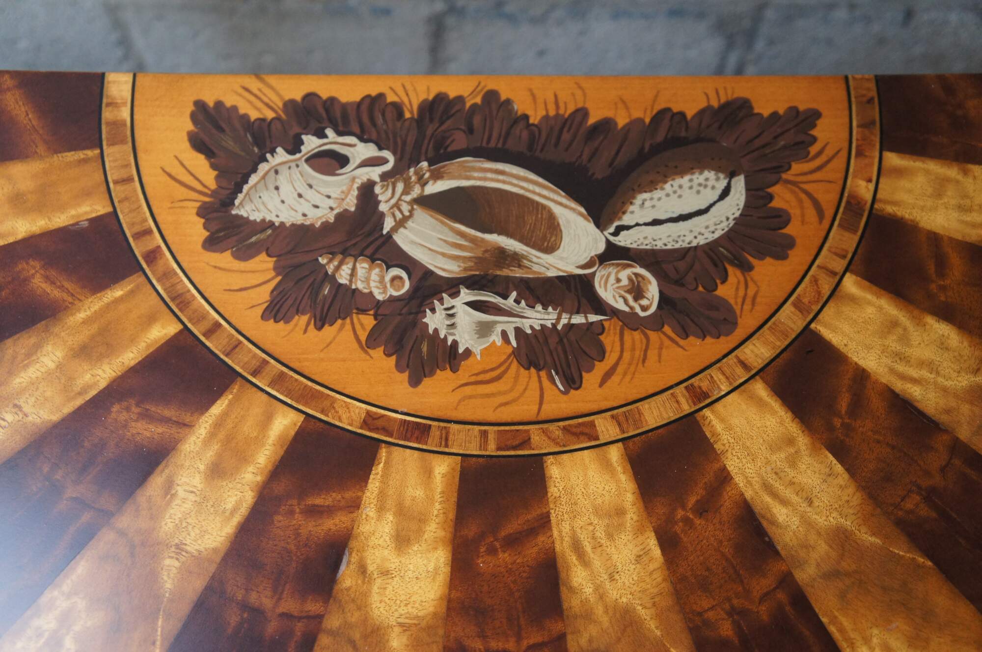 The top of the re-created commode features a sunburst of alternating mahogany and satinwood veneers emanating from a lunette of shells painted in oil by Jonathan L. Fairbanks, curator emeritus, Museum of Fine Arts, Boston; Fairbanks replicated the original by John Ritto Penniman (1782–1841). Courtesy of Harold Ionson.