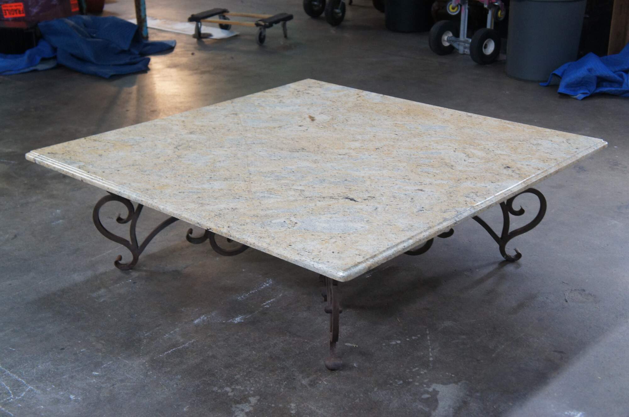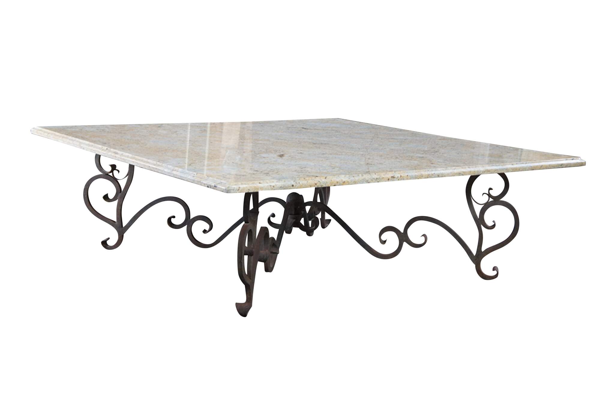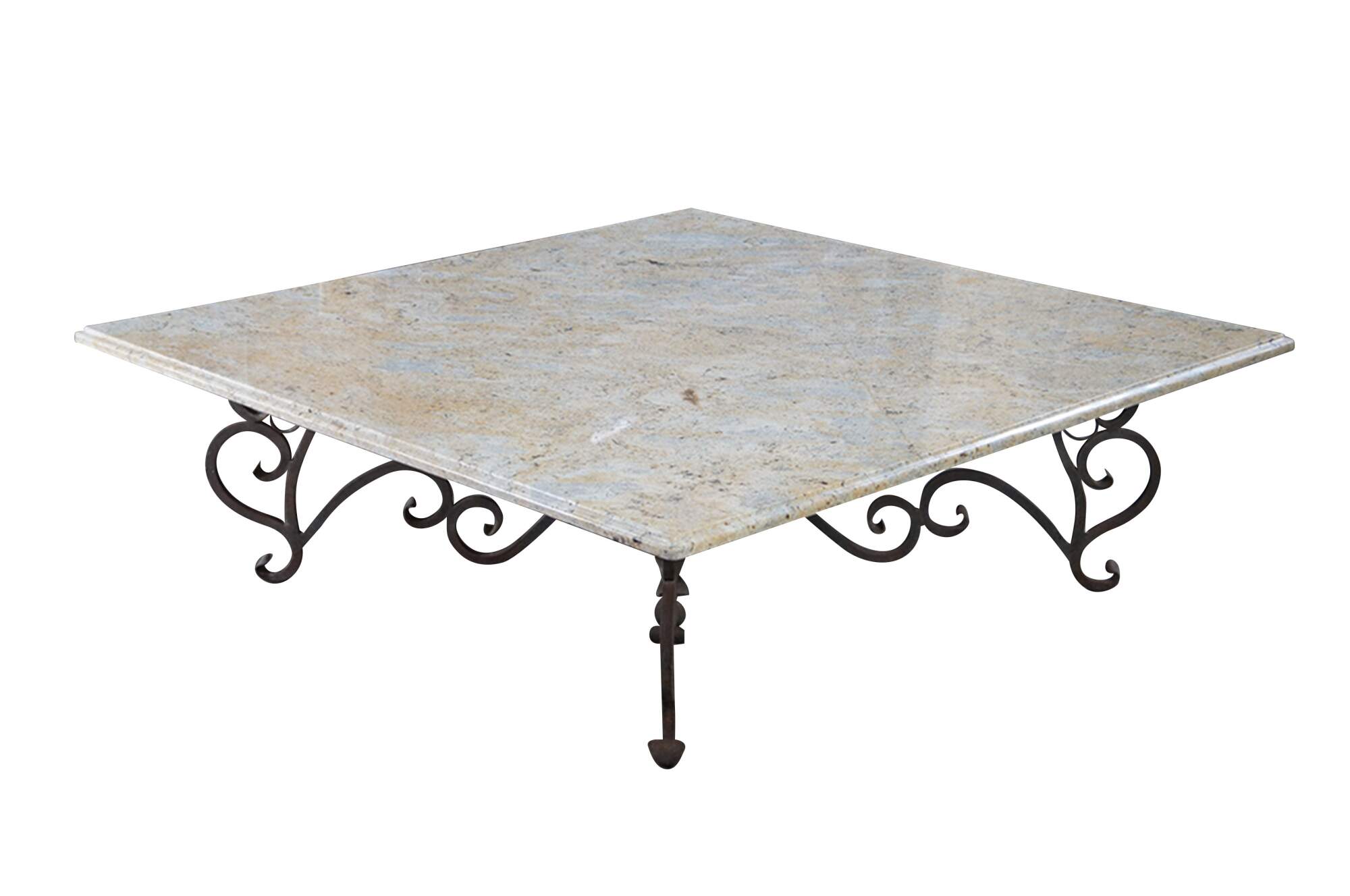 A large and impressive coffee table featuring square form with French scrolled / serpentine wrought iron base and heavy Granite stone top with beveled edge. Very heavy.