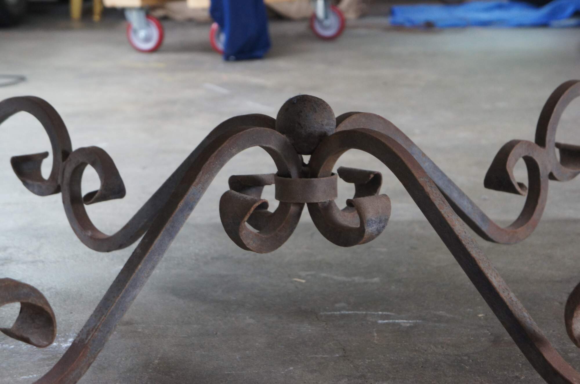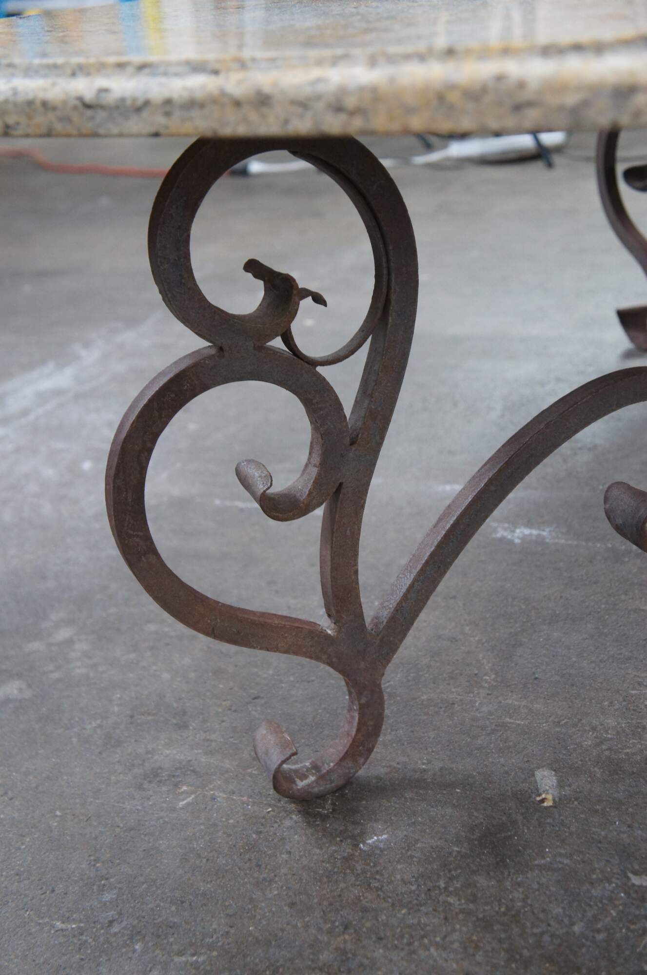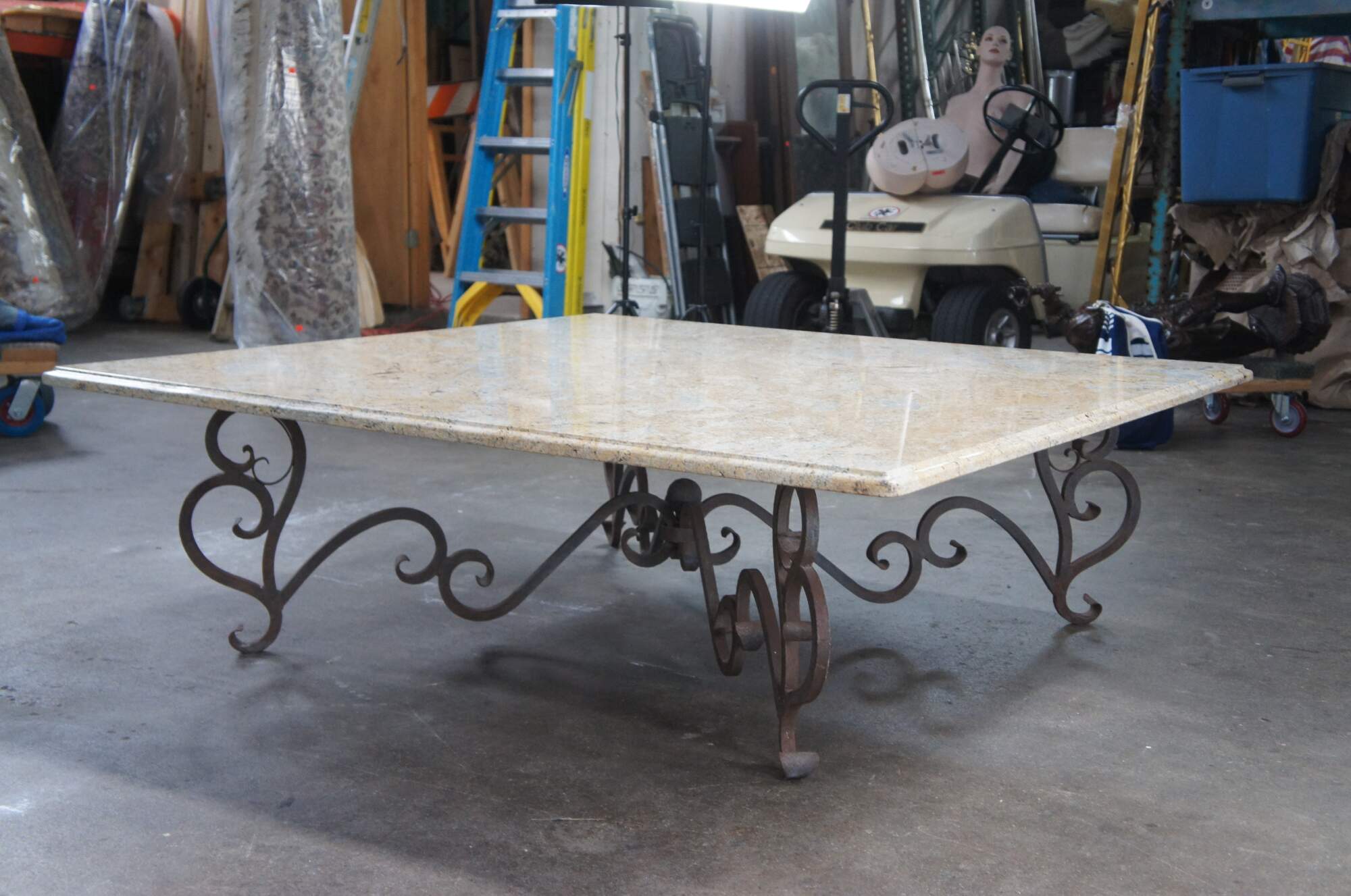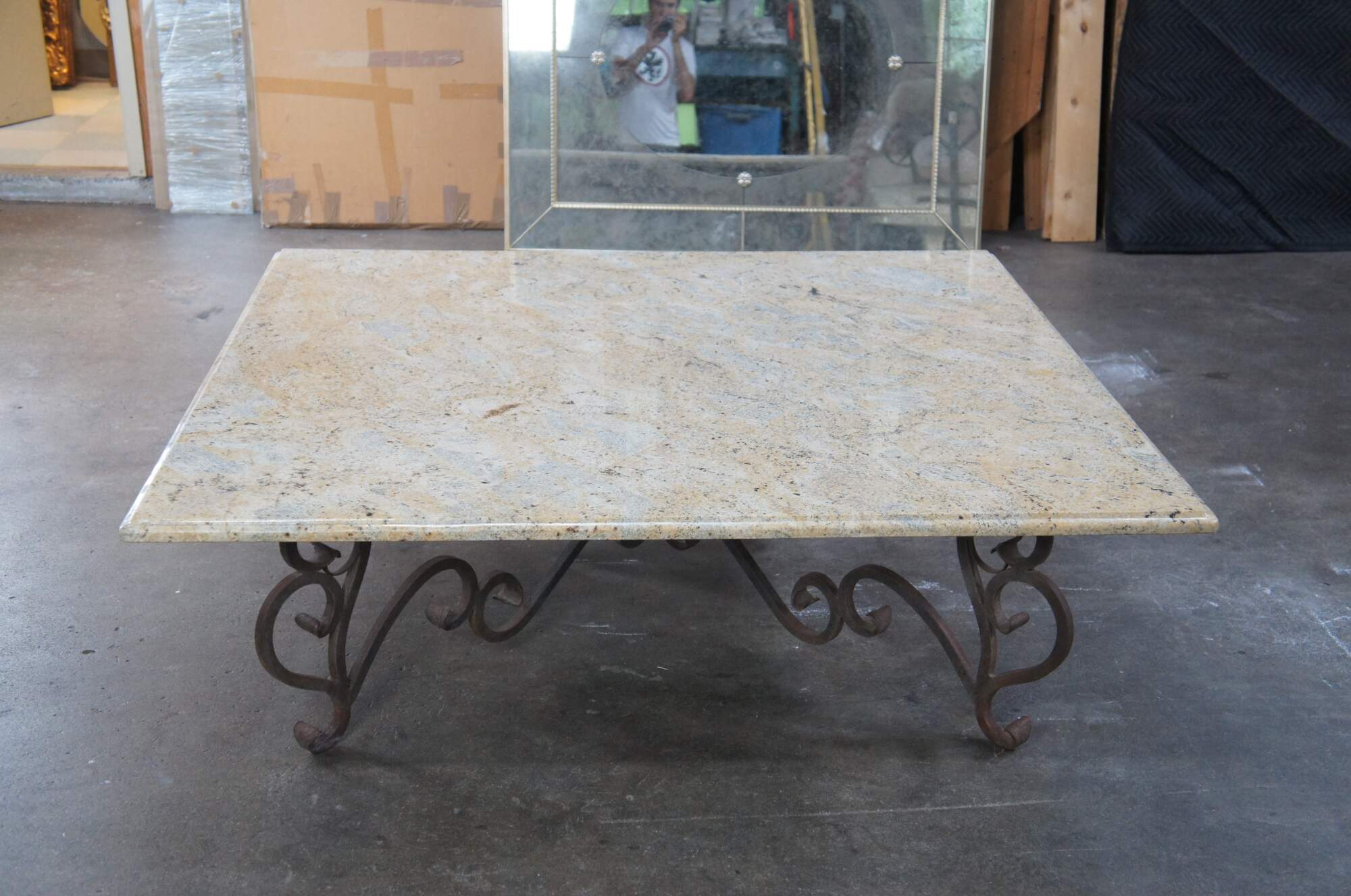 A large and impressive coffee table featuring square form with French scrolled / serpentine wrought iron base and heavy Granite stone top with beveled edge. Very heavy.