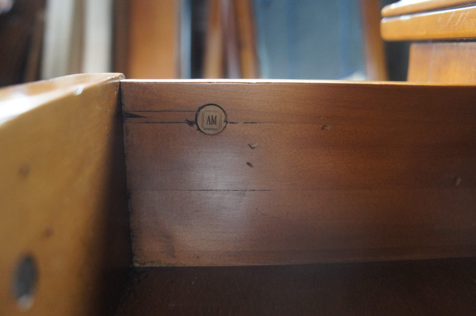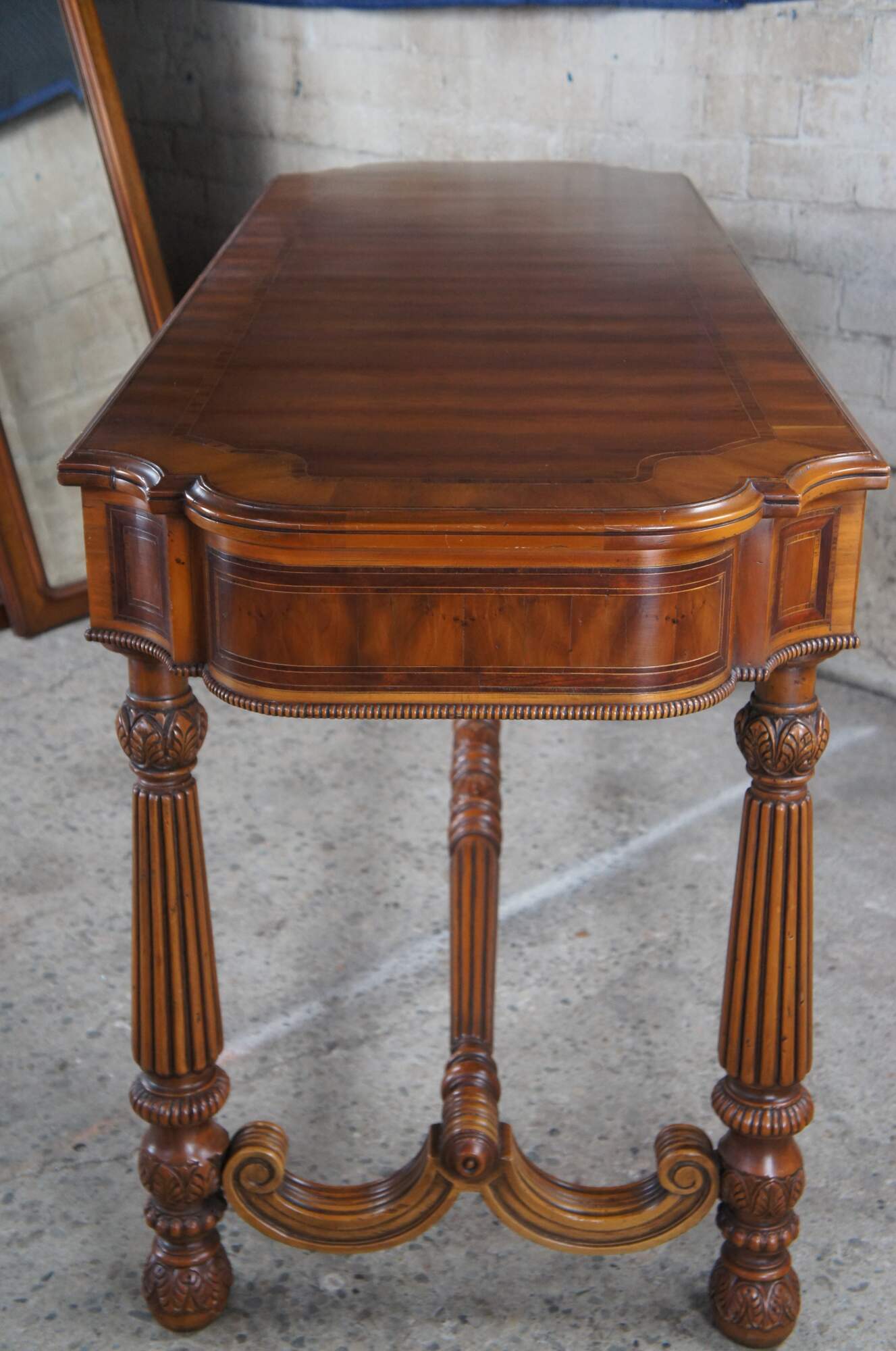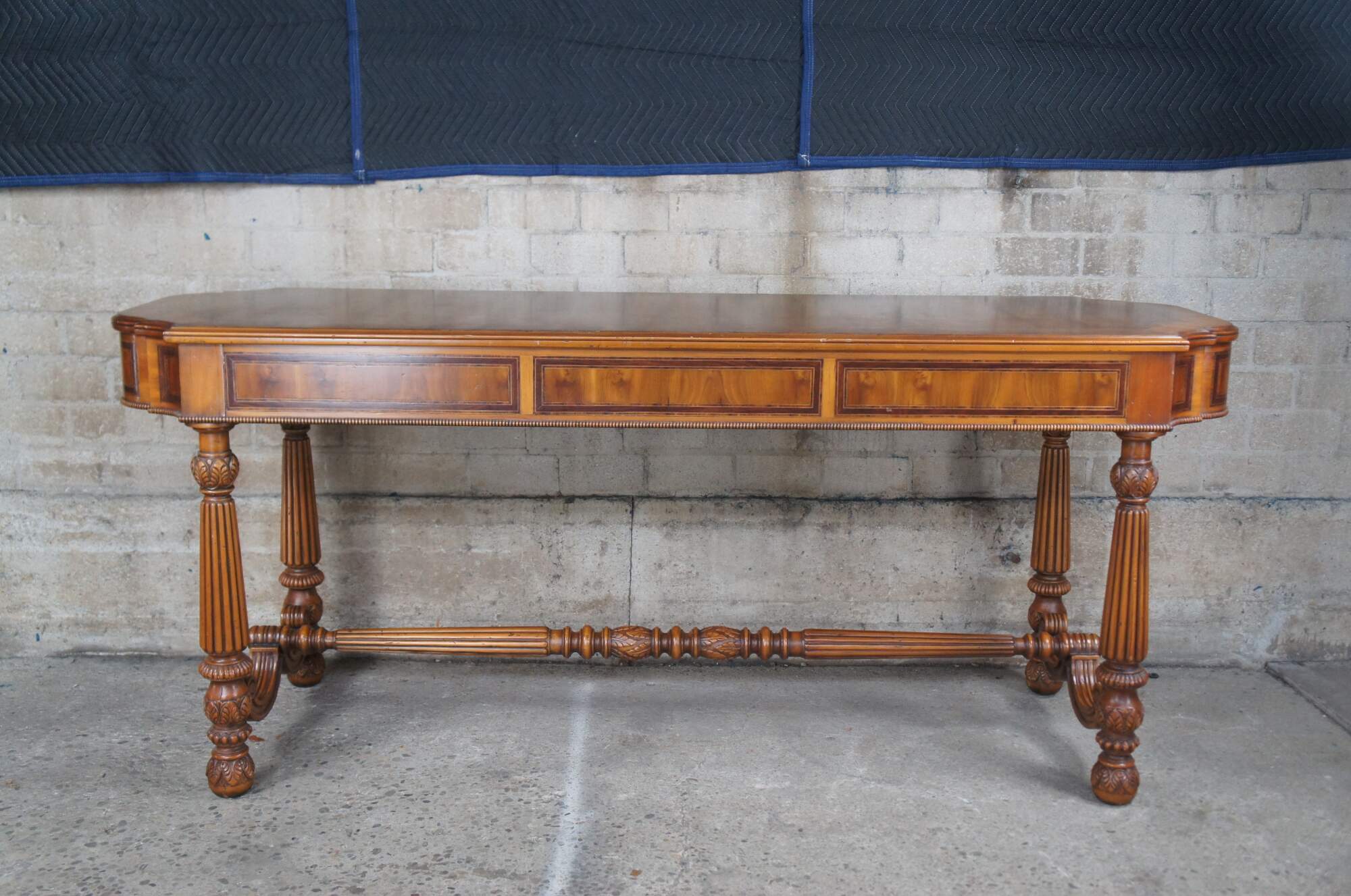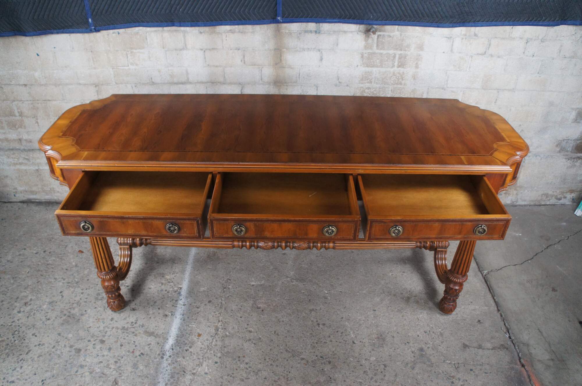 A distinctive oval-shaped, matched-booked top with delicate inlay and scalloped ends, three drawers with brass pulls, fluted legs ending in ball feet and a fluted and turned stretcher. The handcrafted finish on this piece, for which Alfonso Marina is renown, has the warm, distinctive patina of an antique sideboard.