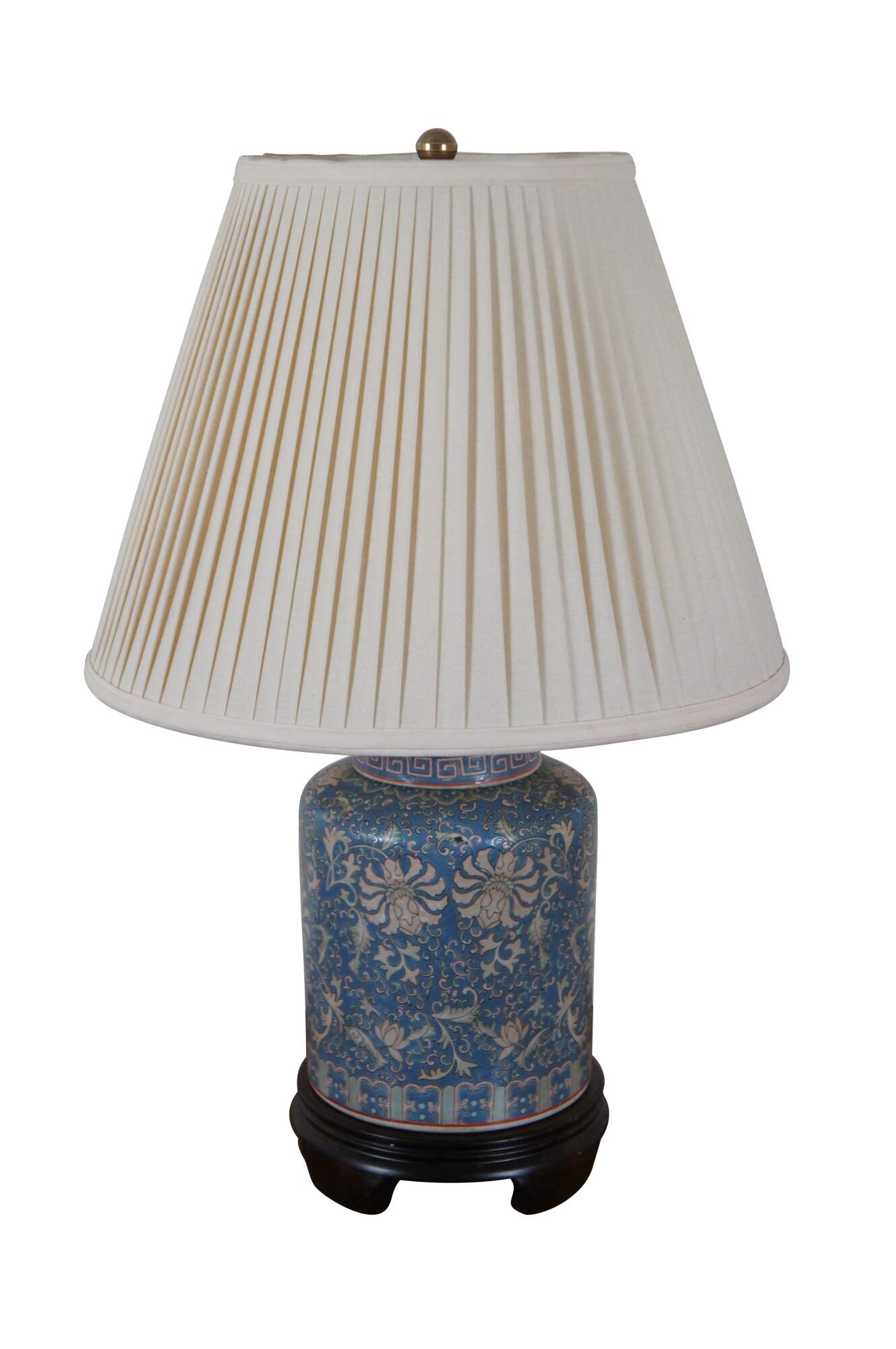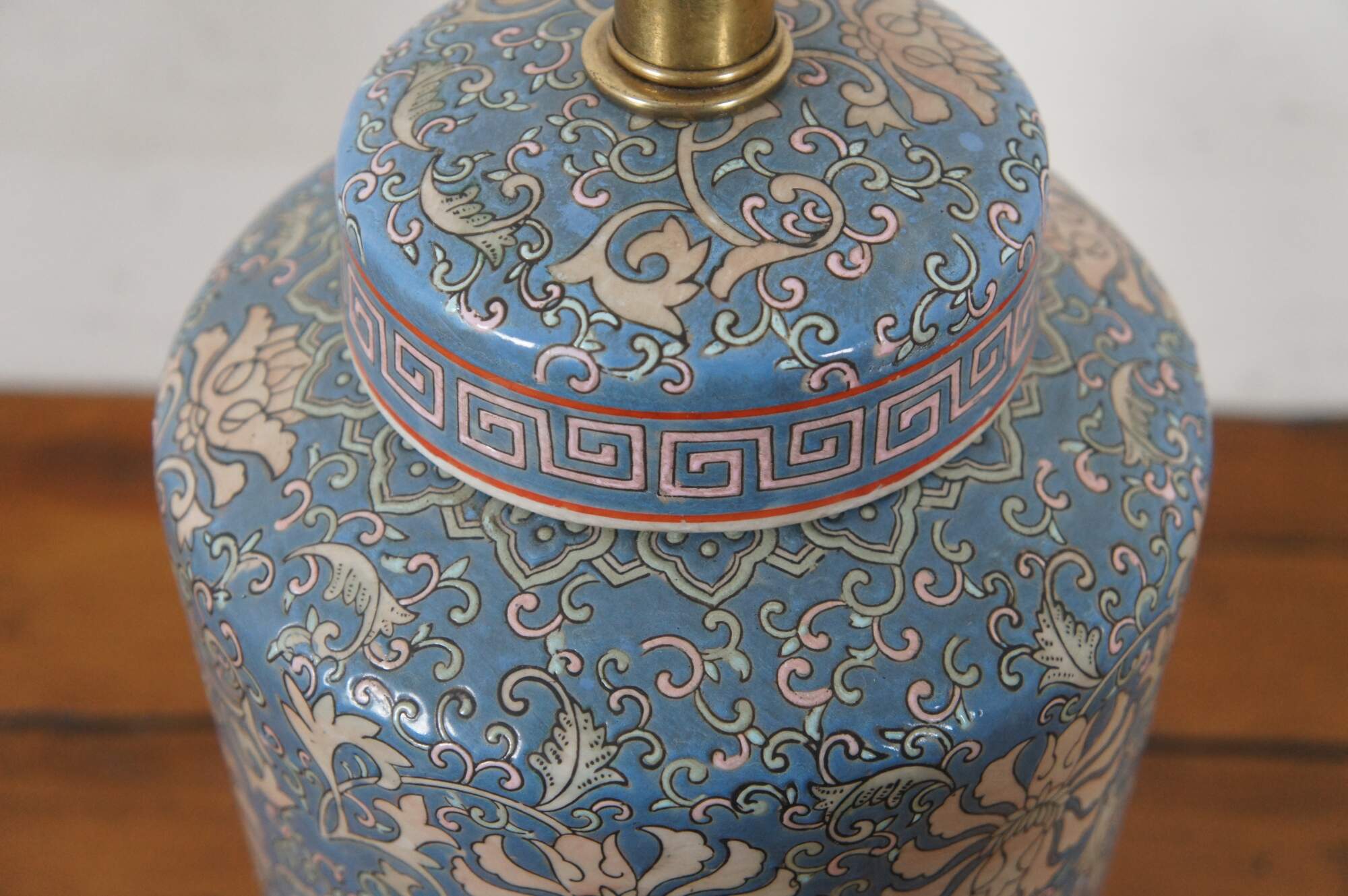 Vintage Chinoiserie famille rose porcelain ginger jar / vase / tea caddy table lamp by Frederick Copper, featuring a floral Chrysanthemum design in blue and pink with Greek Key pattern lid, dark wooden base, and round brass finial. Includes round, off white, pleated fabric shade.