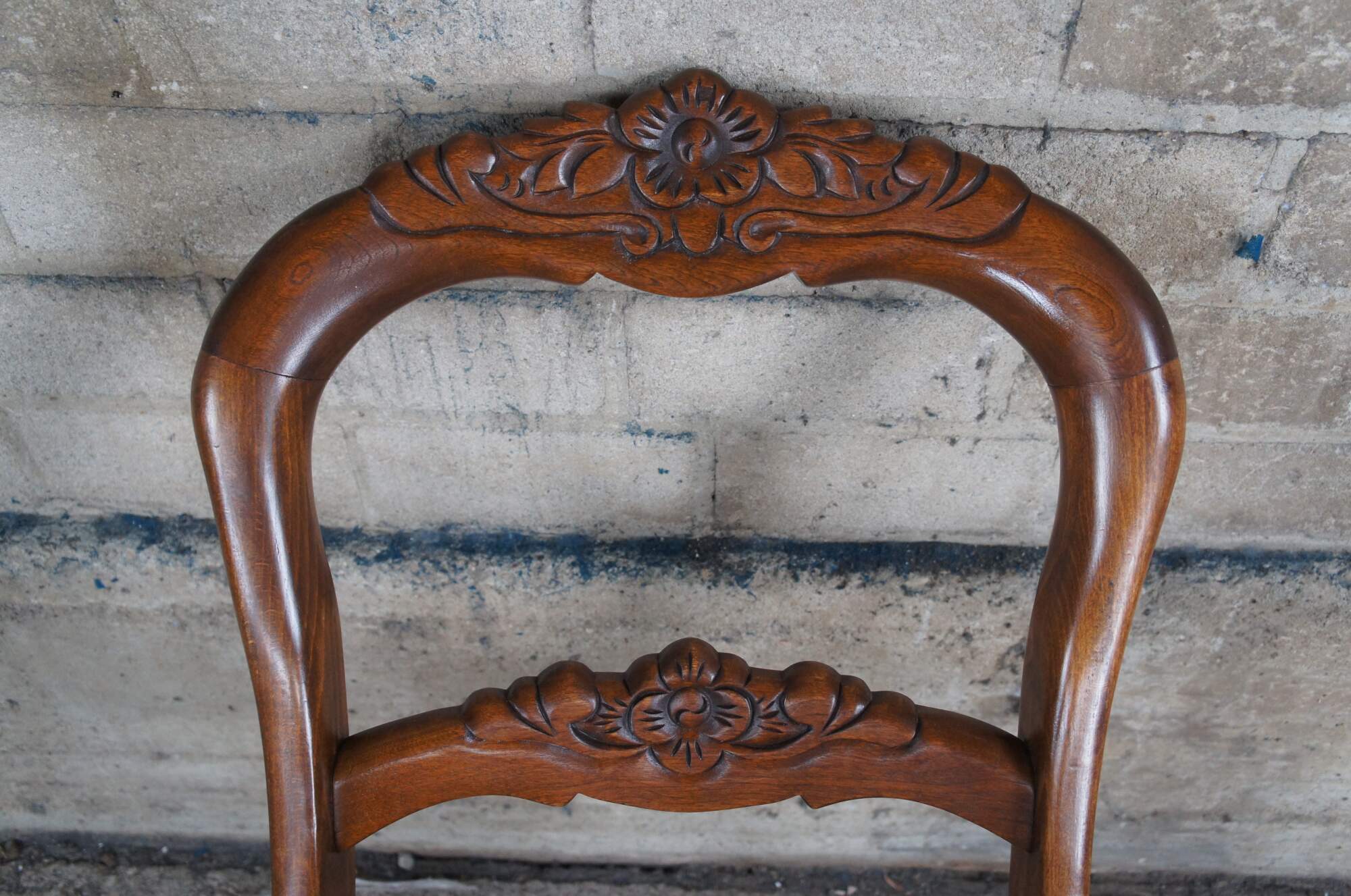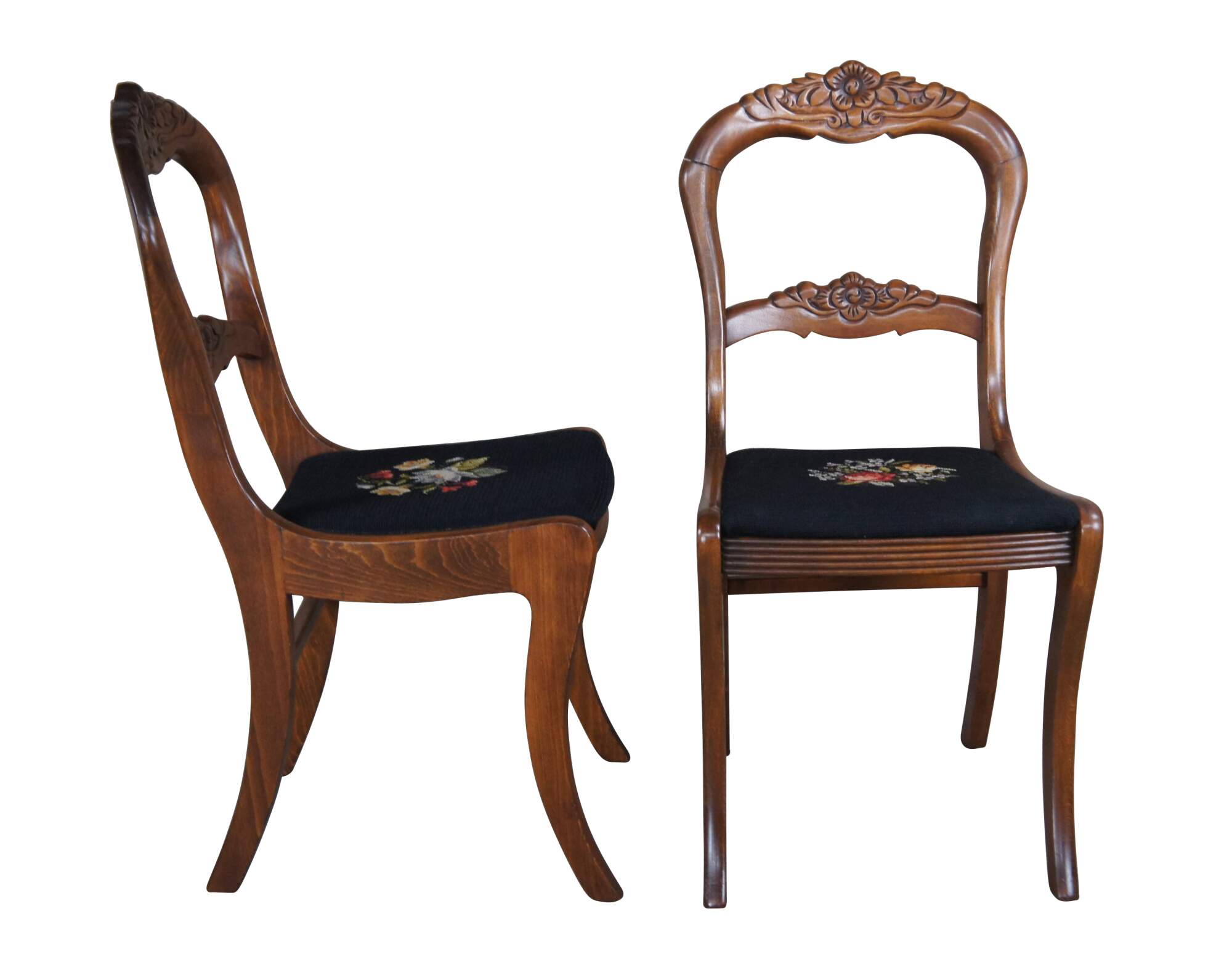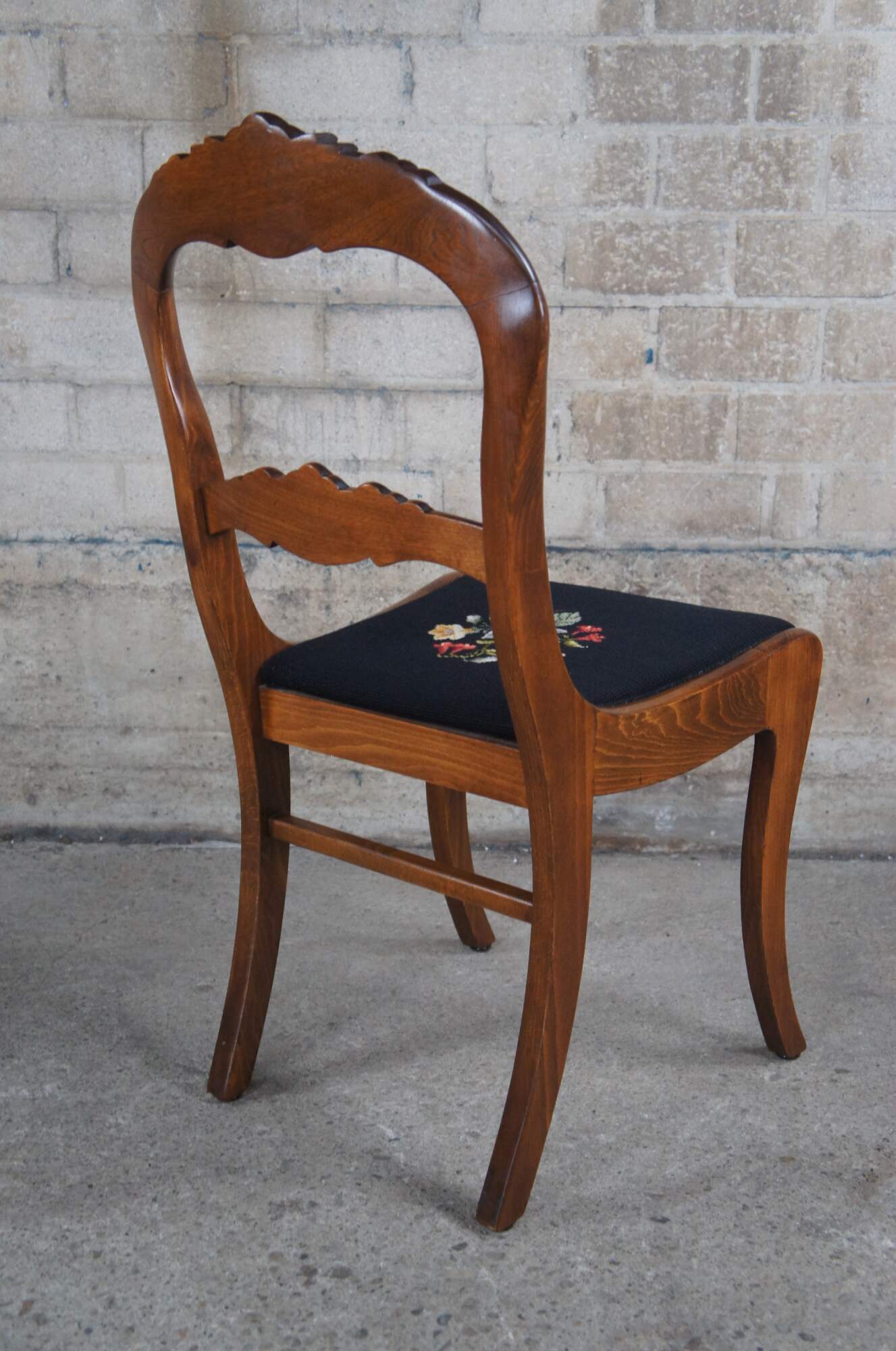 Six 1940s Tell City Duncan Phyfe / Balloon back style dining chairs. Made of mahogany featuring carved floral design with black needlepoint seats. Pattern 4563.
