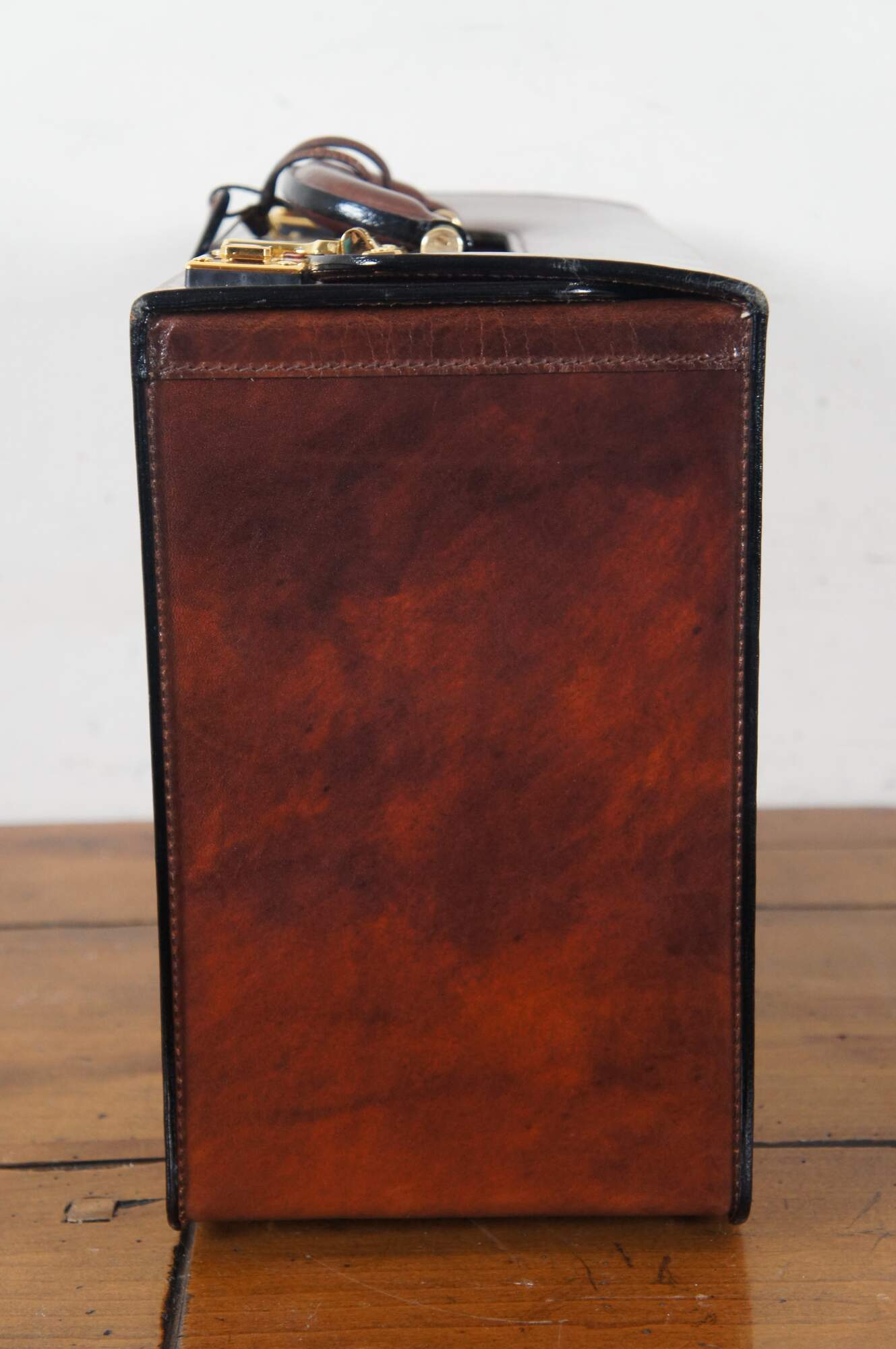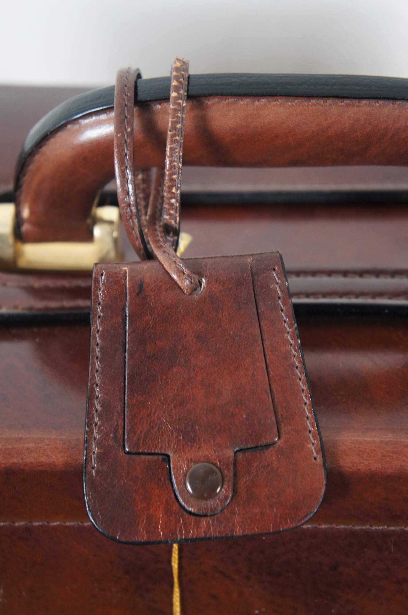 Vintage mottled brown leather brief case / document case featuring brass feet, single handle, overlapping flap top, and double latches with Presto Top Change combination locks (currently set to default 000). Interior features three divided sections and one pocket with zipper closure. Includes luggage tag.