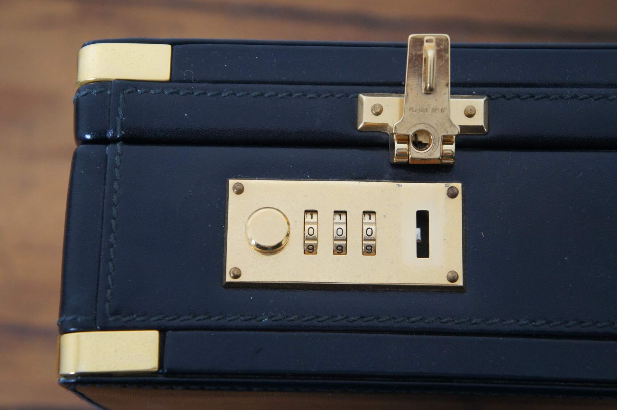 Vintage Bally black leather briefcase. Features single handle, brass feet, capped corners, and double latches with combination locks (currently set at default 000). Interior features beige suede lining, small slip pocket with removable ID card holder, attached wallet with slots for six cards and snap closure, two medium slip pockets, and two document compartments with latching strap. Includes luggage tag. Made in Italy. Original Price $700 circa 1983.