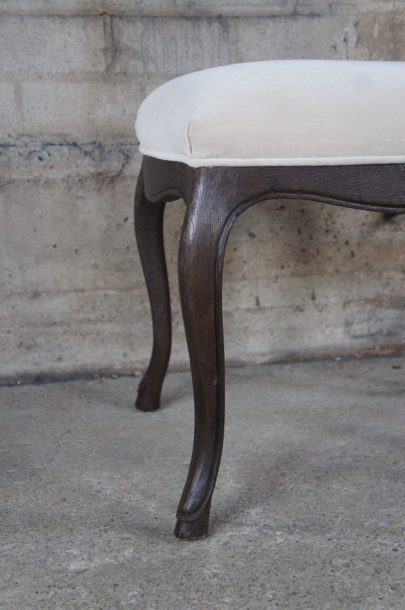 Ten Restoration Hardware French Louis XVI style dining chairs. Features a square back with velour / velvet upholstery and serpentine cabriole legs with hoof foot.