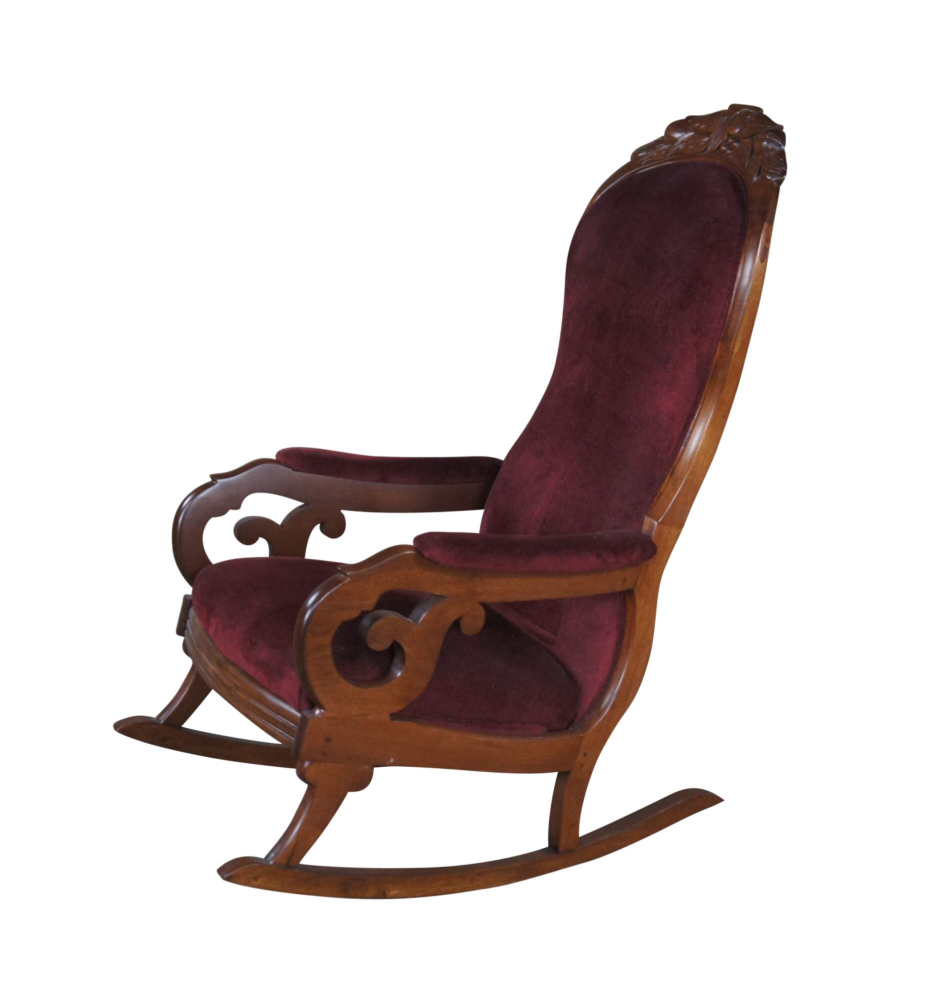 Antique Victorian Aesthetic movement rocking armchair. Made of walnut featuring serpentine form with velvet / velour upholstery, padded arms, and tall back carved with berry and leaf design.